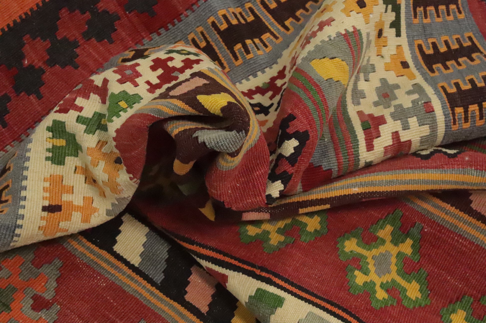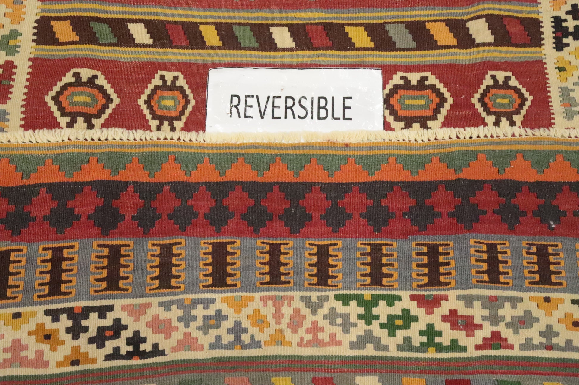 A Beautiful Genuine Persia ( Persia ) Kilim (Qashqai) rug is Hand Woven by skillful weavers in Persia ( Persia ) with 100% Wool Material. This rug is in Very Good (Abrash-Stain) condition. dimensions are 9' 4'' X 5' 1'' in foot and  284 X 155 in centimeter. the primary color is Oranges & Rust.