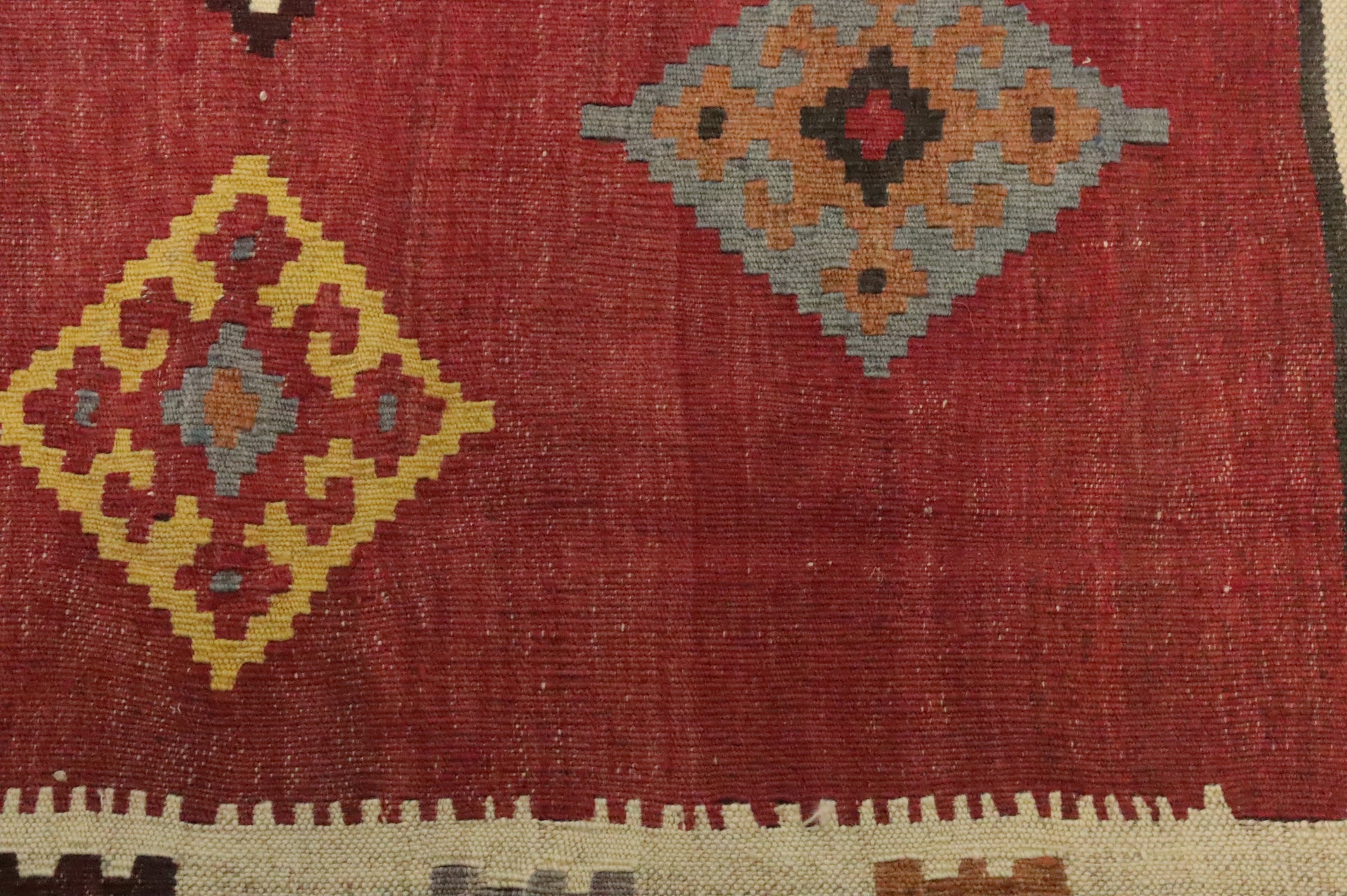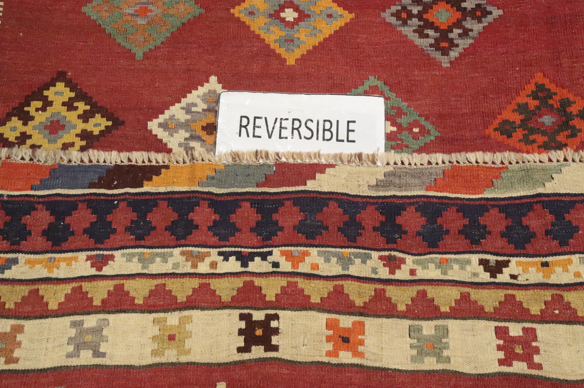 A Beautiful Genuine Persia ( Persia ) Kilim (Qashqai) rug is Hand Woven by skillful weavers in Persia ( Persia ) with 100% Wool Material. This rug is in Very Good (Abrash-Repair) condition. dimensions are 8' 10'' X 5' 2'' in foot and  269 X 157 in centimeter. the primary color is Oranges & Rust.