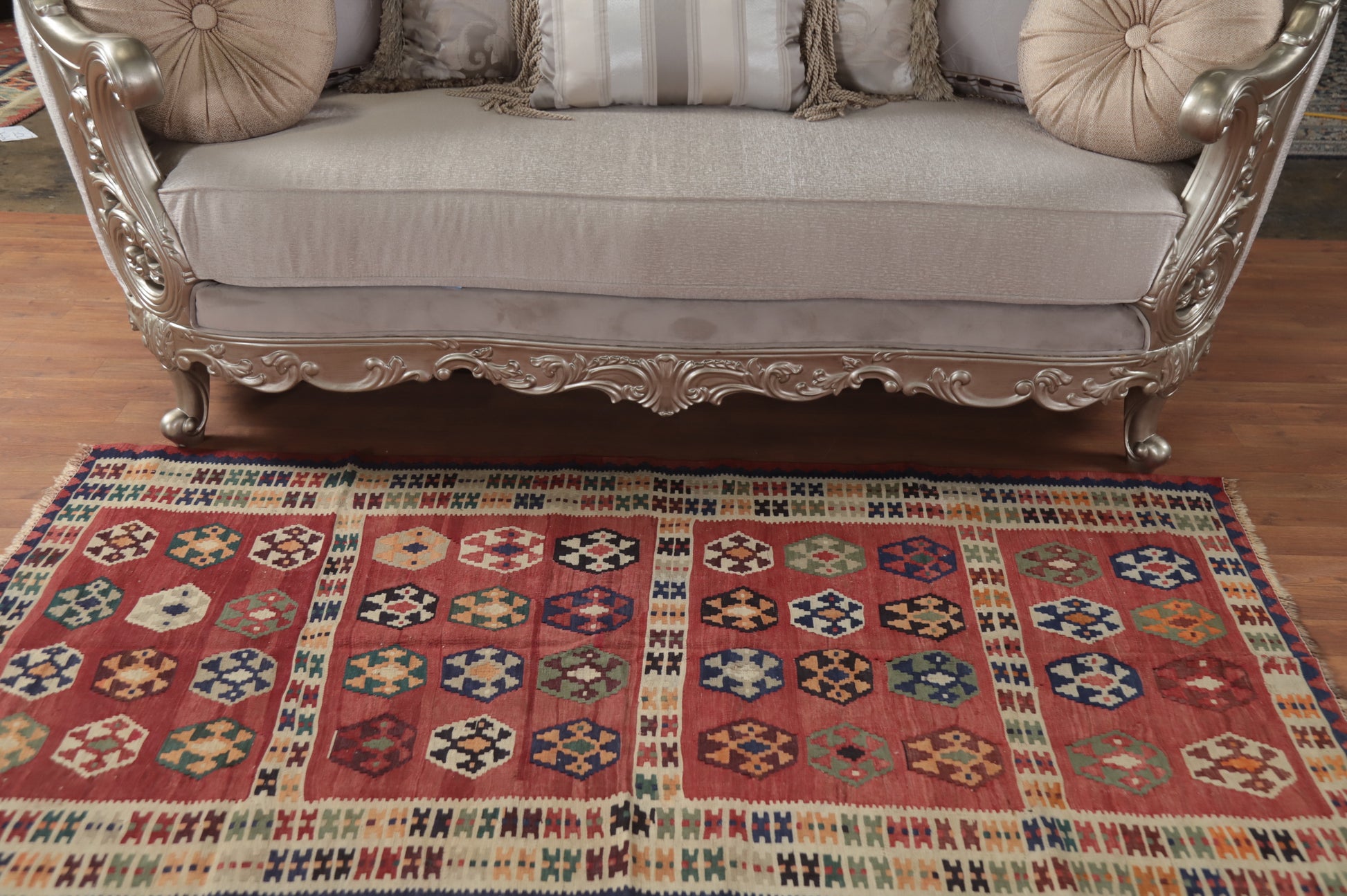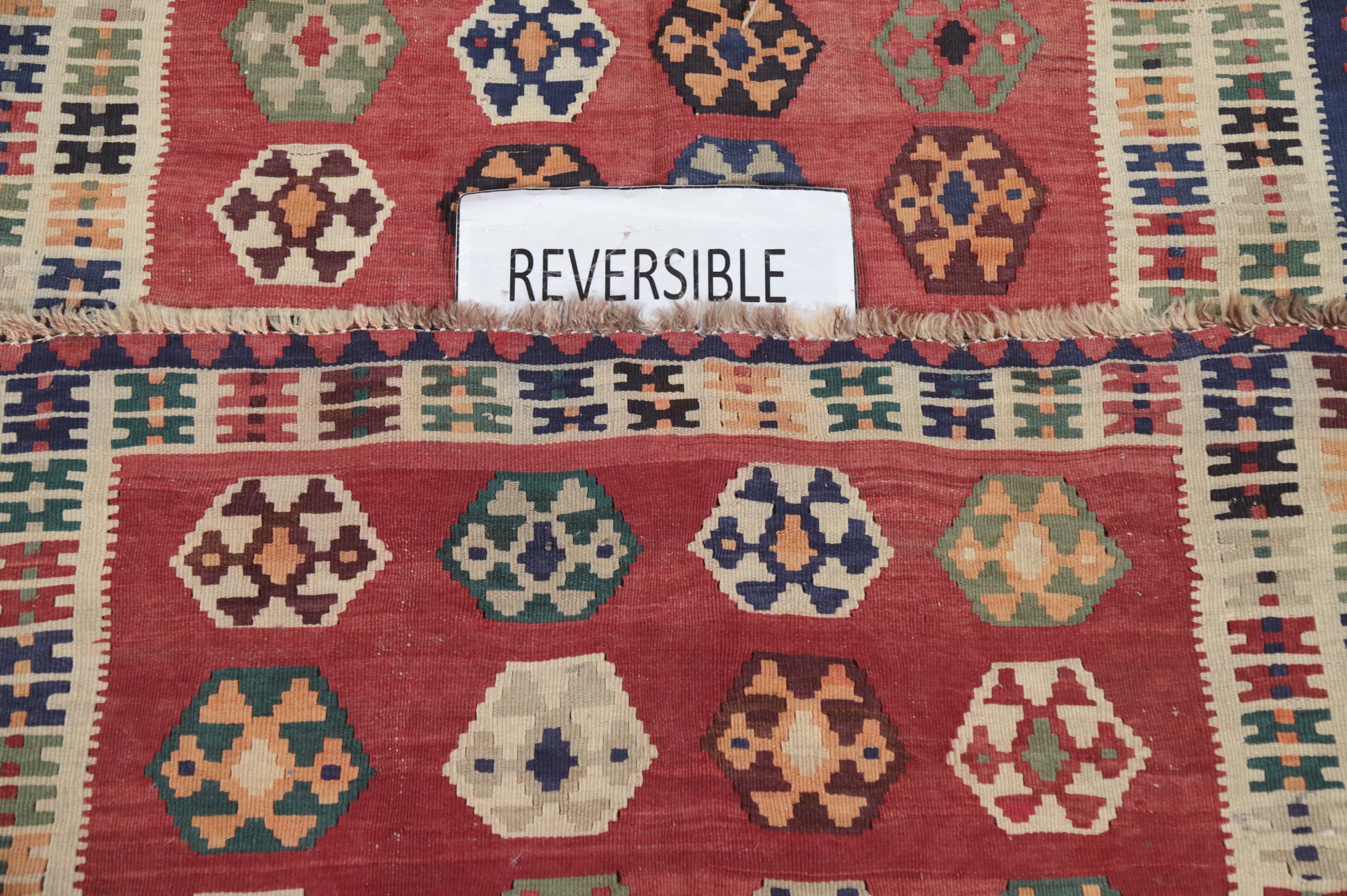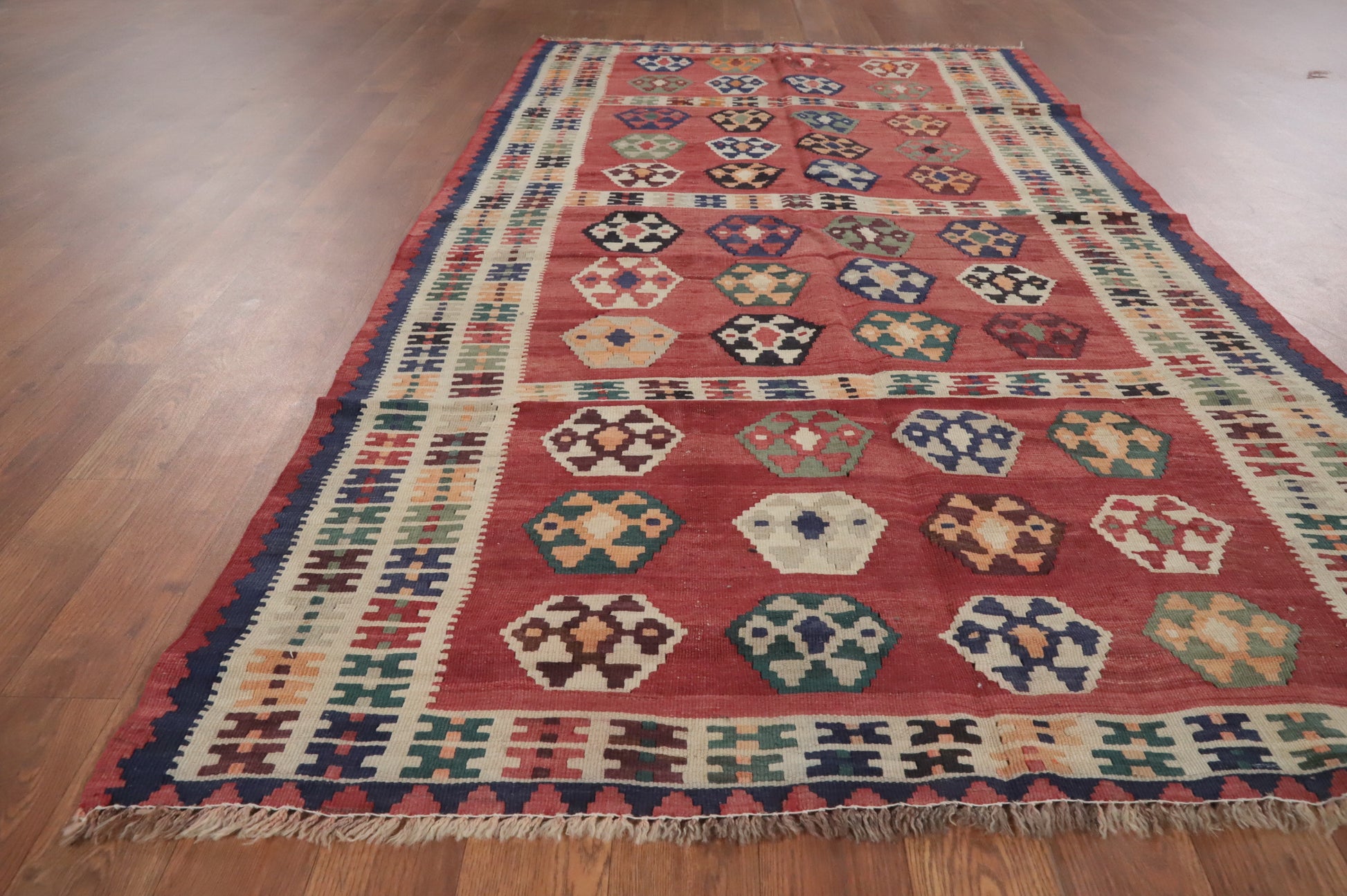 A Beautiful Genuine Persia ( Persia ) Kilim (Qashqai) rug is Hand Woven by skillful weavers in Persia ( Persia ) with 100% Wool Material. This rug is in Very Good (Abrash) condition. dimensions are 6' 2'' X 3' 4'' in foot and 188 X 102 in centimeter. the primary color is Red.