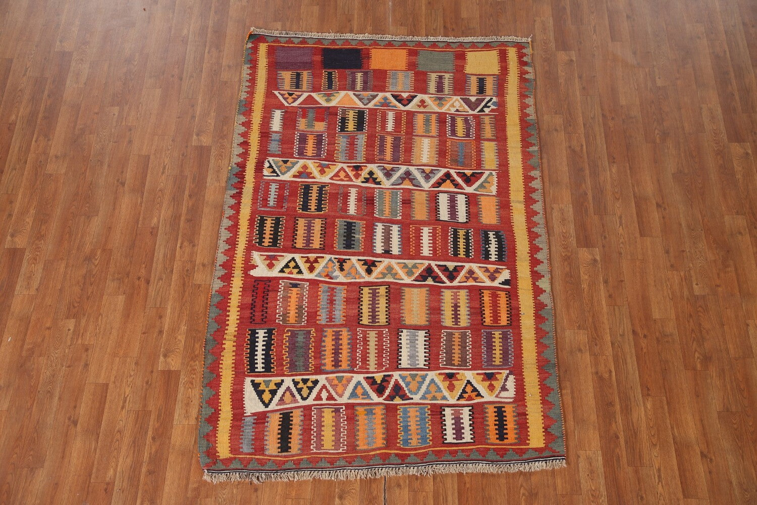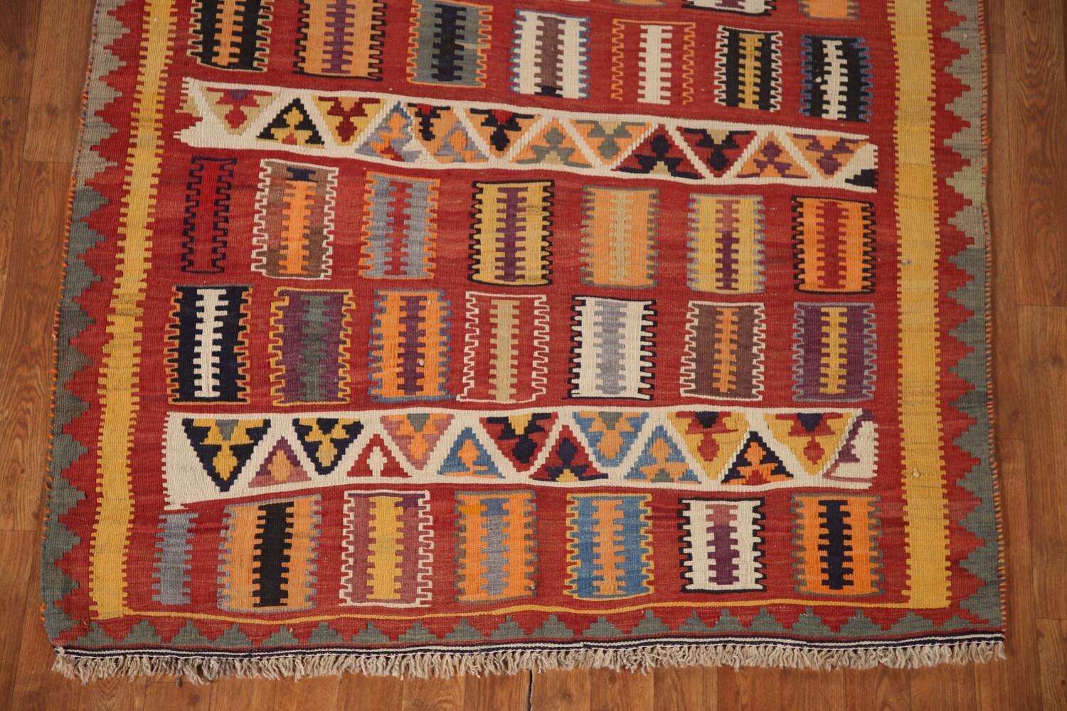 A Beautiful Genuine Persia ( Persia ) Kilim (Qashqai) rug is Hand Woven by skillful weavers in Persia ( Persia ) with 100% Wool Material. This rug is in Very Good condition. dimensions are 6' 4'' X 4' 3'' in foot and 193 X 130 in centimeter. the primary color is Red.