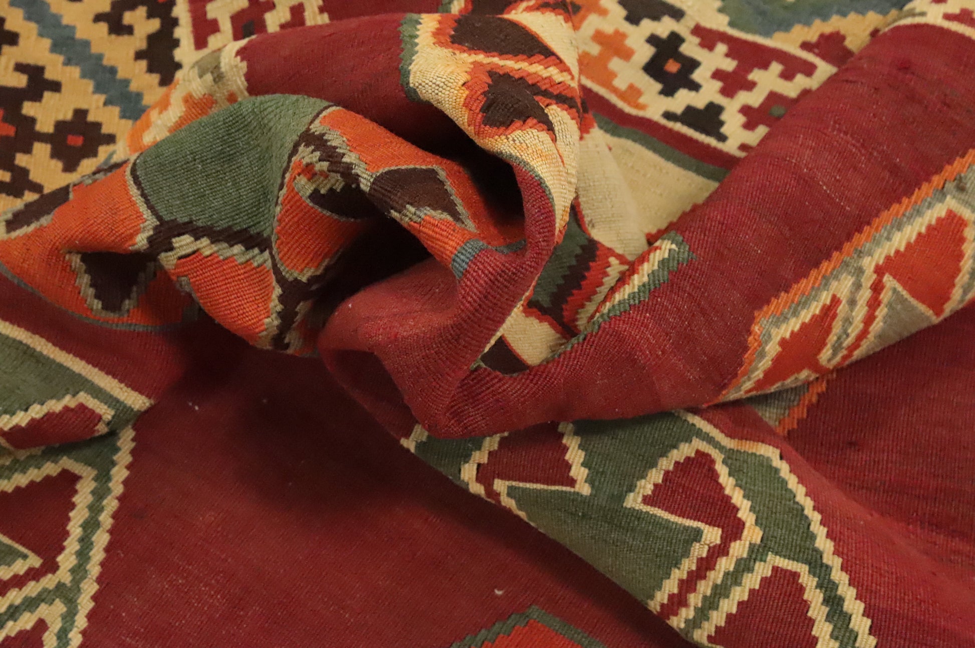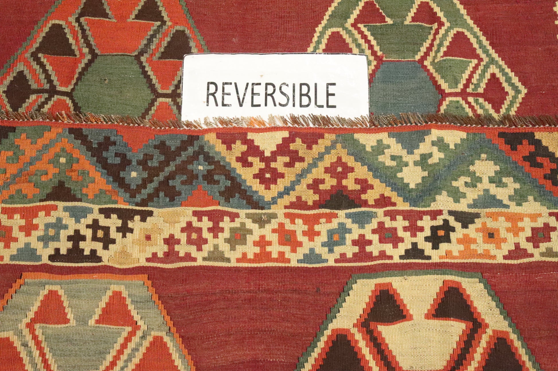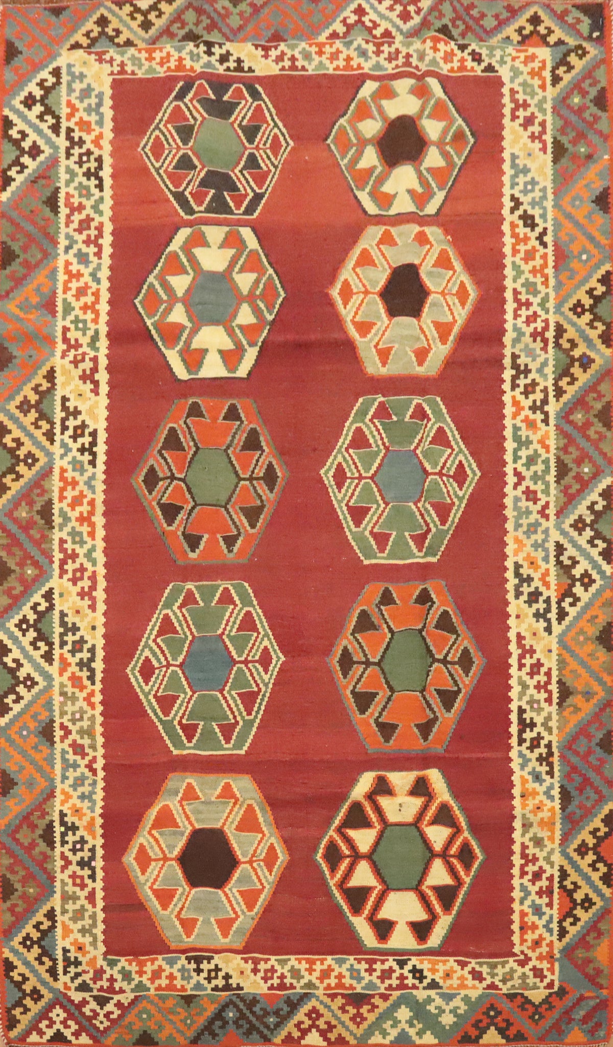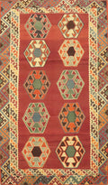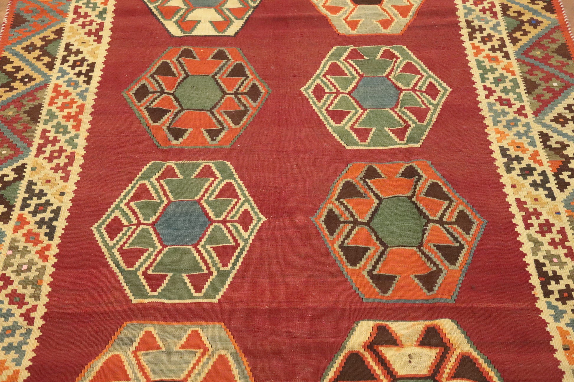 A Beautiful Genuine Persia ( Persia ) Kilim (Qashqai) rug is Hand Woven by skillful weavers in Persia ( Persia ) with 100% Wool Material. This rug is in Very Good (Abrash) condition. dimensions are 7' 1'' X 4' 4'' in foot and  216 X 132 in centimeter. the primary color is Oranges & Rust.