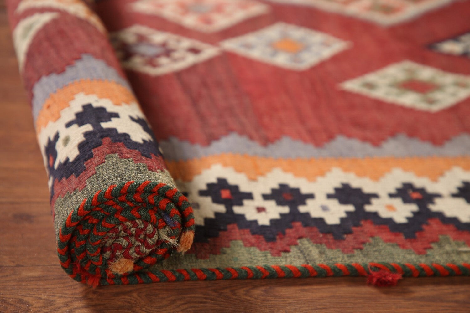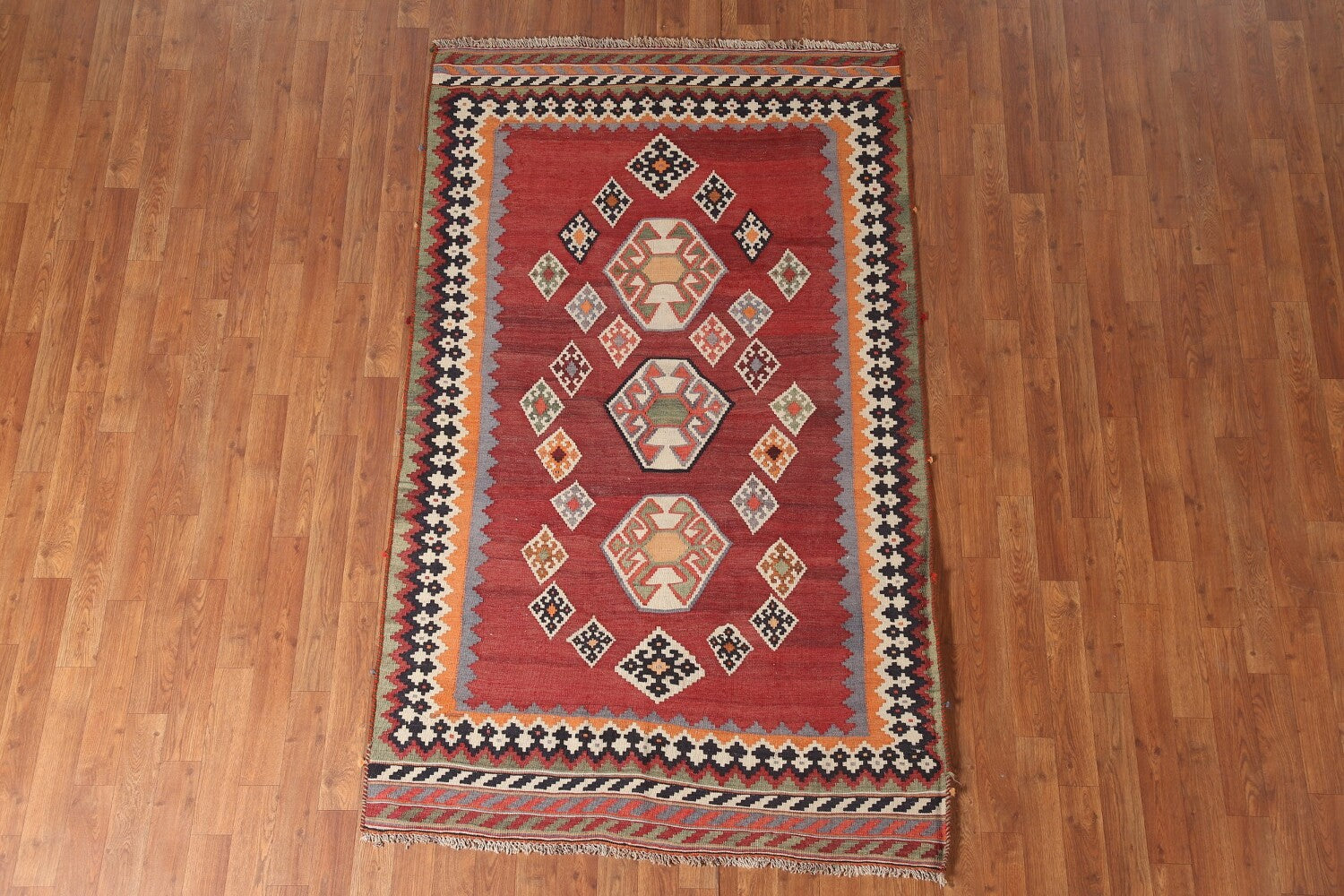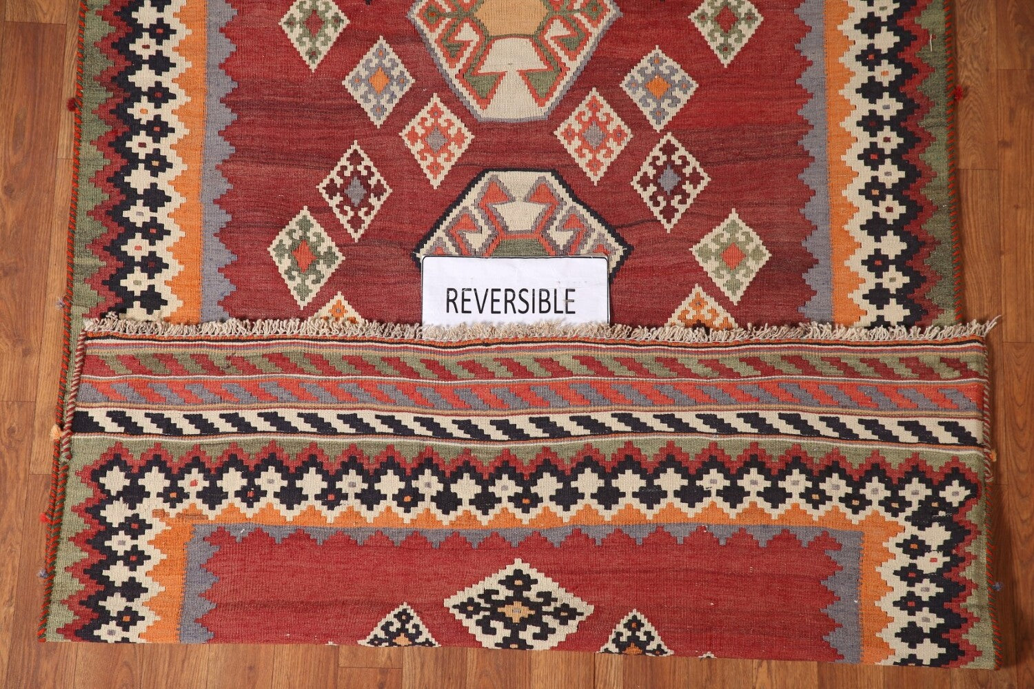A Beautiful Genuine Persia ( Persia ) Kilim (Qashqai) rug is Hand Woven by skillful weavers in Persia ( Persia ) with 100% Wool Material. This rug is in New, First Quality condition. dimensions are 6' 8'' X 4' 1'' in foot and 203 X 124 in centimeter. the primary color is Red.