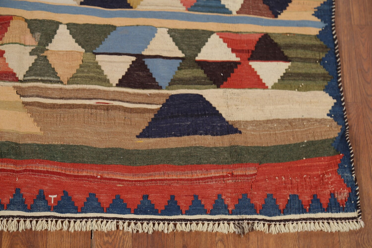 A Beautiful Genuine Persia ( Persia ) Kilim (Qashqai) rug is Hand Woven by skillful weavers in Persia ( Persia ) with 100% Wool Material. This rug is in Very Good condition. dimensions are 6' 11'' X 4' 6'' in foot and 211 X 137 in centimeter. the primary color is Multi-Colored.