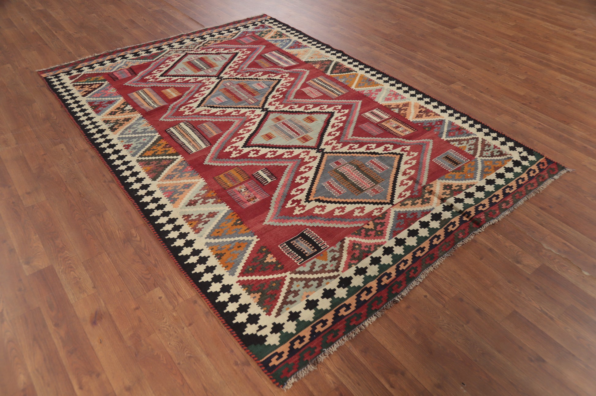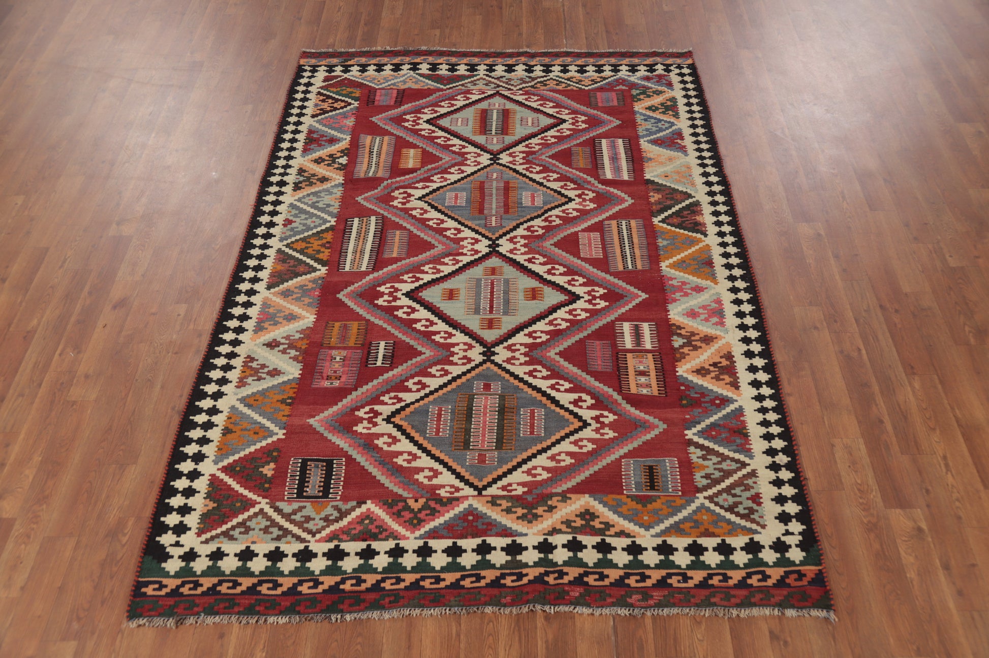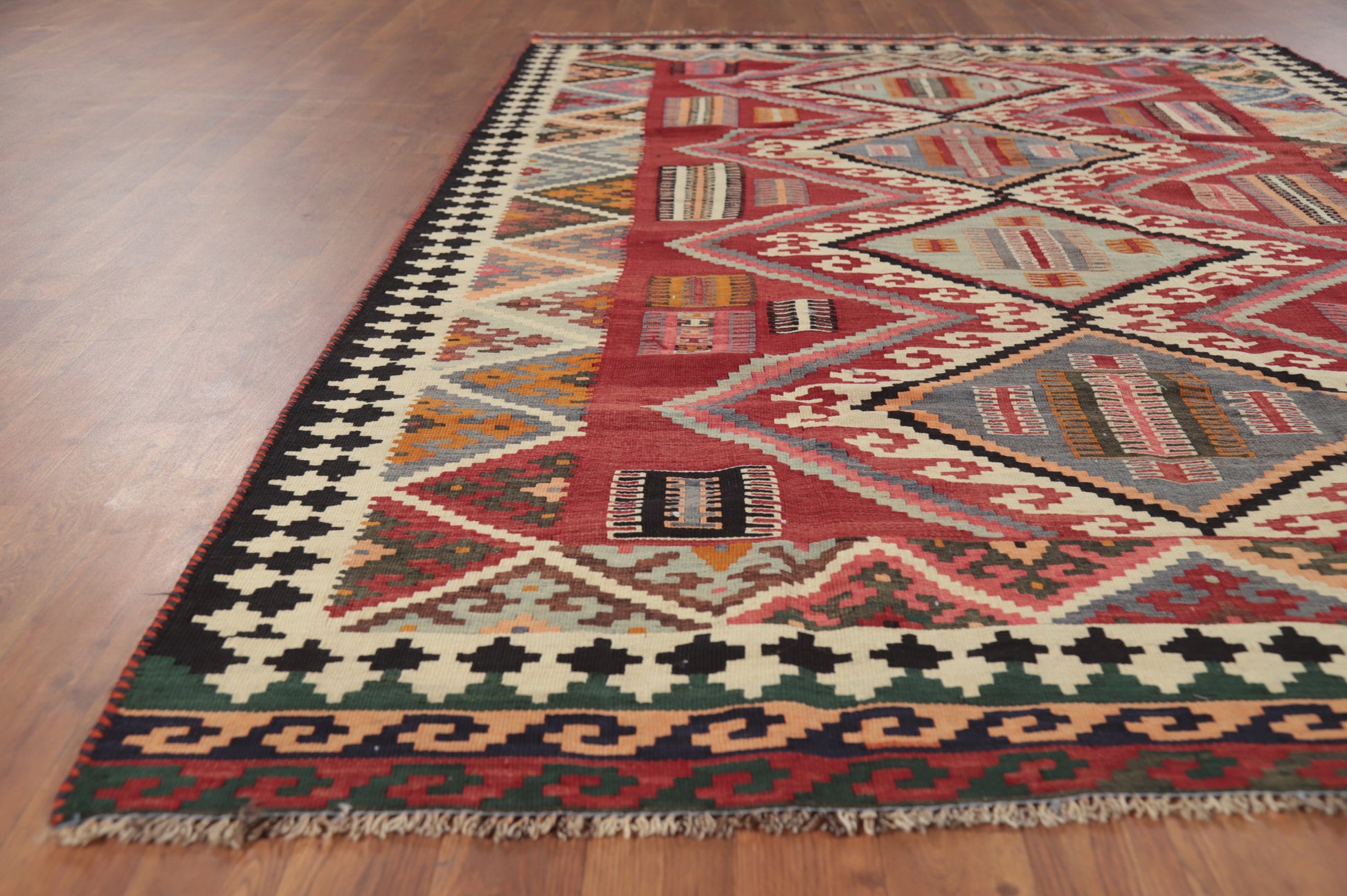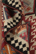 A Beautiful Genuine Persia ( Persia ) Kilim (Qashqai) rug is Hand Woven by skillful weavers in Persia ( Persia ) with 100% Wool Material. This rug is in Very Good condition. dimensions are 7' 5'' X 5' 2'' in foot and 226 X 157 in centimeter. the primary color is Red.
