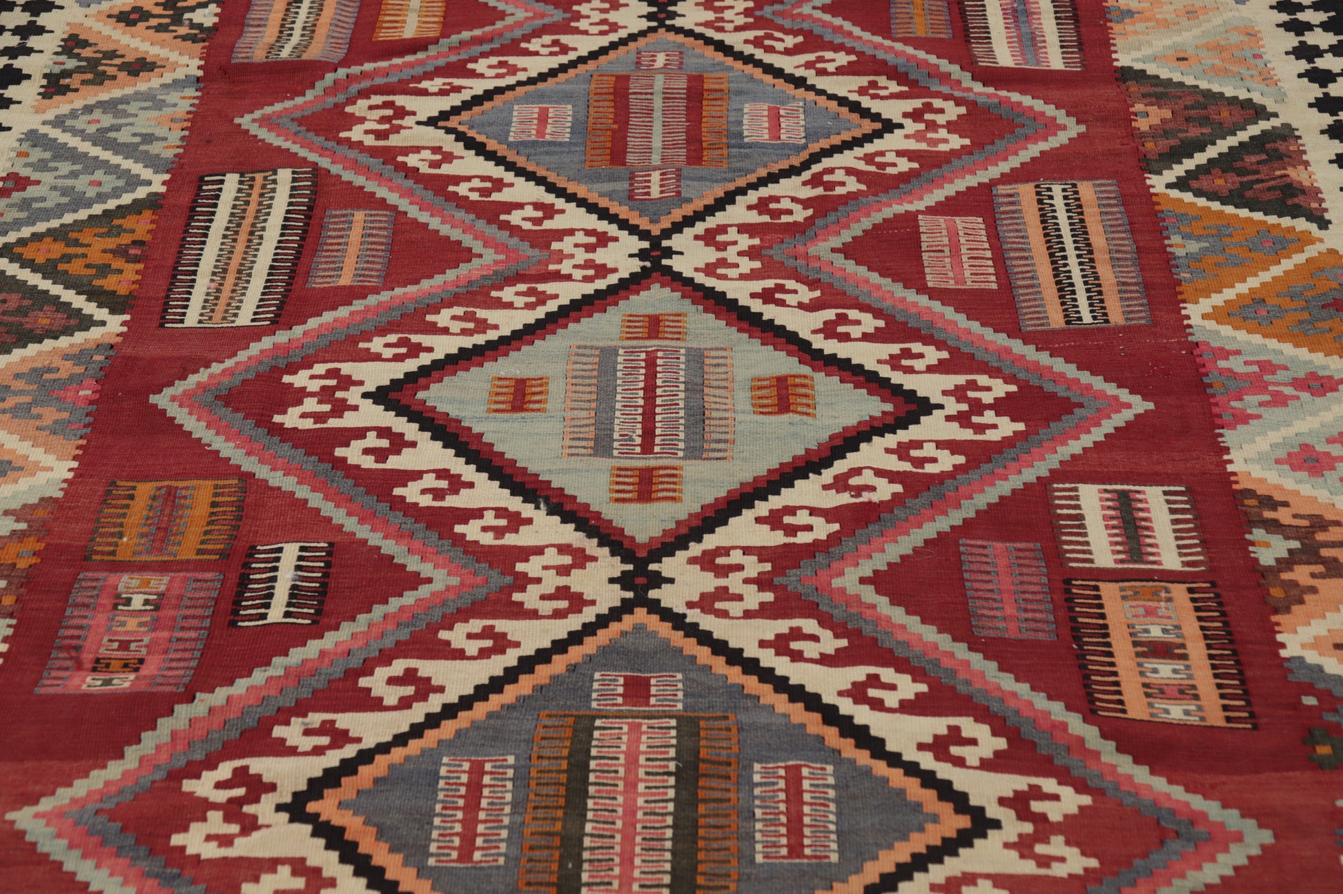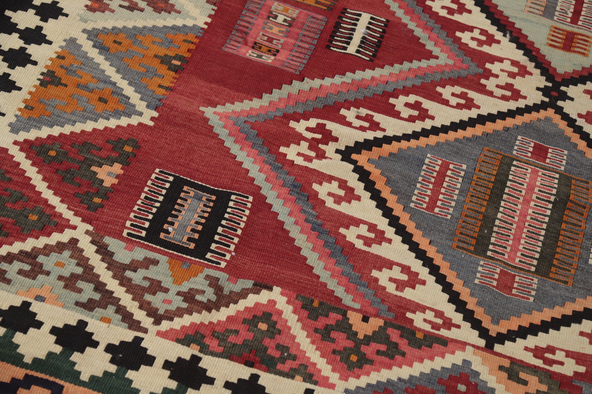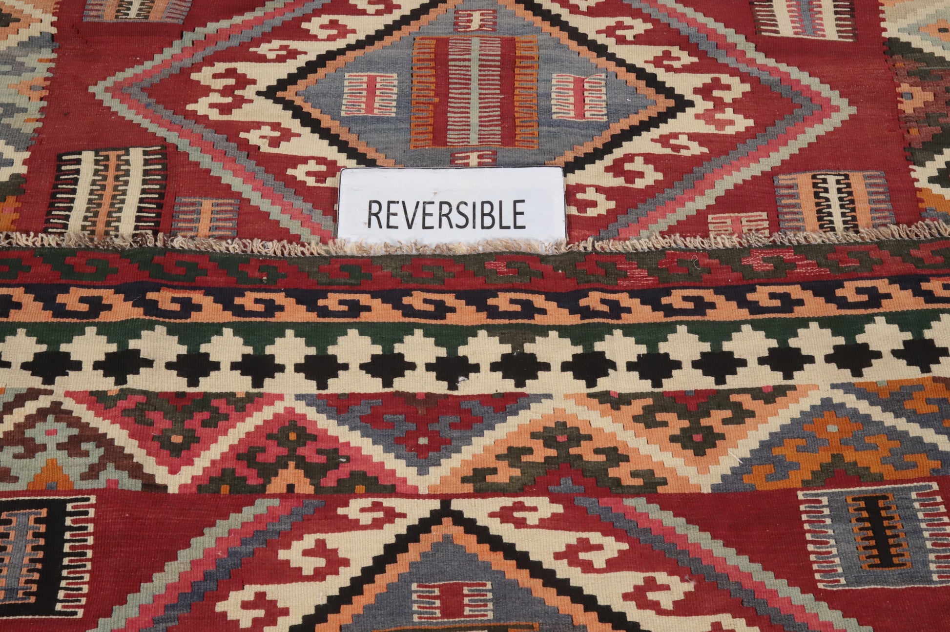 A Beautiful Genuine Persia ( Persia ) Kilim (Qashqai) rug is Hand Woven by skillful weavers in Persia ( Persia ) with 100% Wool Material. This rug is in Very Good condition. dimensions are 7' 5'' X 5' 2'' in foot and 226 X 157 in centimeter. the primary color is Red.
