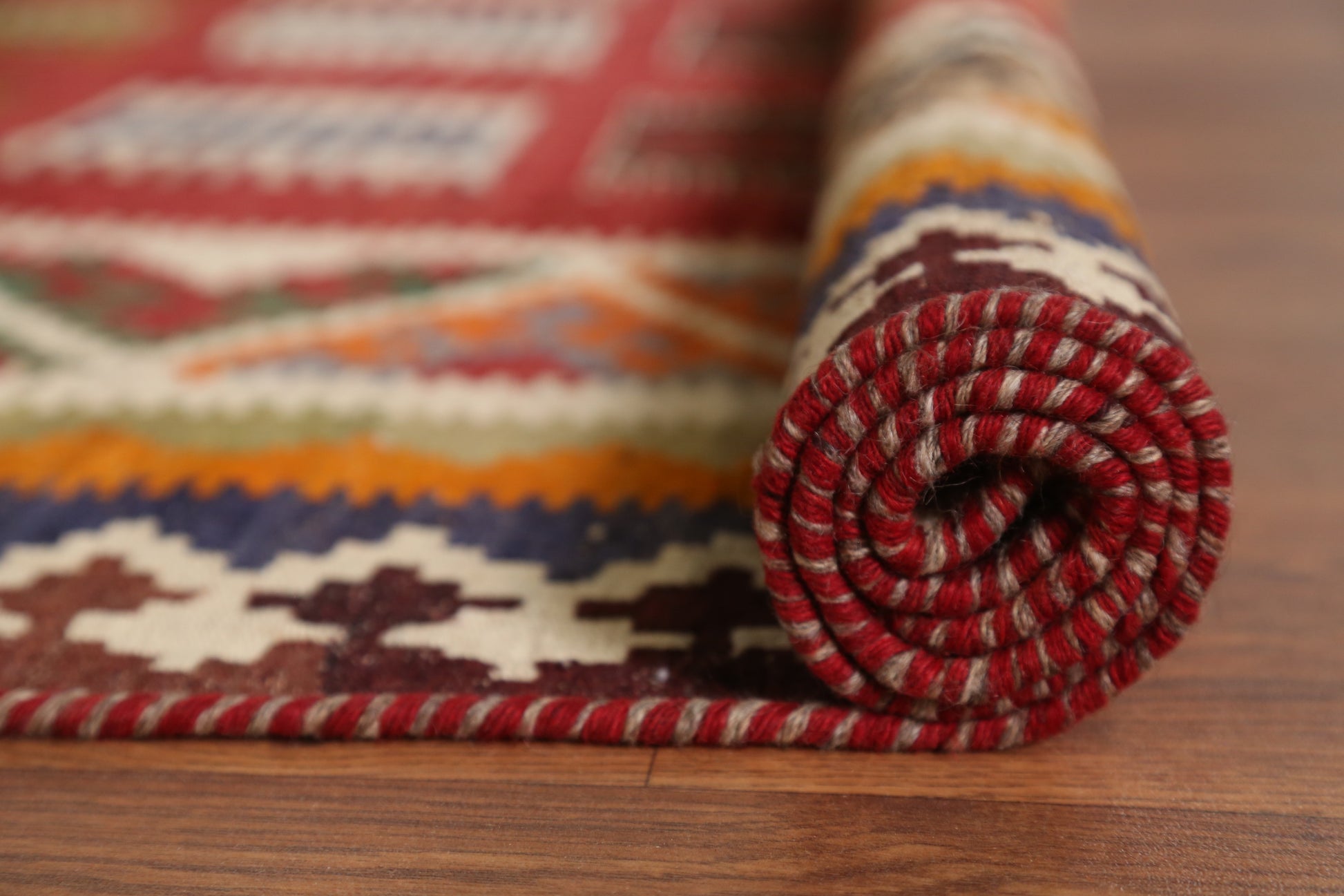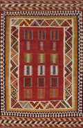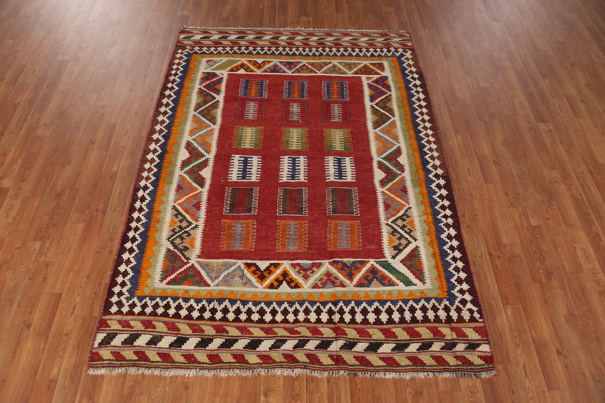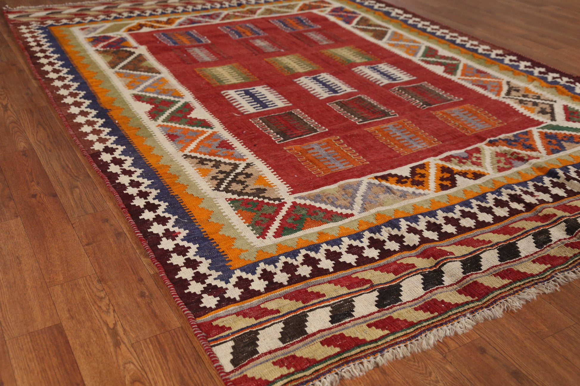 A Beautiful Genuine Persia ( Persia ) Kilim (Qashqai) rug is Hand Woven by skillful weavers in Persia ( Persia ) with 100% Wool Material. This rug is in Very Good condition. dimensions are 7' 2'' X 5' 1'' in foot and 218 X 155 in centimeter. the primary color is Red.