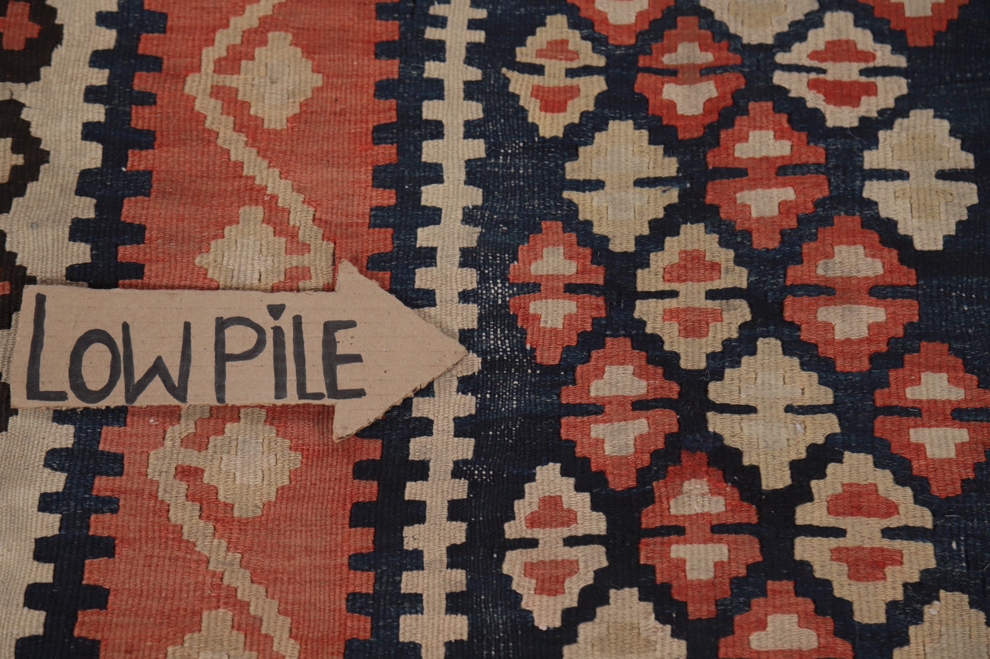 A Beautiful Genuine Persia ( Persia ) Kilim (Qashqai) rug is Hand Woven by skillful weavers in Persia ( Persia ) with 100% Wool Material. This rug is in Very Good (Low Pile-Faded Color) condition. dimensions are 12' 0'' X 3' 1'' in foot and 366 X 94 in centimeter. the primary color is Navy Blue & Blues.