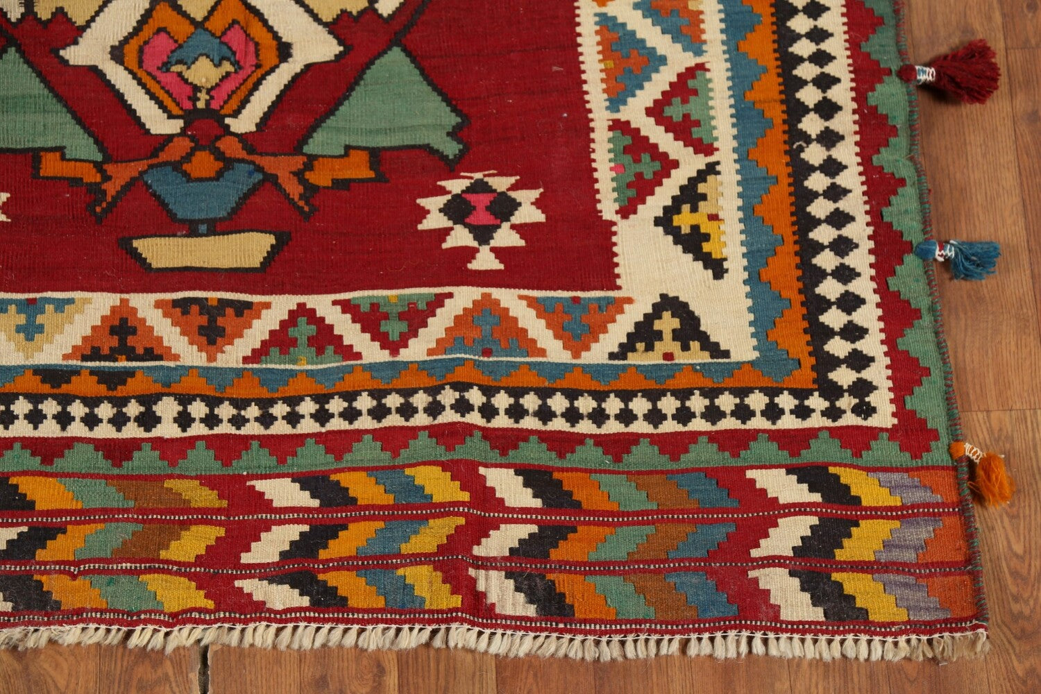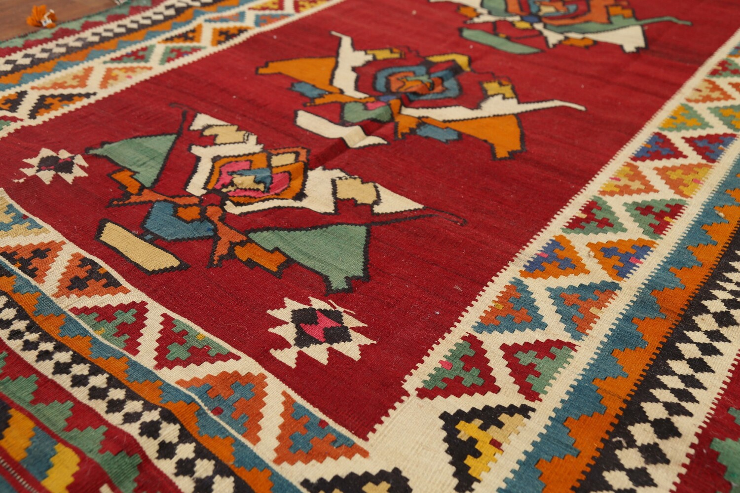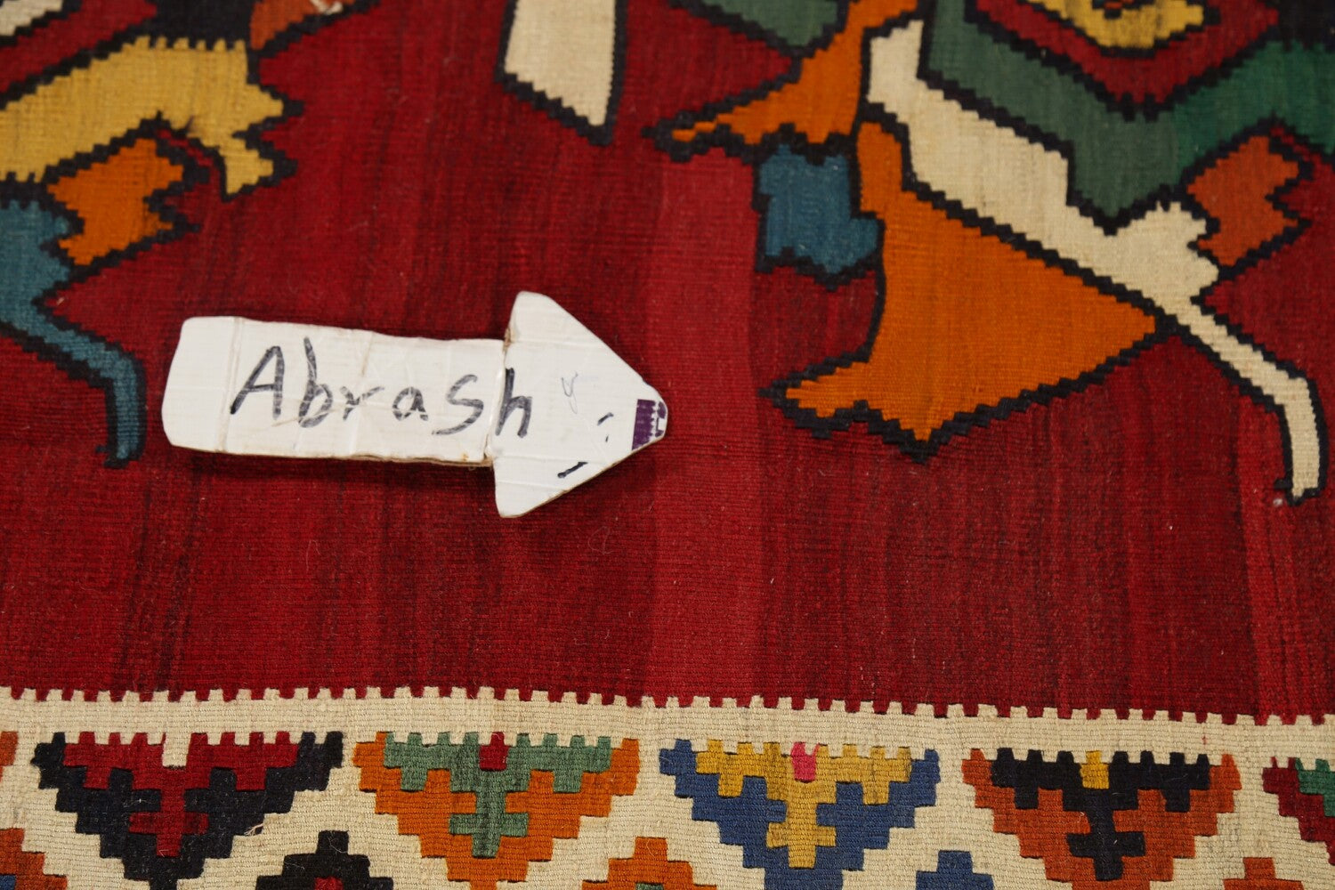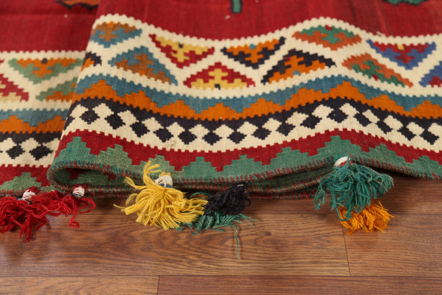 A Beautiful Genuine Persia ( Persia ) Kilim (Qashqai) rug is Hand Woven by skillful weavers in Persia ( Persia ) with 100% Wool Material. This rug is in Very Good (Abrash) condition. dimensions are 12' 8'' X 4' 2'' in foot and 386 X 127 in centimeter. the primary color is Red.