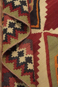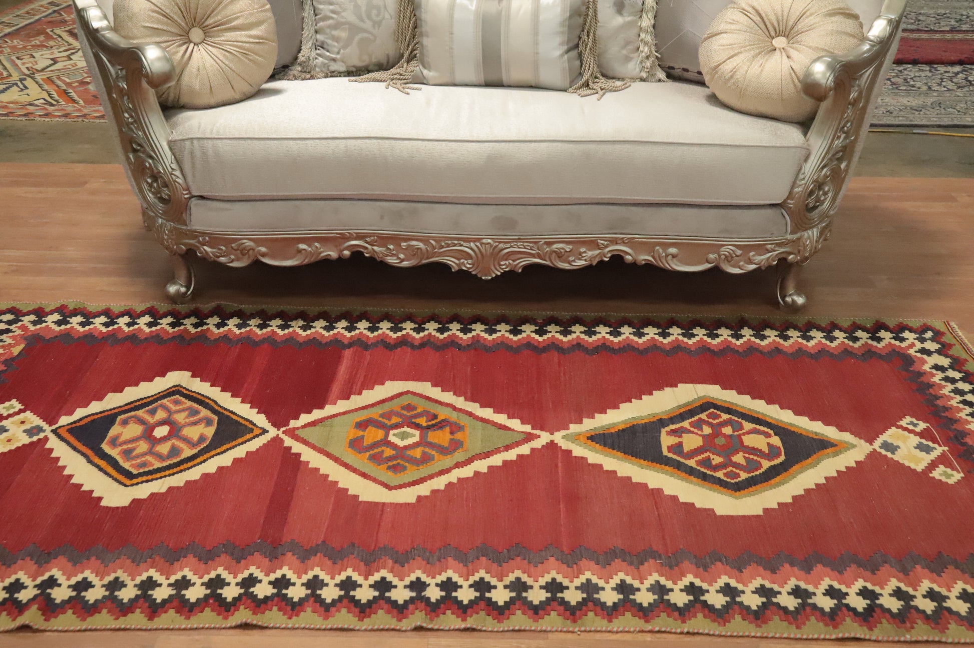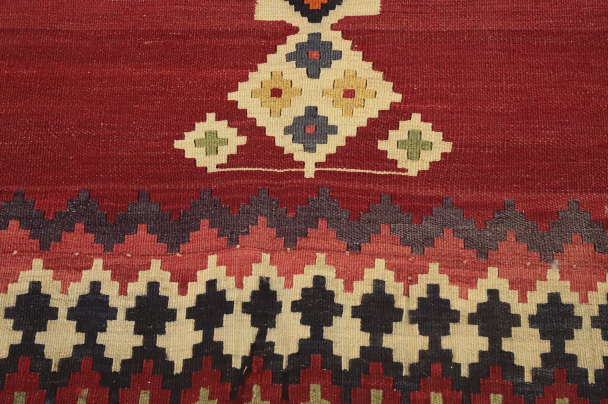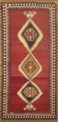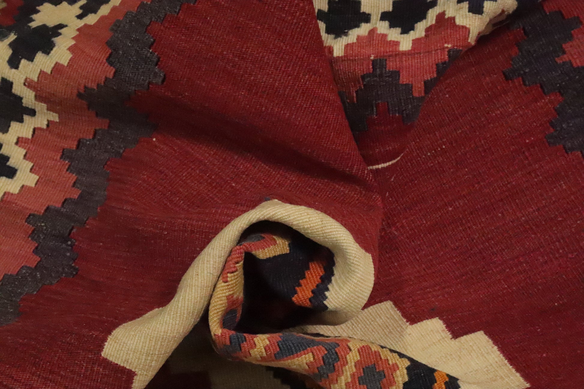 A Beautiful Genuine Persia ( Persia ) Kilim (Qashqai) rug is Hand Woven by skillful weavers in Persia ( Persia ) with 100% Wool Material. This rug is in Very Good (Abrash) condition. dimensions are 8' 6'' X 3' 9'' in foot and 259 X 114 in centimeter. the primary color is Red.
