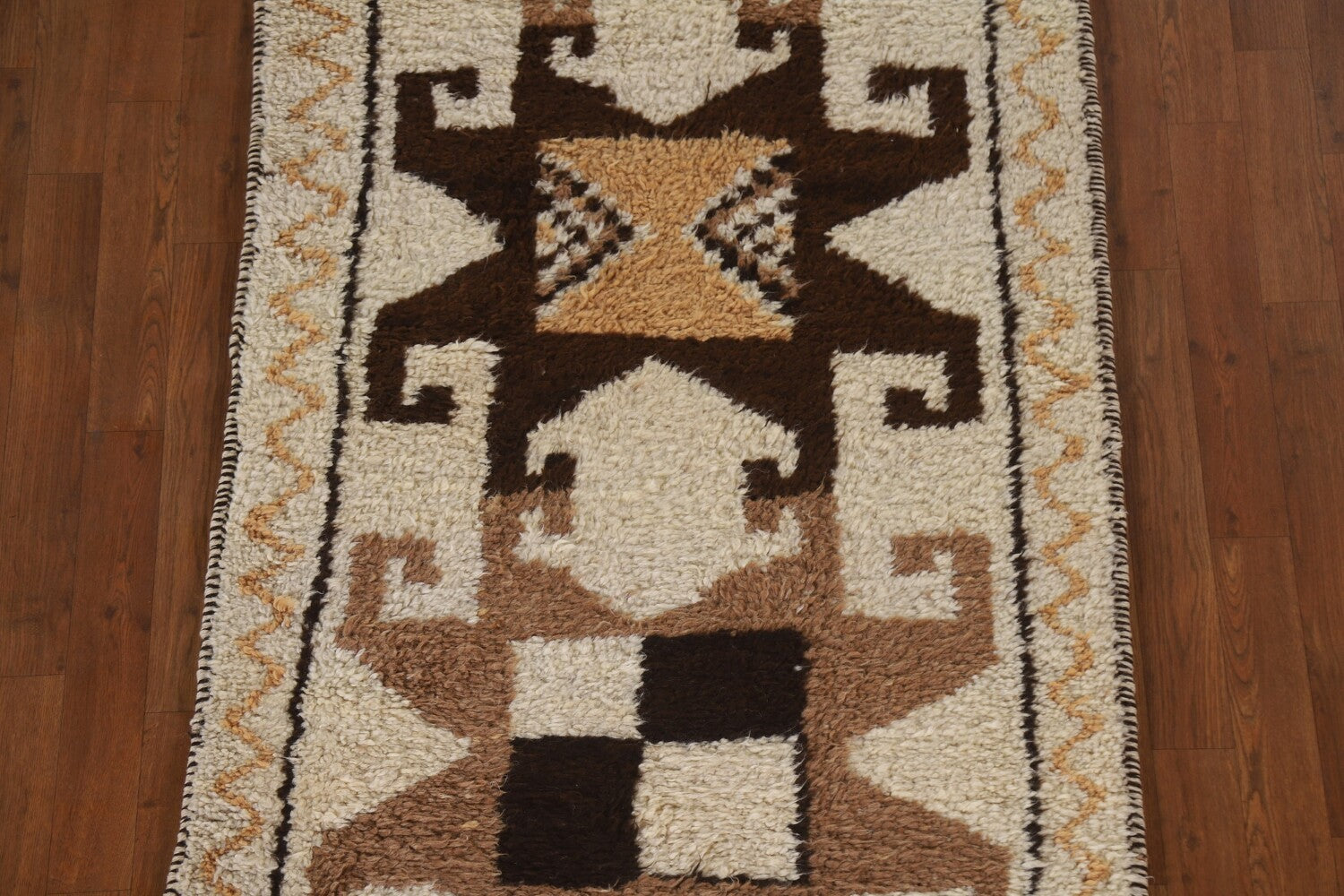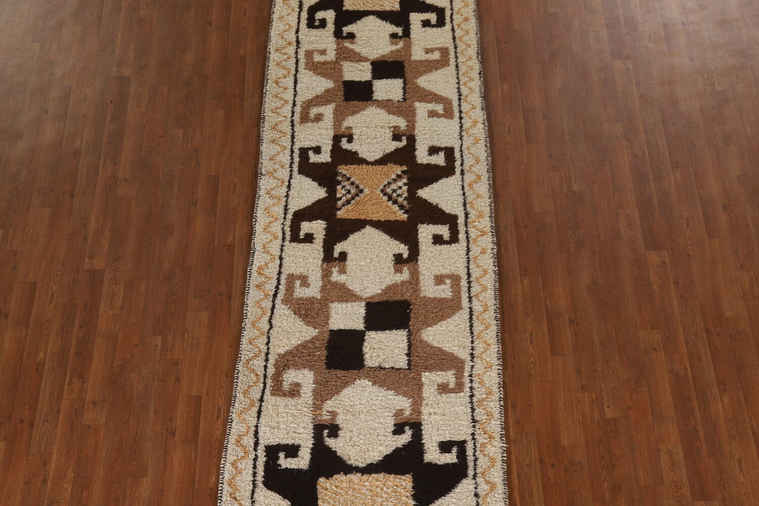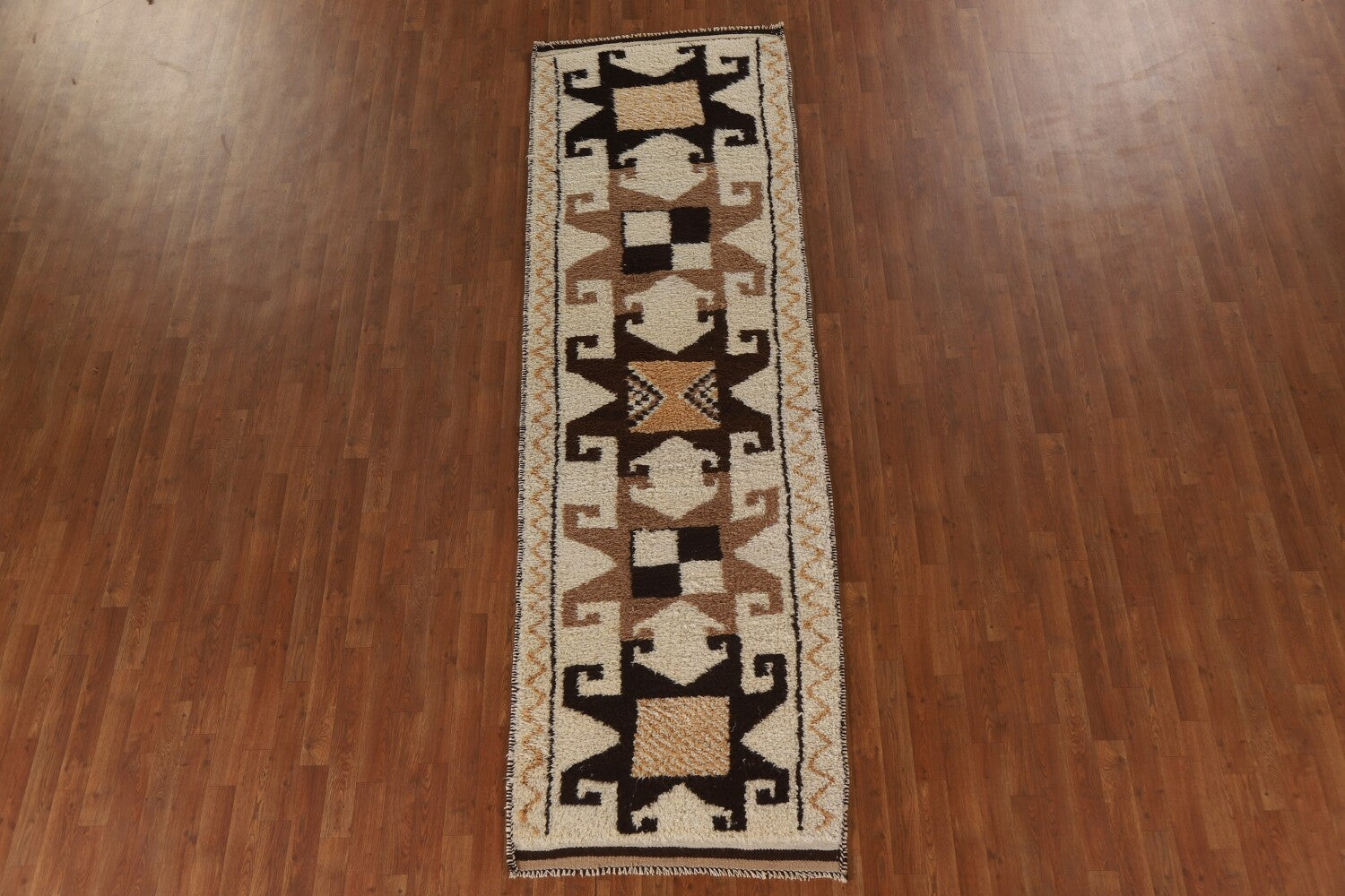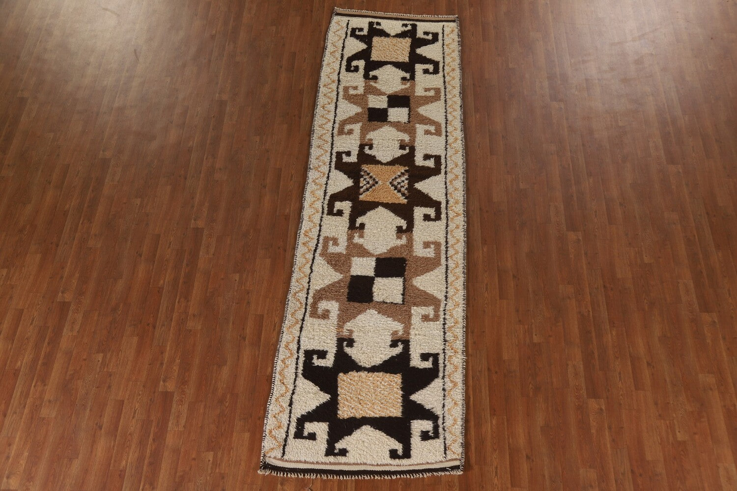 A Beautiful Genuine Turkey Kurdish rug is Hand Knotted by skillful weavers in Turkey with 100% Wool Material. This rug is in condition. dimensions are 10' 7'' X 3' 4'' in foot and 323 X 102 in centimeter. the primary color is Beige & Ivories.