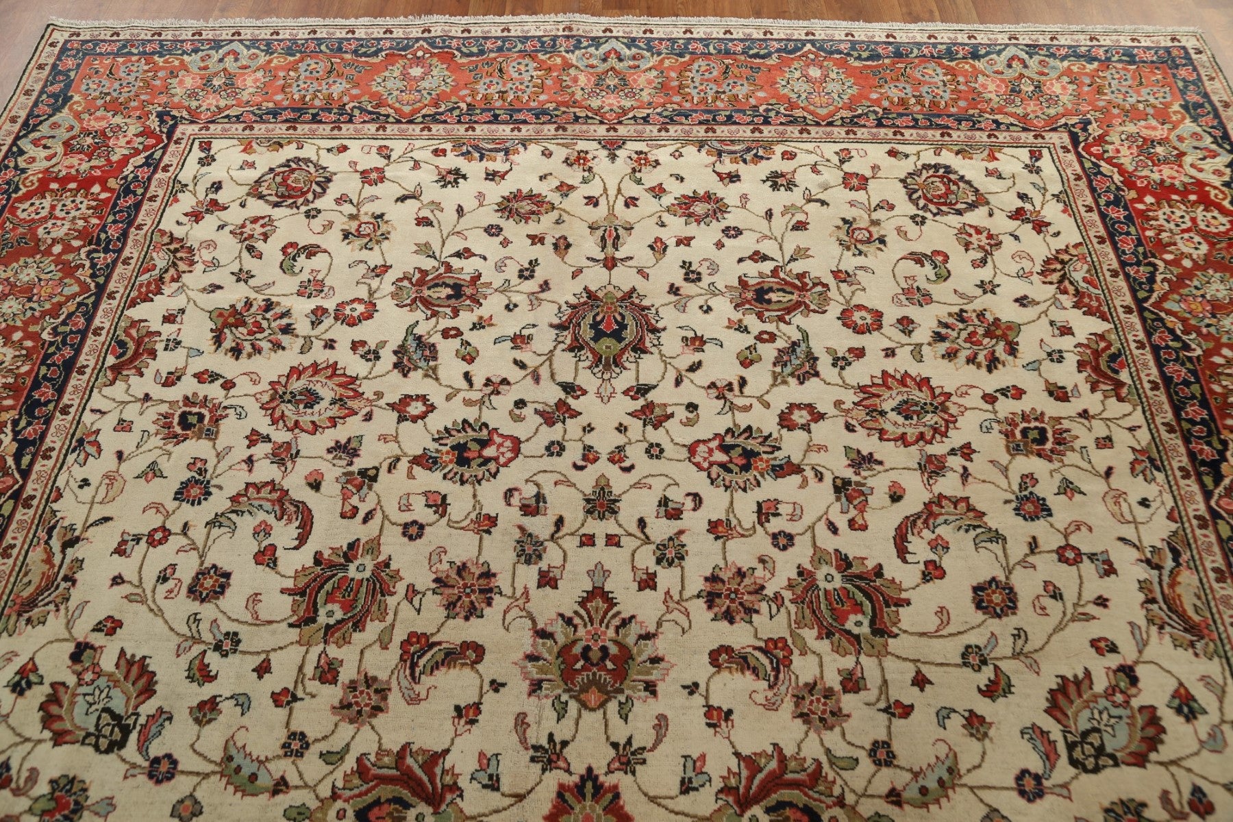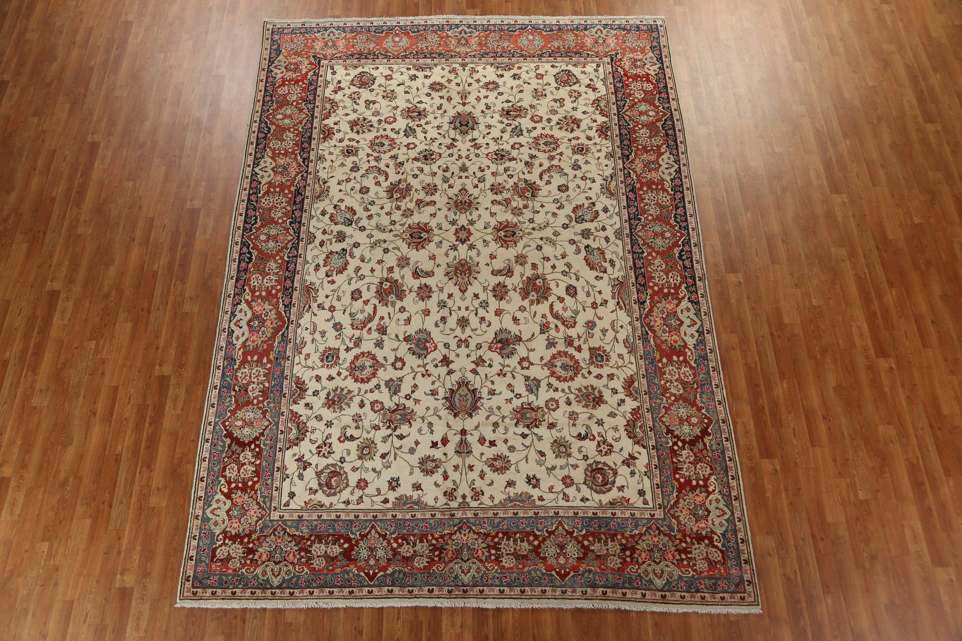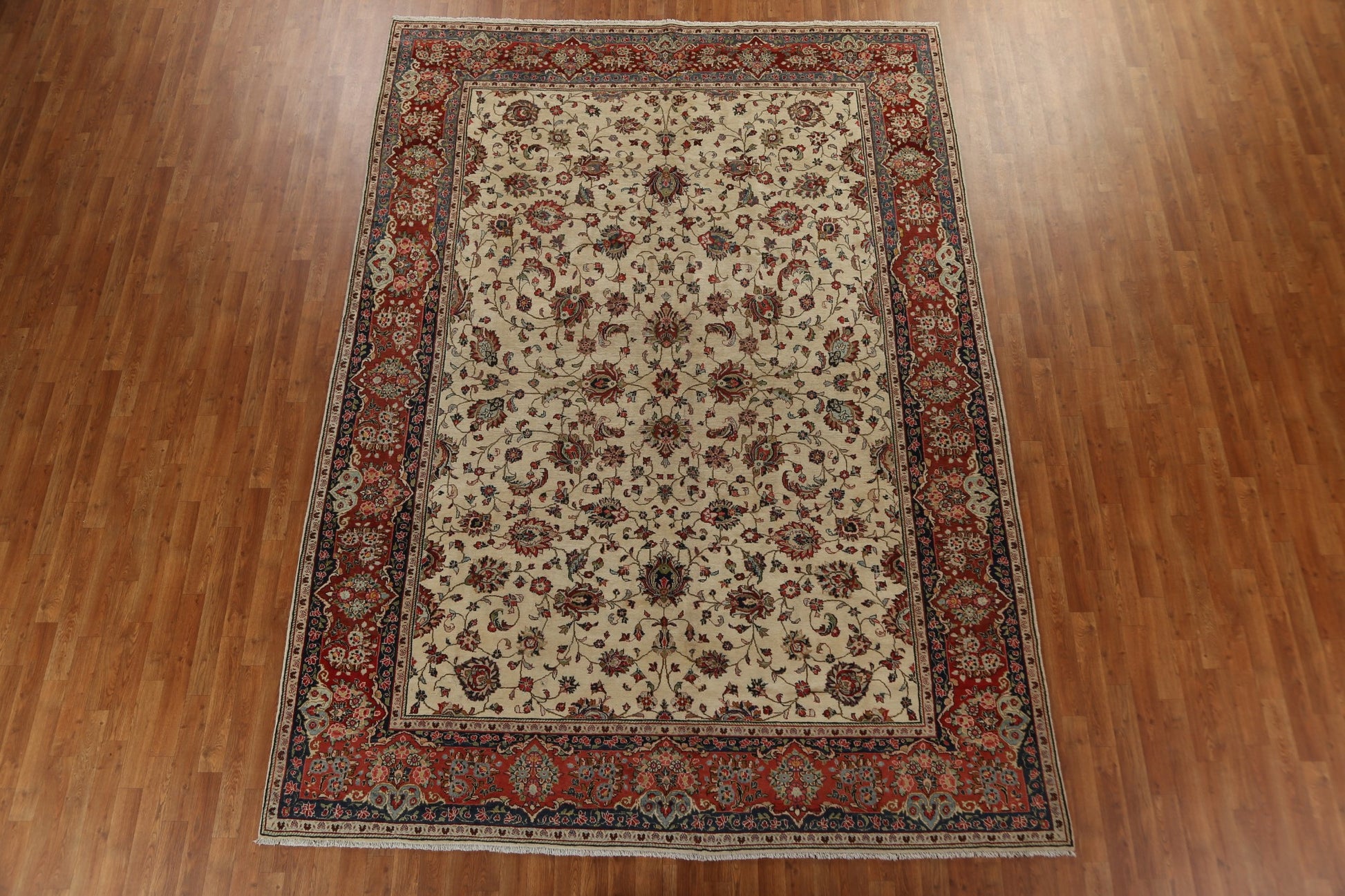 A Beautiful Genuine Persia ( Persia ) Mahal rug is Hand Knotted by skillful weavers in Persia ( Persia ) with 100% Wool Material. This rug is in Very Good (Small Low Pile-Repair) condition. dimensions are 11' 8'' X 8' 4'' in foot and 356 X 254 in centimeter. the primary color is Beige & Ivories.