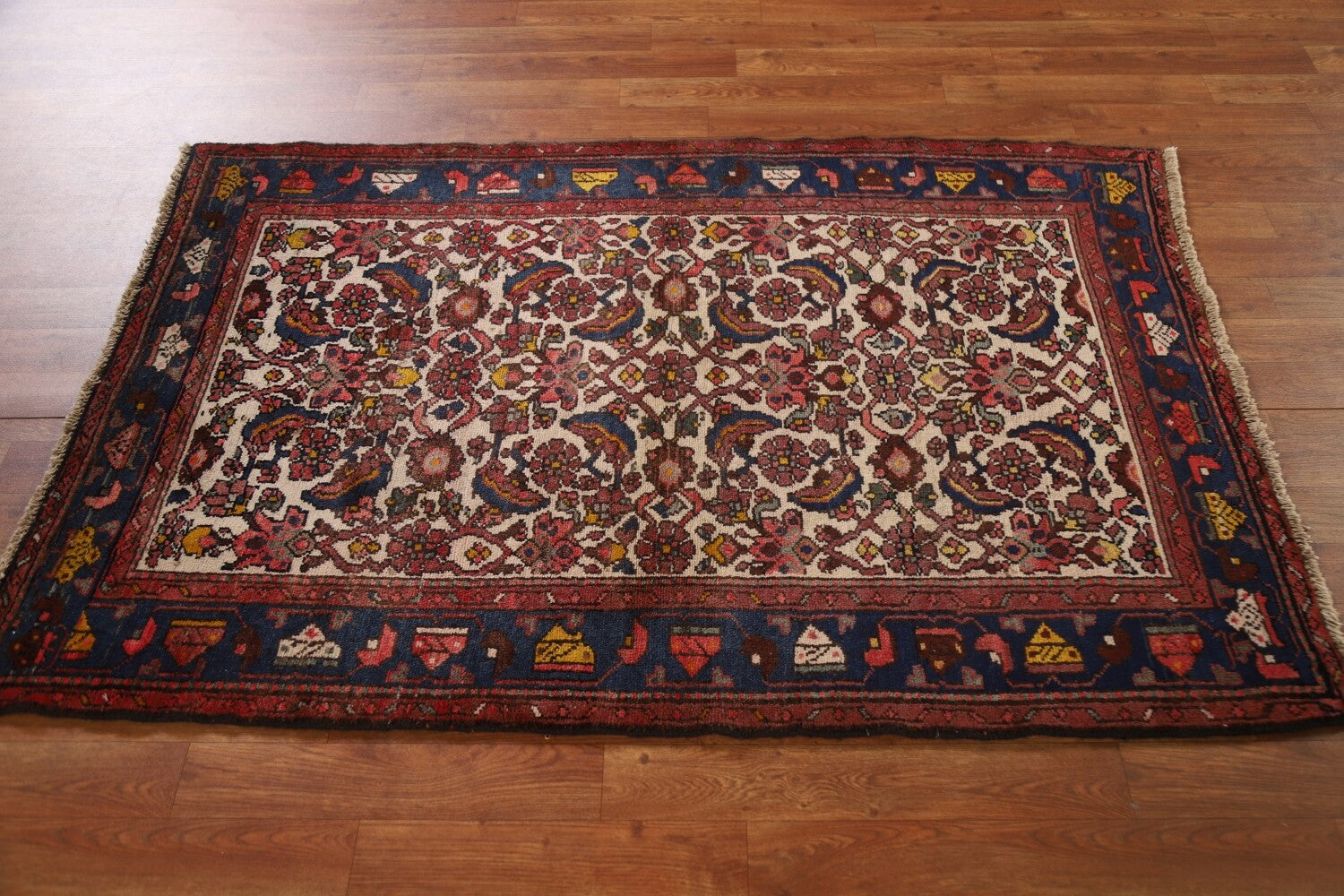 A Beautiful Genuine Persia ( Persia ) Malayer (100% Vegetable Dye) rug is Hand Knotted by skillful weavers in Persia ( Persia ) with 100% Wool Material. This rug is in Very Good condition. dimensions are 5' 0'' X 3' 4'' in foot and 152 X 102 in centimeter. the primary color is Beige & Ivories.