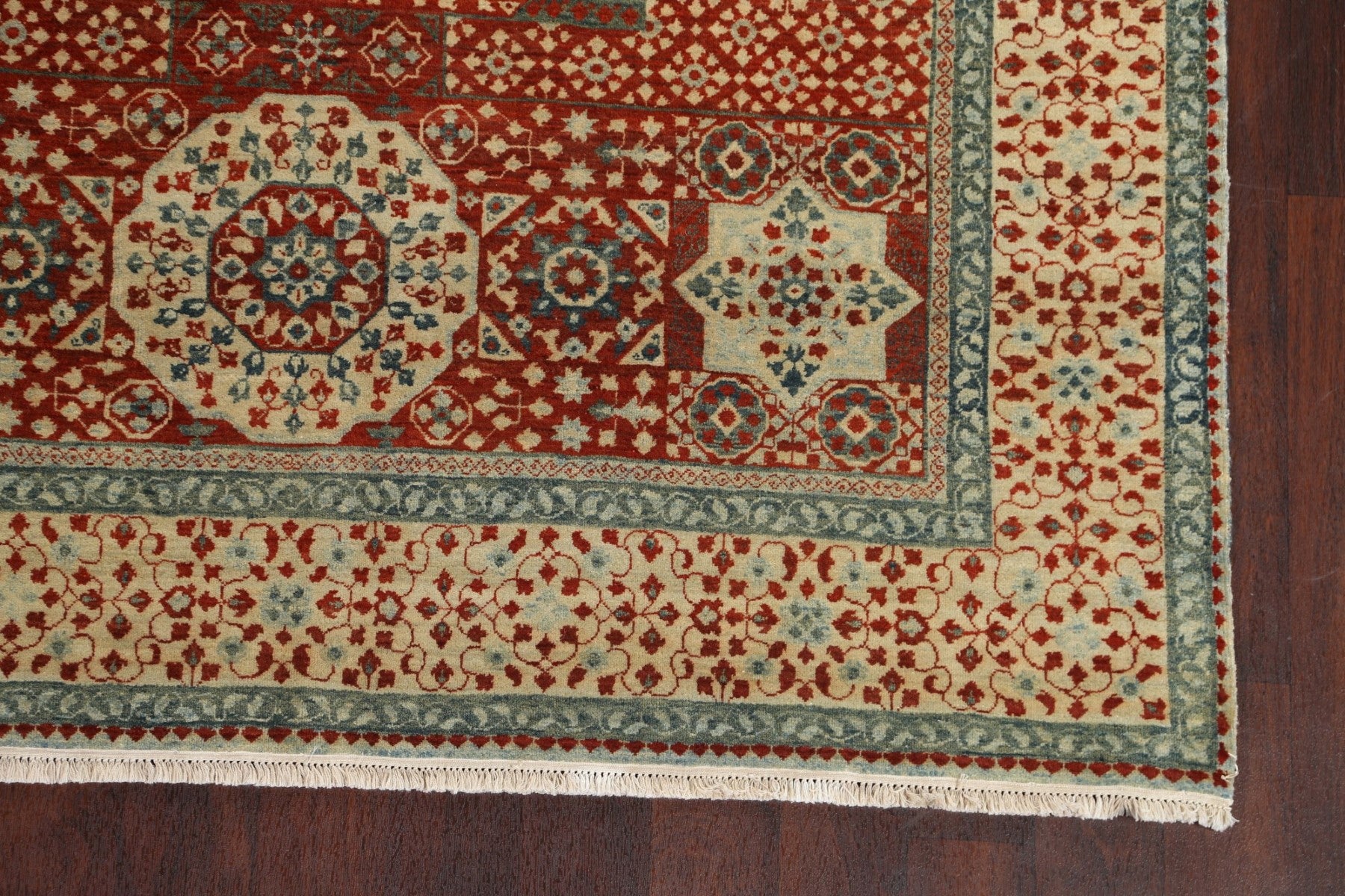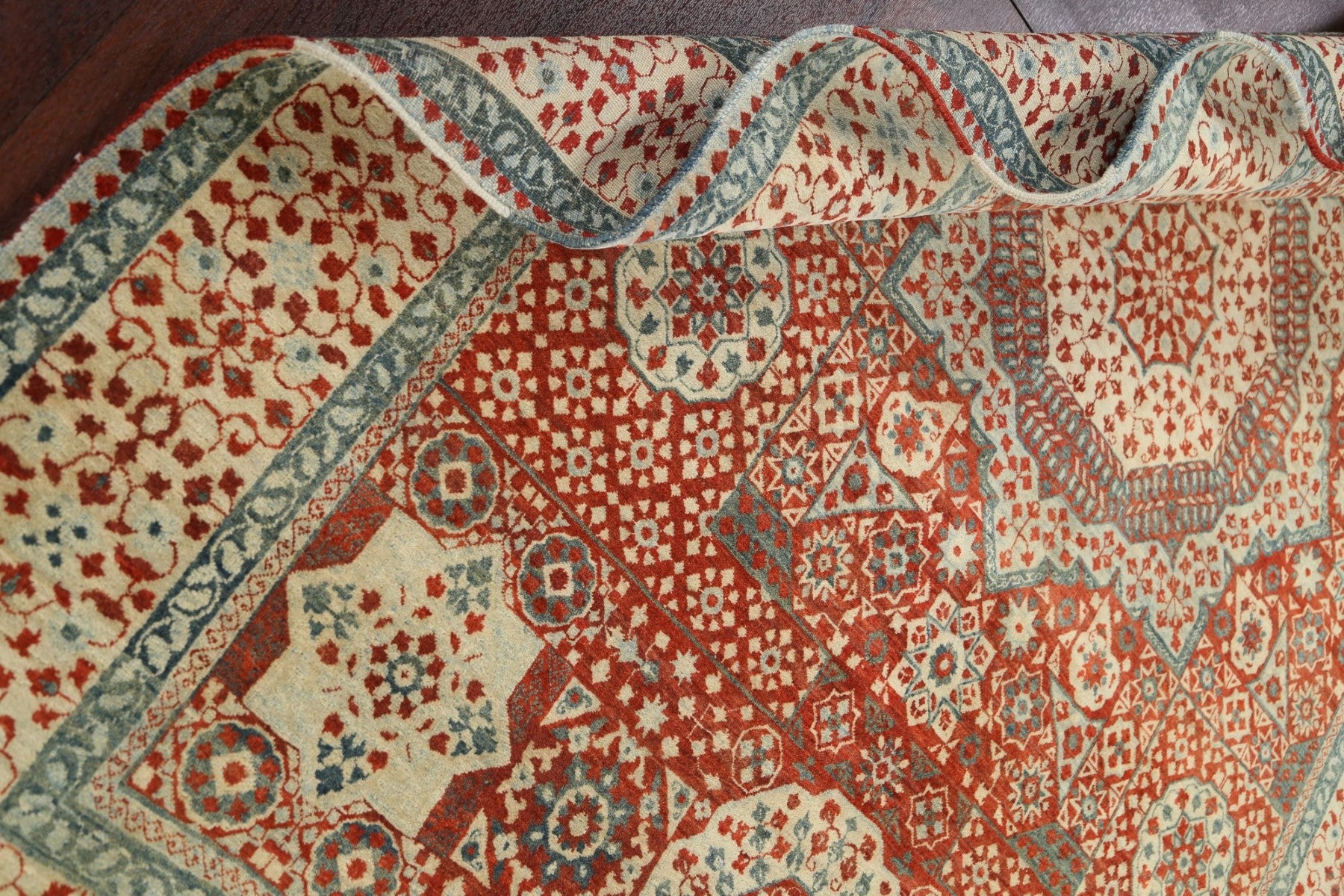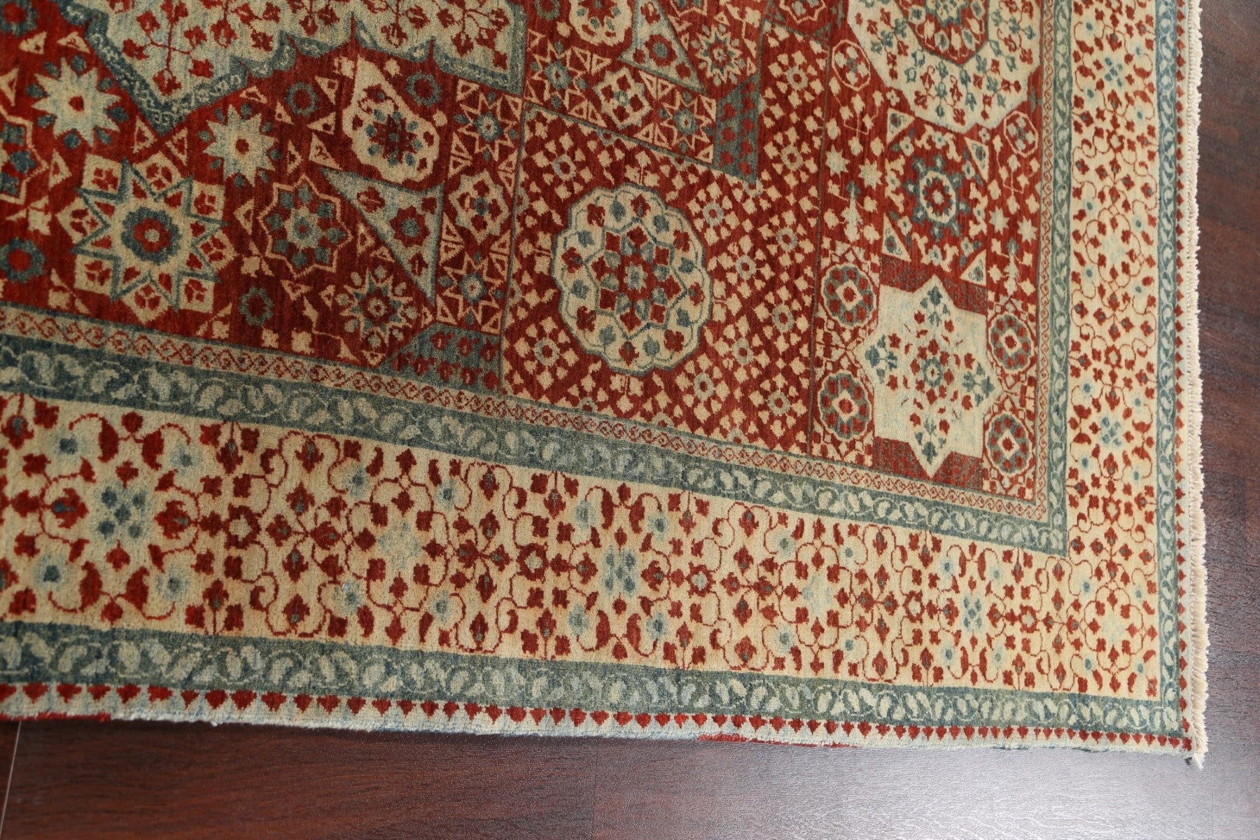 A Beautiful Genuine India Mamluk rug is Hand Knotted by skillful weavers in India with 100% Wool Material. This rug is in New, First Quality condition. dimensions are 9' 3'' X 6' 2'' in foot and 282 X 188 in centimeter. the primary color is Oranges & Rust.