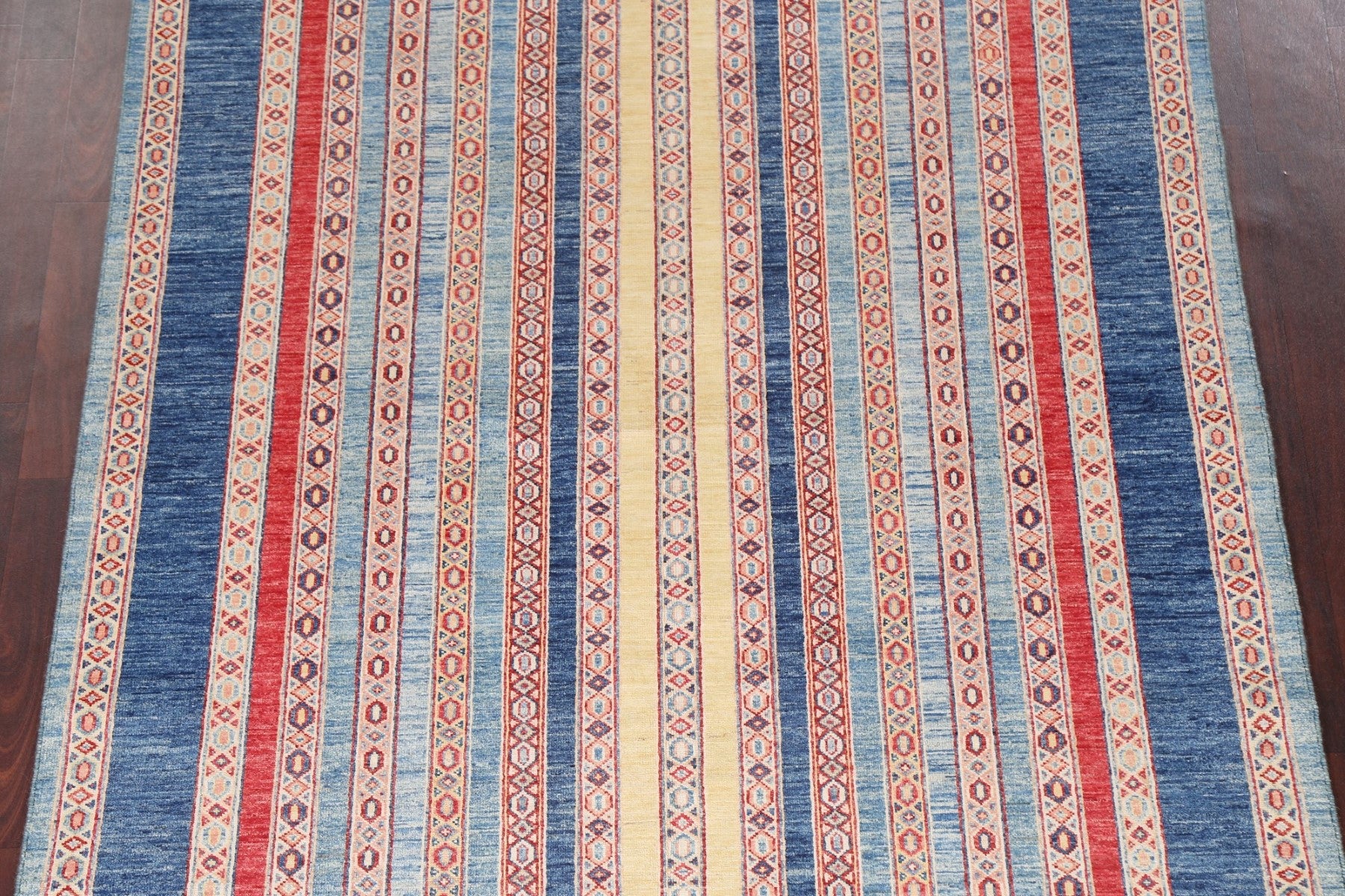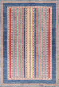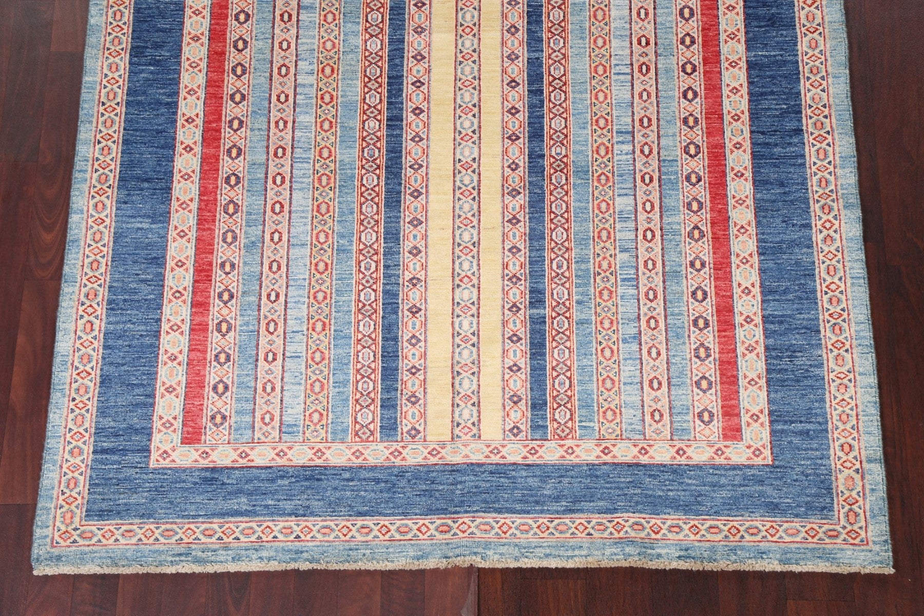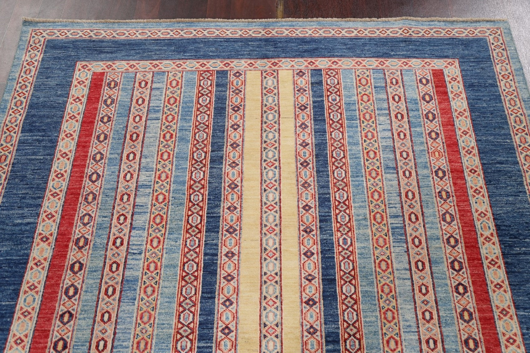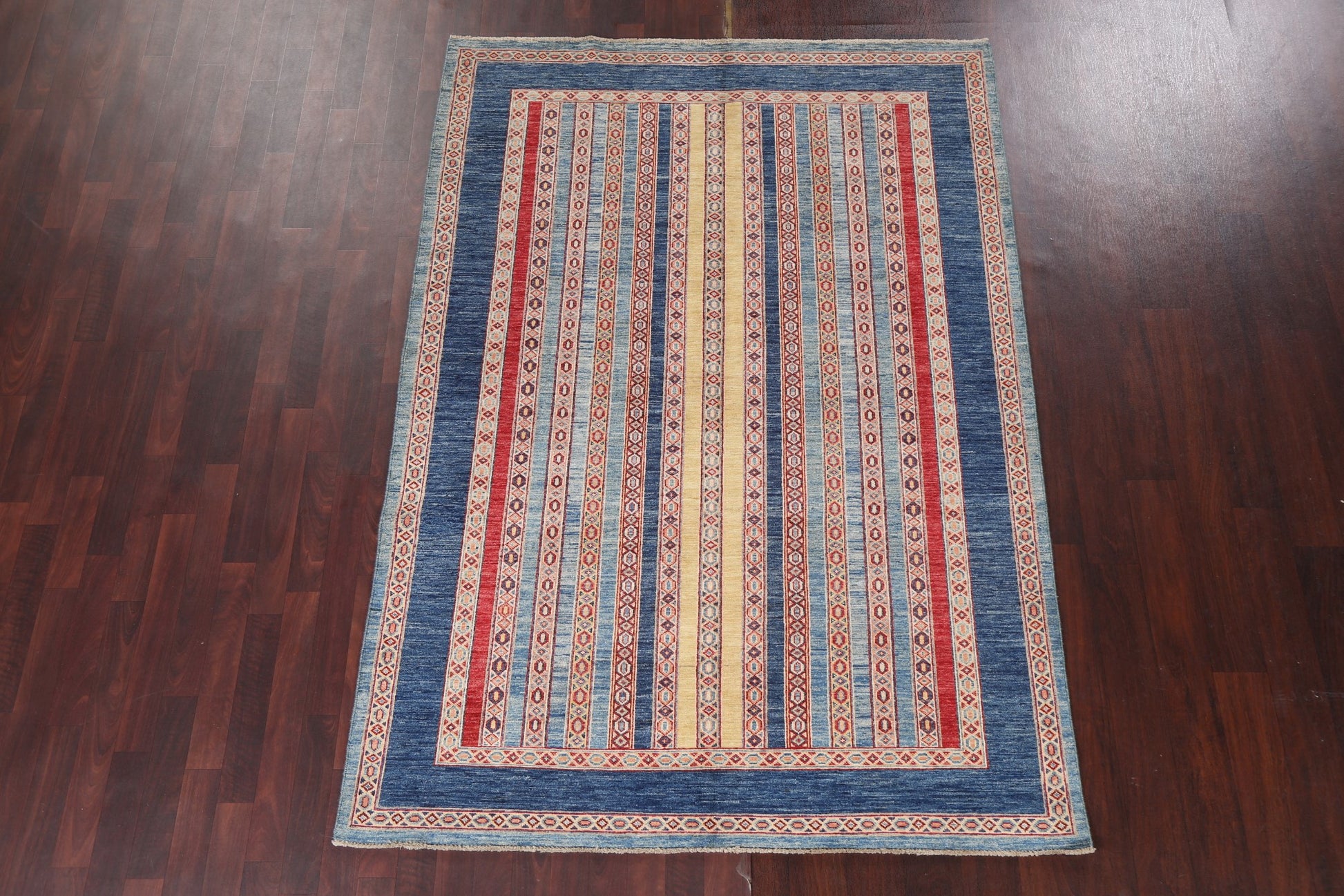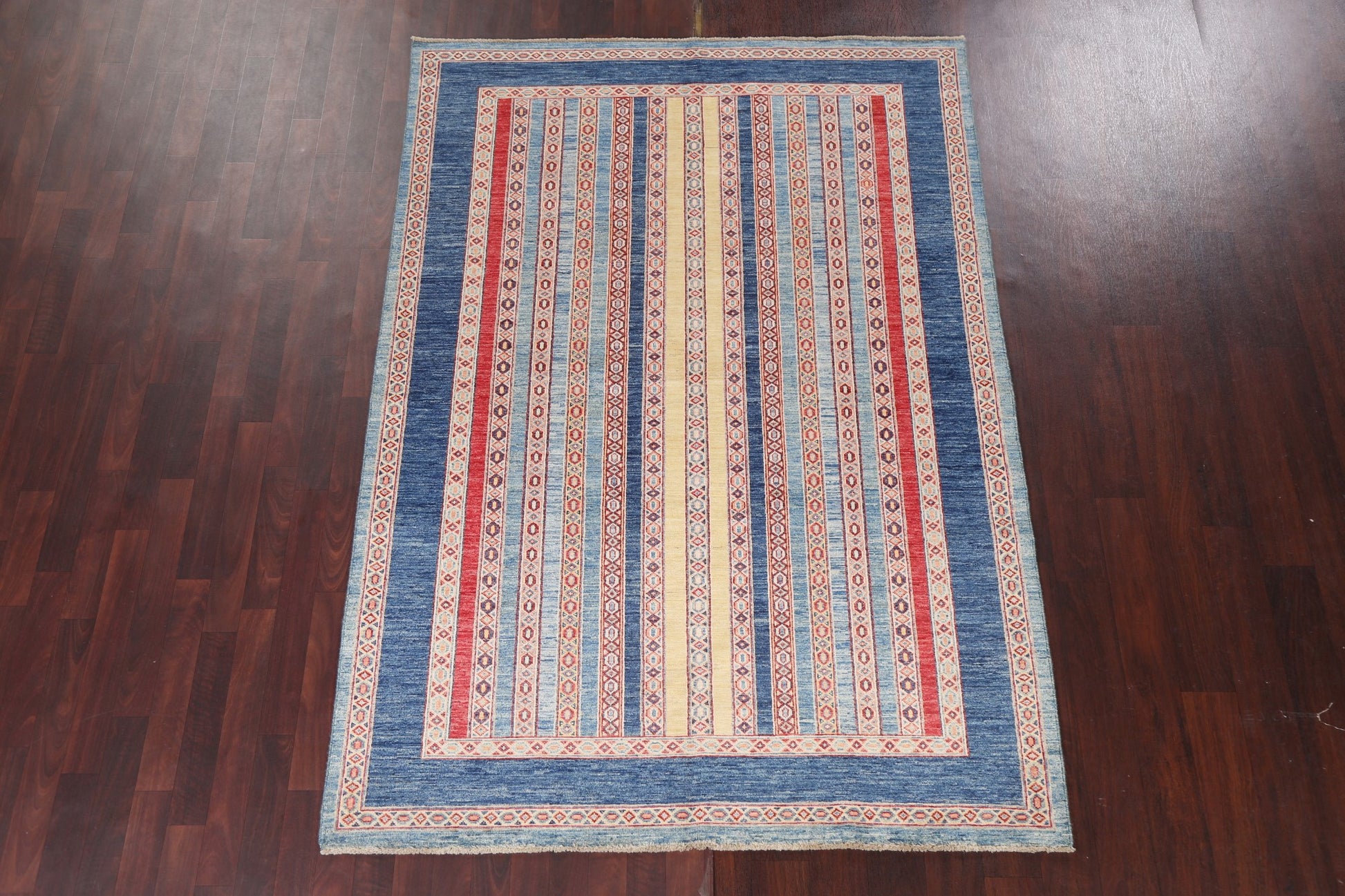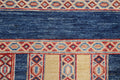 A Beautiful Genuine Pakistan Moharramat rug is Hand Knotted by skillful weavers in Pakistan with 100% Wool Material. This rug is in New, First Quality condition. dimensions are 7' 9'' X 5' 4'' in foot and 236 X 163 in centimeter. the primary color is Navy Blue & Blues.