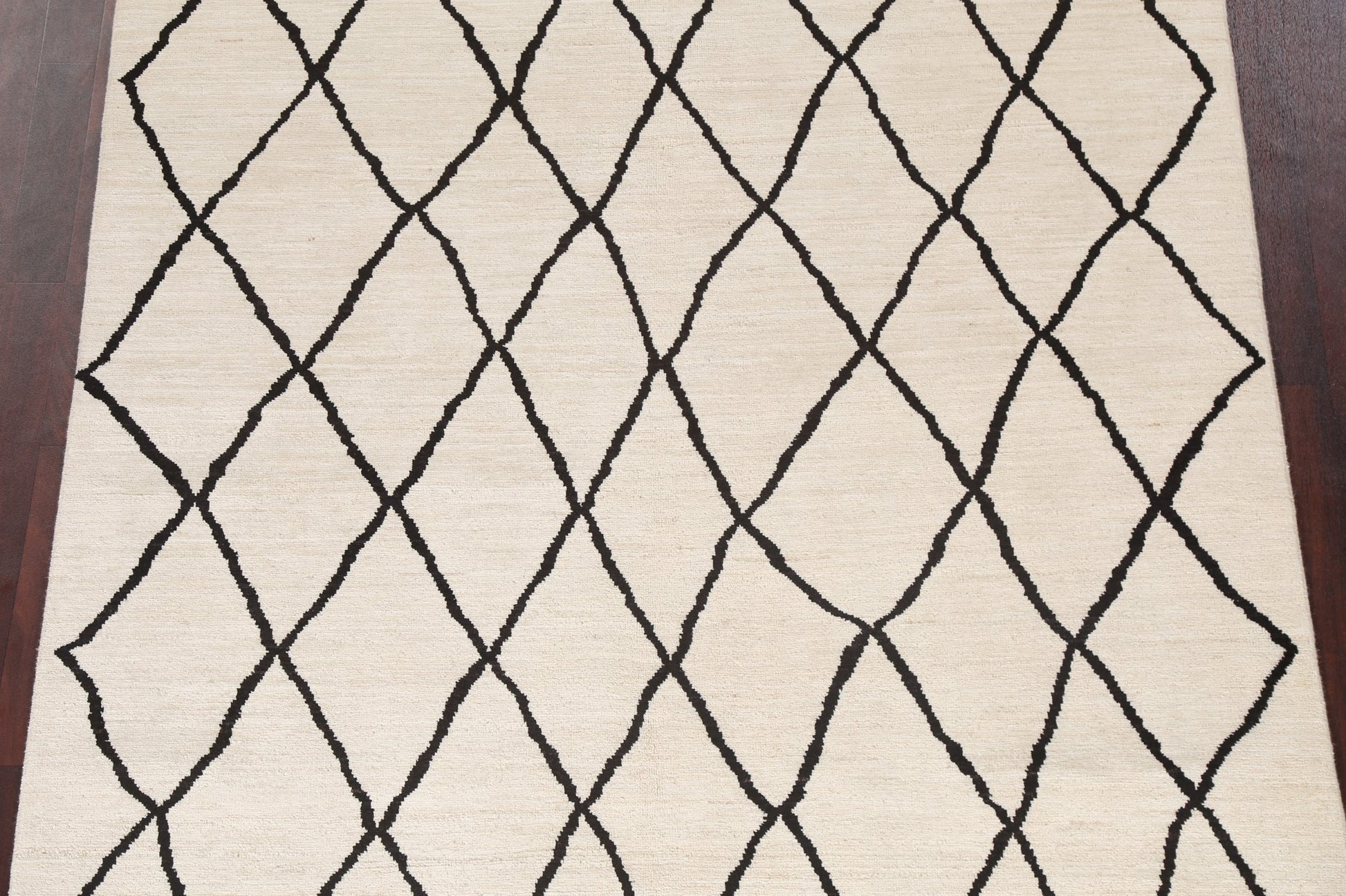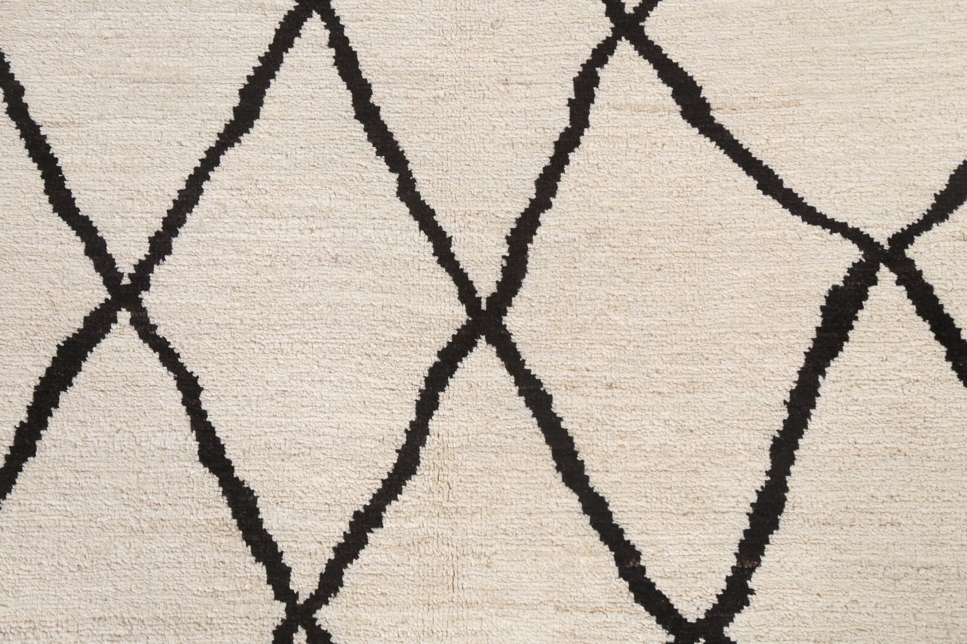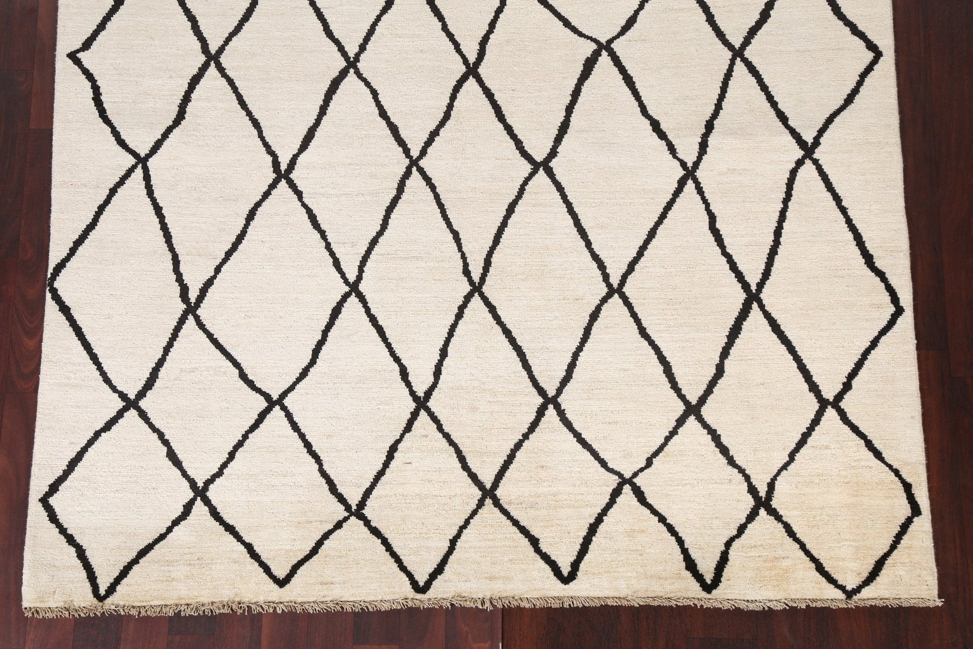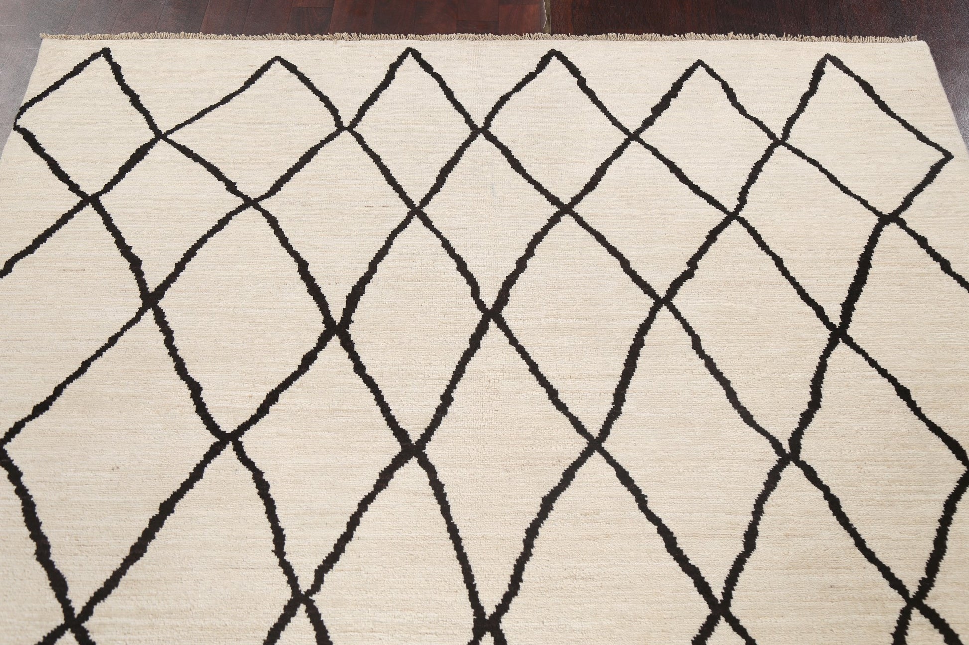 A Beautiful Genuine Pakistan Moroccan rug is Hand Knotted by skillful weavers in Pakistan with 100% Wool Material. This rug is in New, First Quality condition. dimensions are 8' 10'' X 5' 6'' in foot and 269 X 168 in centimeter. the primary color is Beige & Ivories.