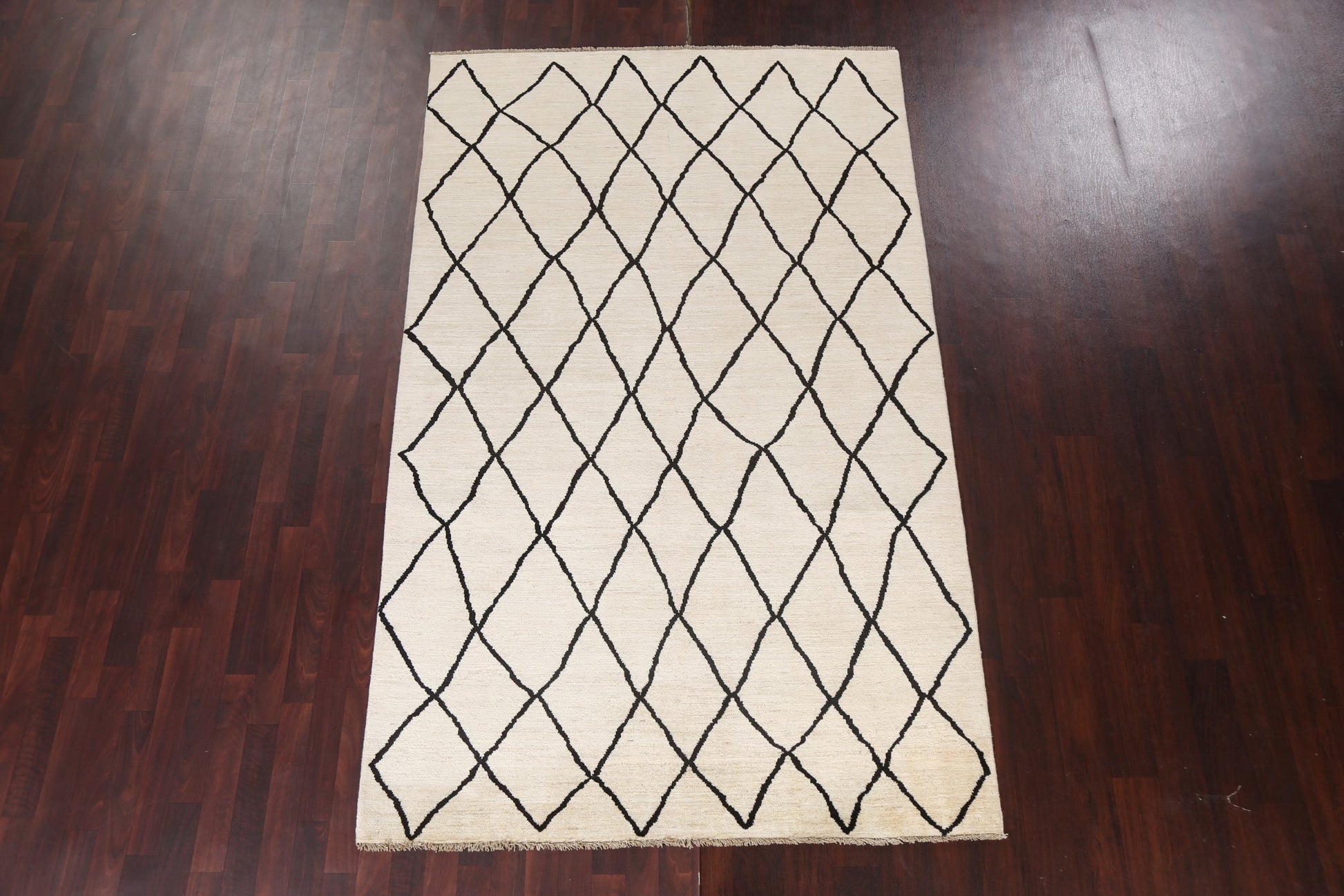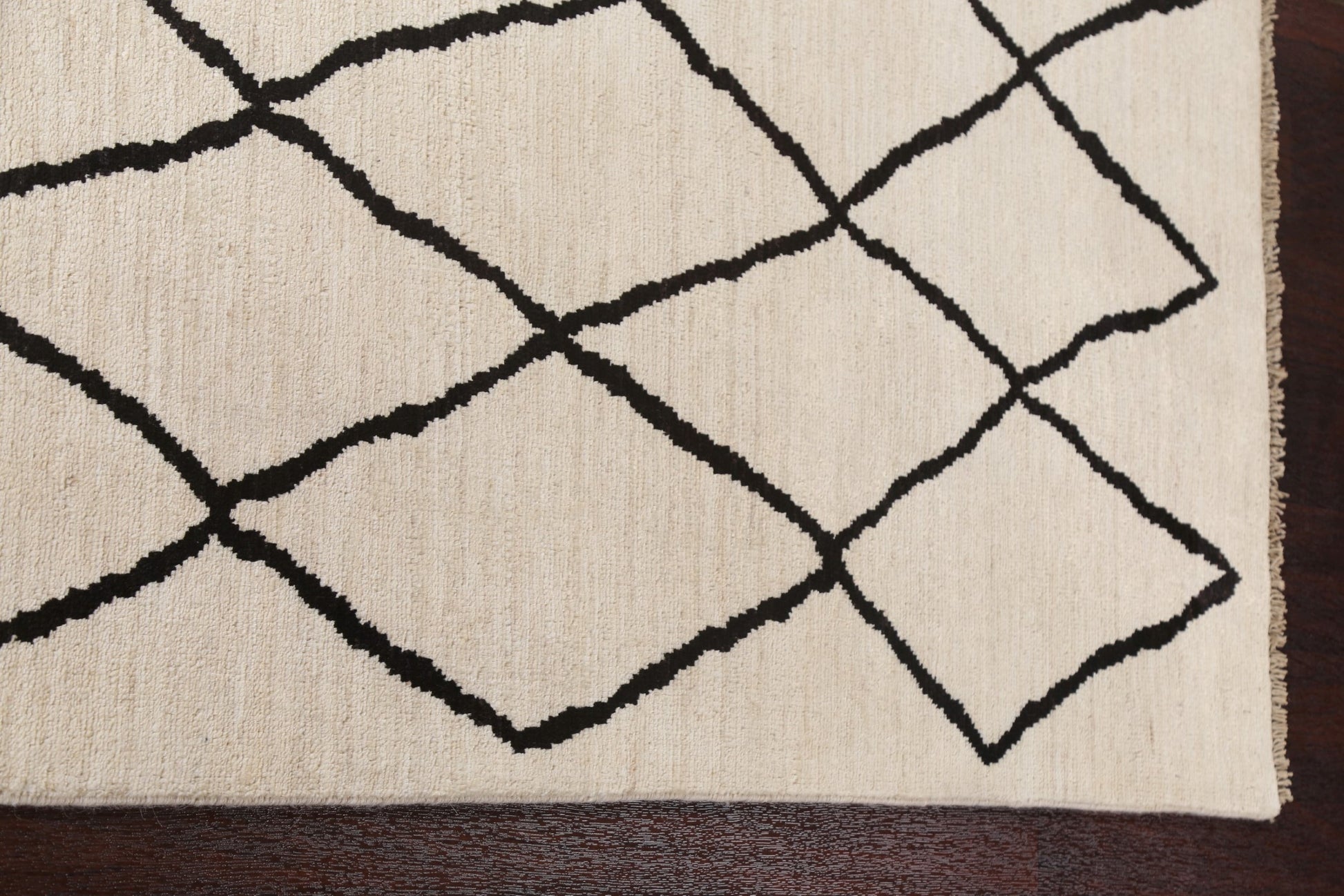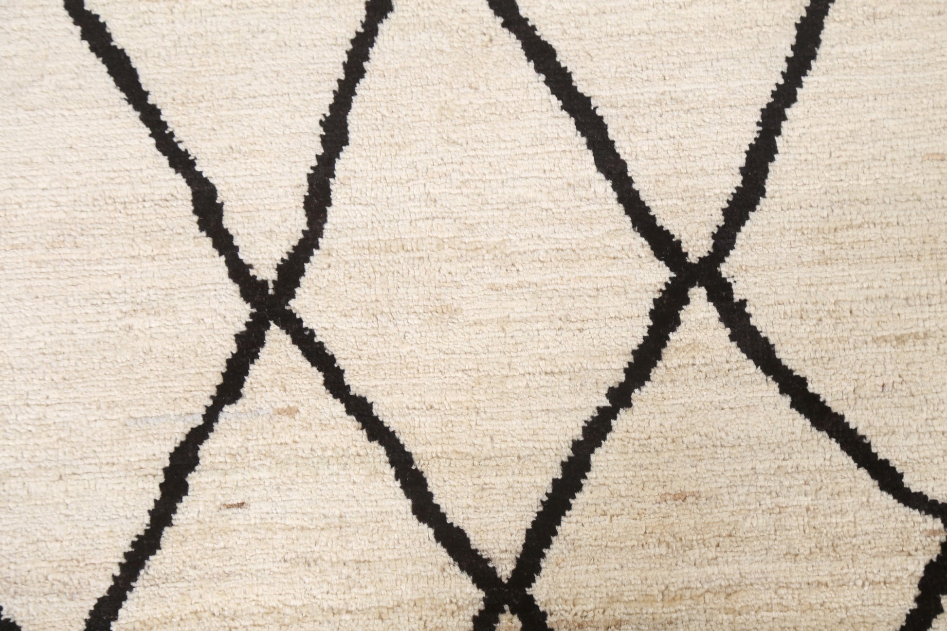 A Beautiful Genuine Pakistan Moroccan rug is Hand Knotted by skillful weavers in Pakistan with 100% Wool Material. This rug is in New, First Quality condition. dimensions are 8' 10'' X 5' 6'' in foot and 269 X 168 in centimeter. the primary color is Beige & Ivories.