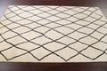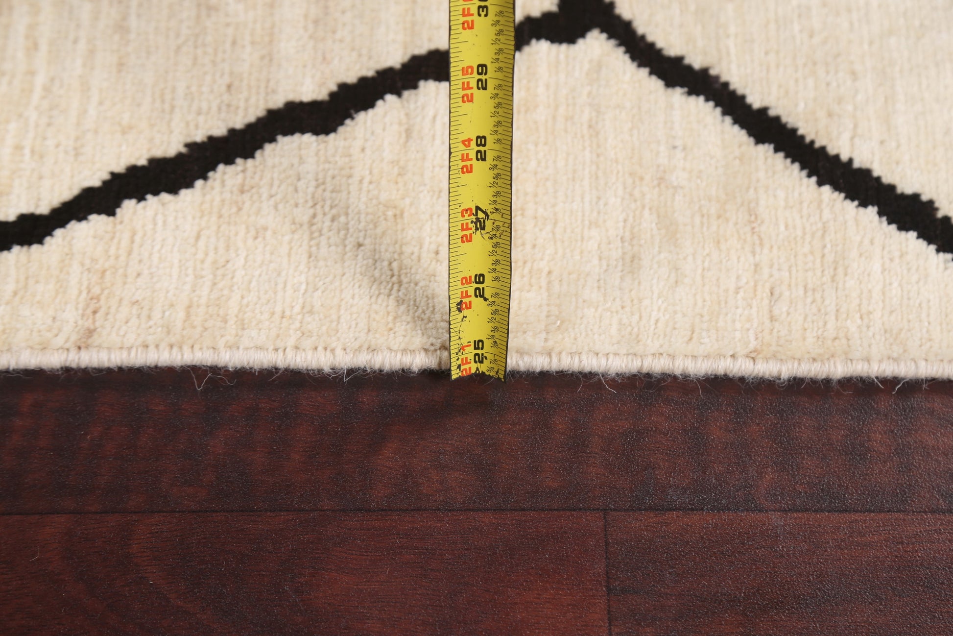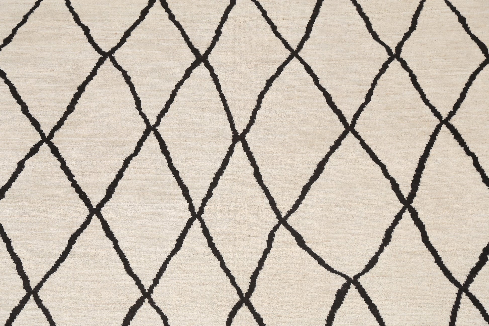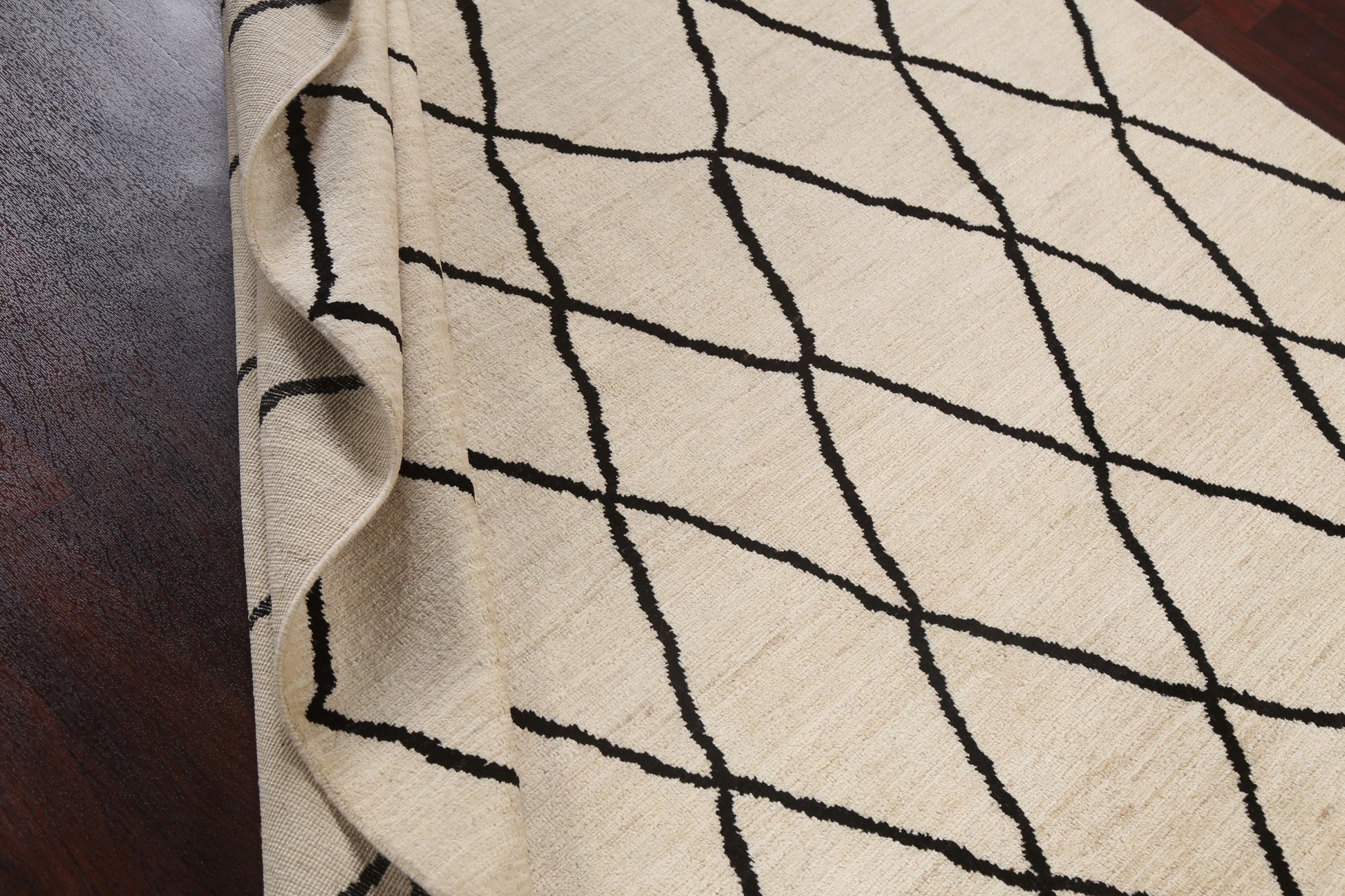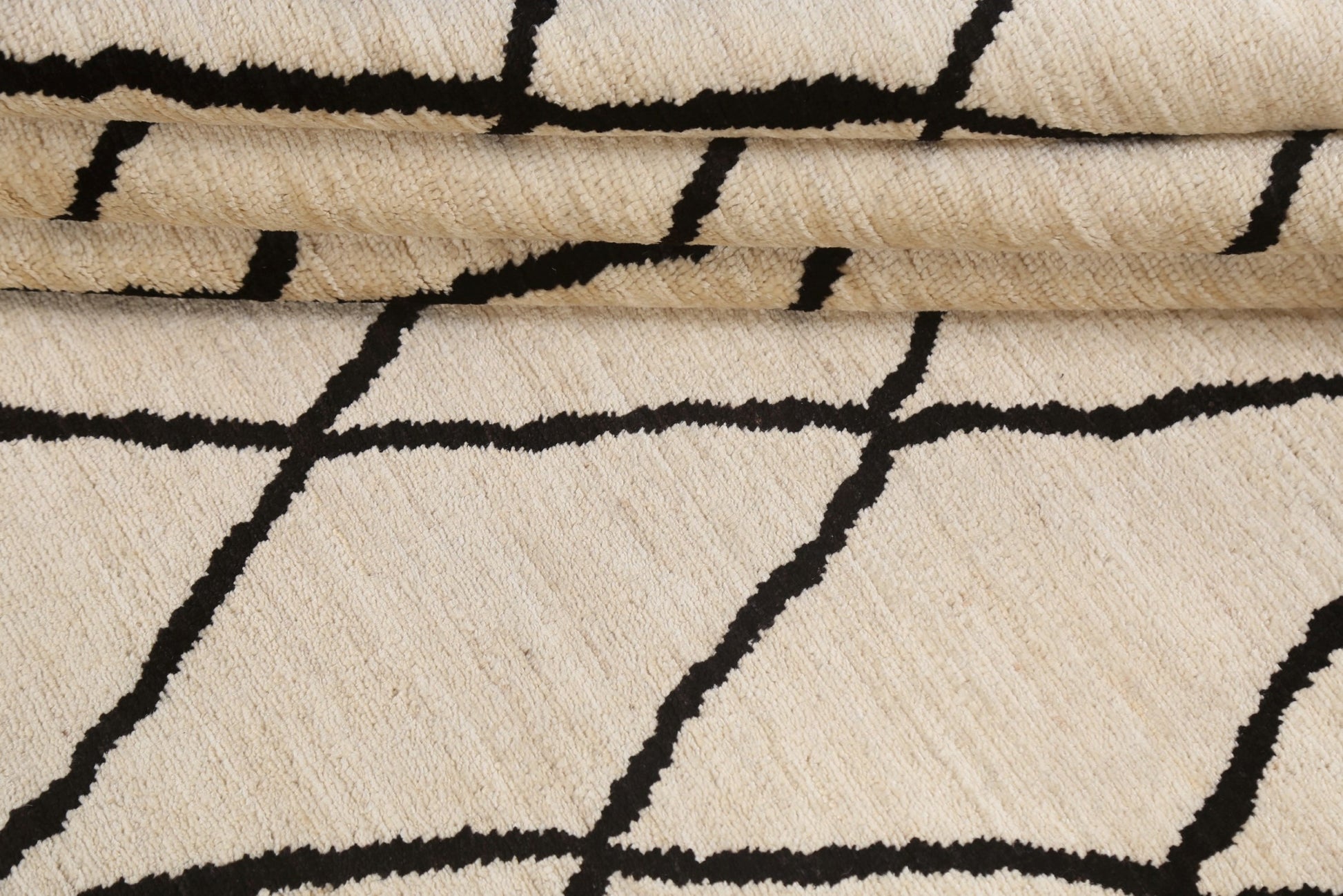 A Beautiful Genuine Pakistan Moroccan rug is Hand Knotted by skillful weavers in Pakistan with 100% Wool Material. This rug is in New, First Quality condition. dimensions are 8' 10'' X 5' 6'' in foot and 269 X 168 in centimeter. the primary color is Beige & Ivories.