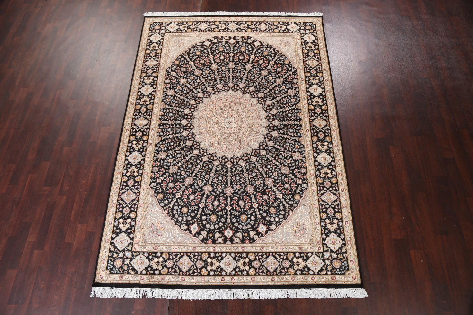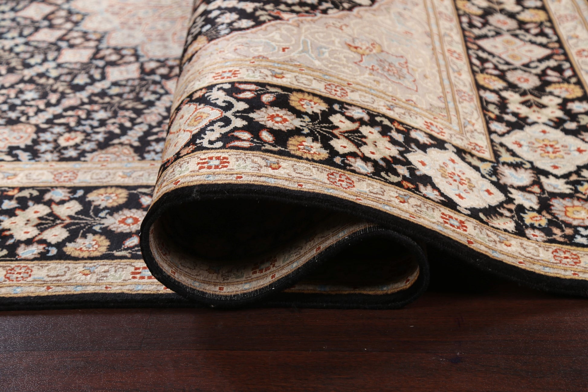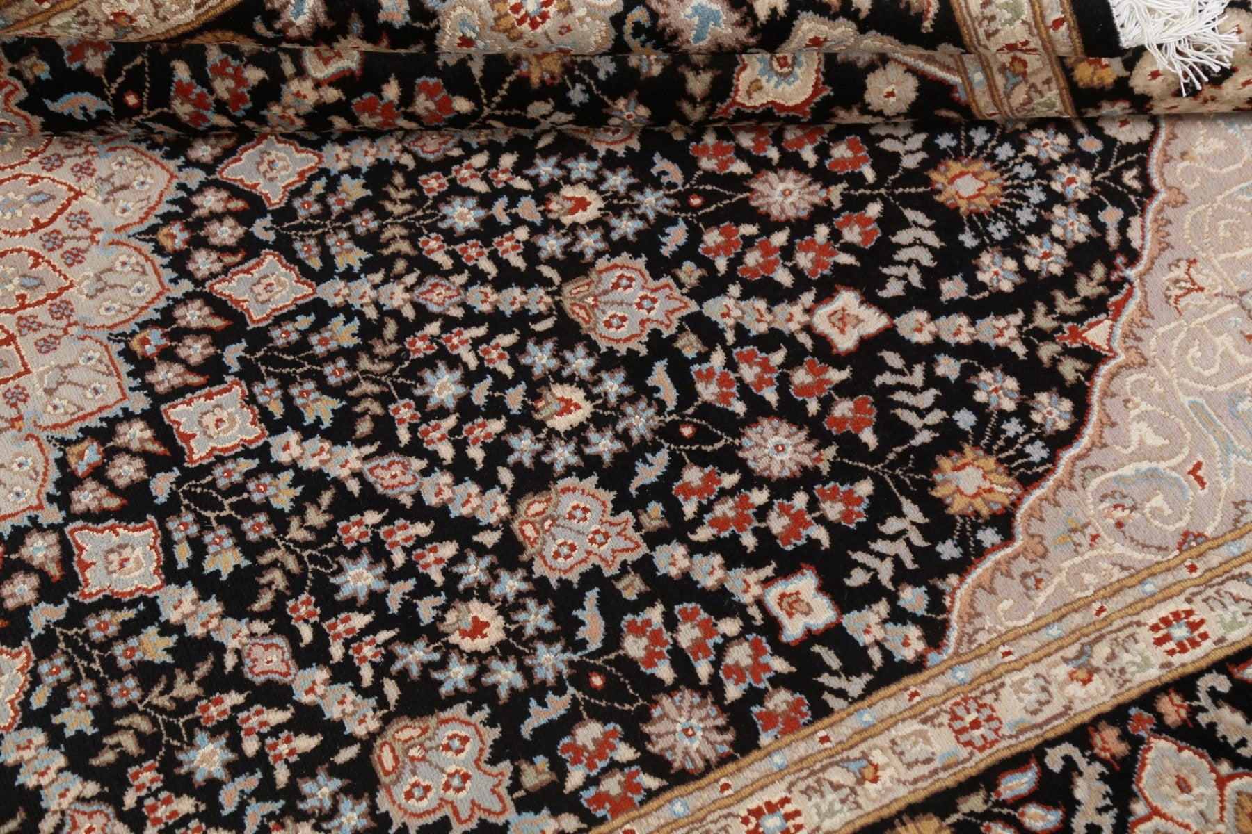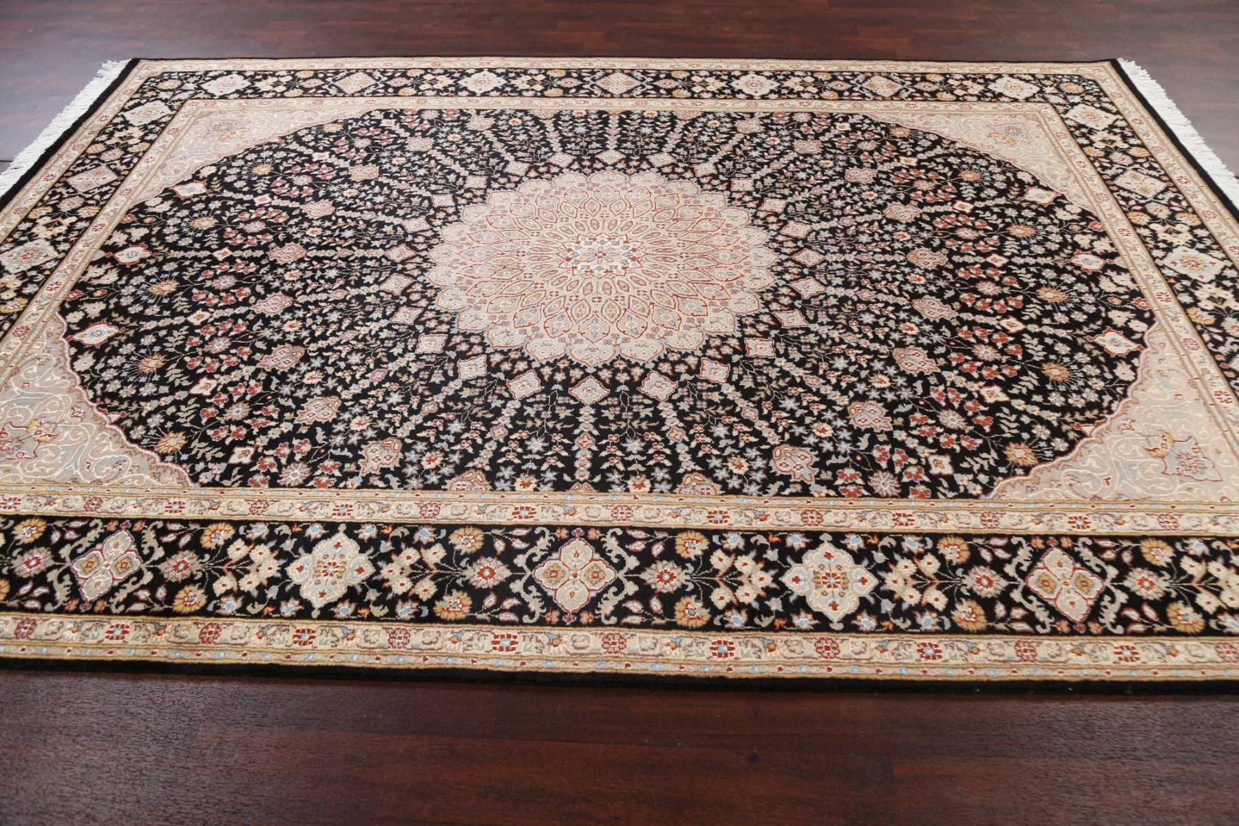 A Beautiful Genuine Pakistan Nain rug is Hand Knotted by skillful weavers in Pakistan with Wool & Silk Material. This rug is in New, First Quality condition. dimensions are 10' 3'' X 7' 0'' in foot and 312 X 213 in centimeter. the primary color is Black.