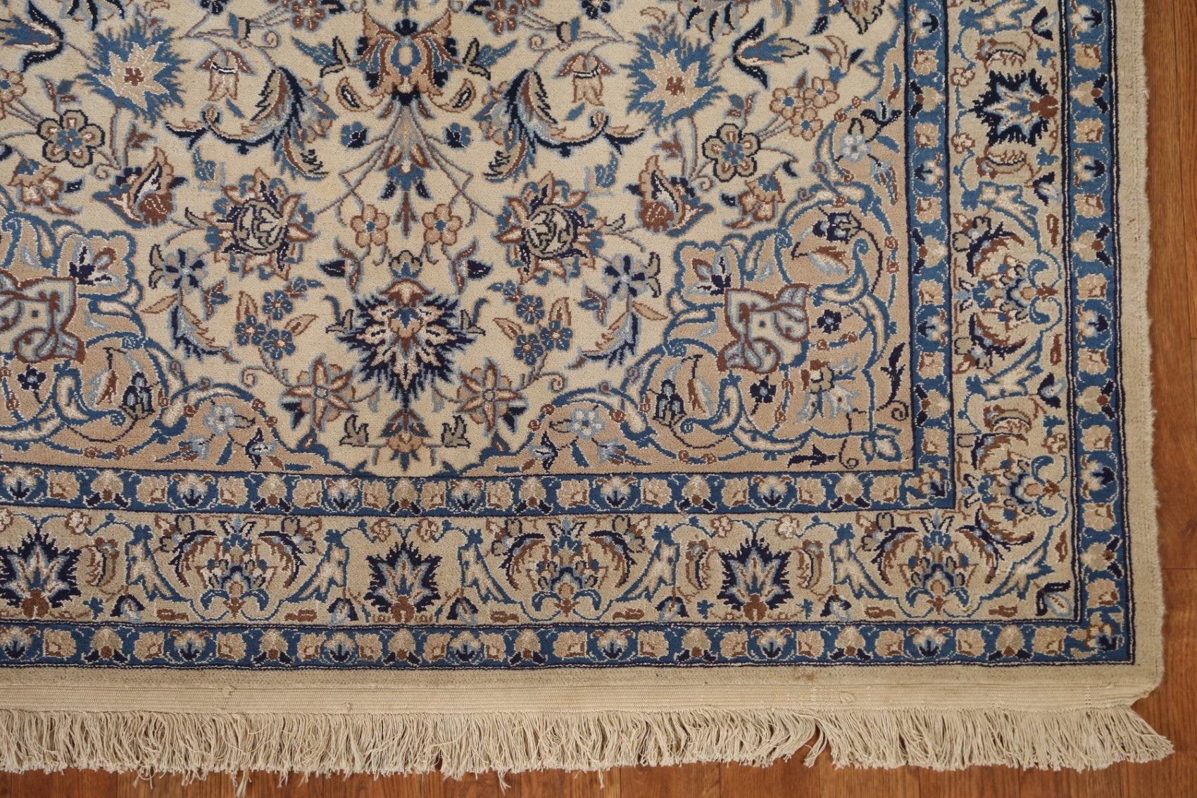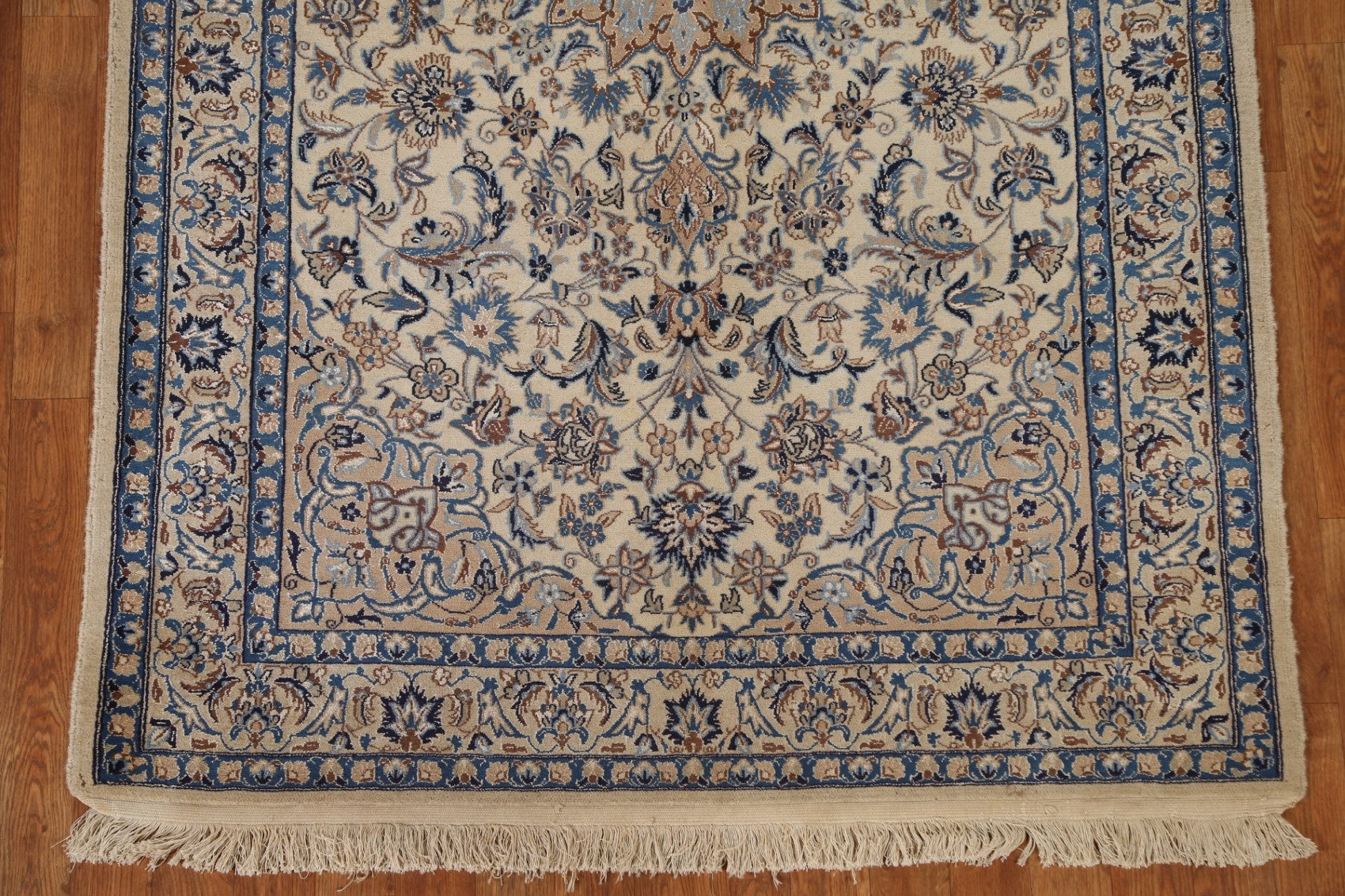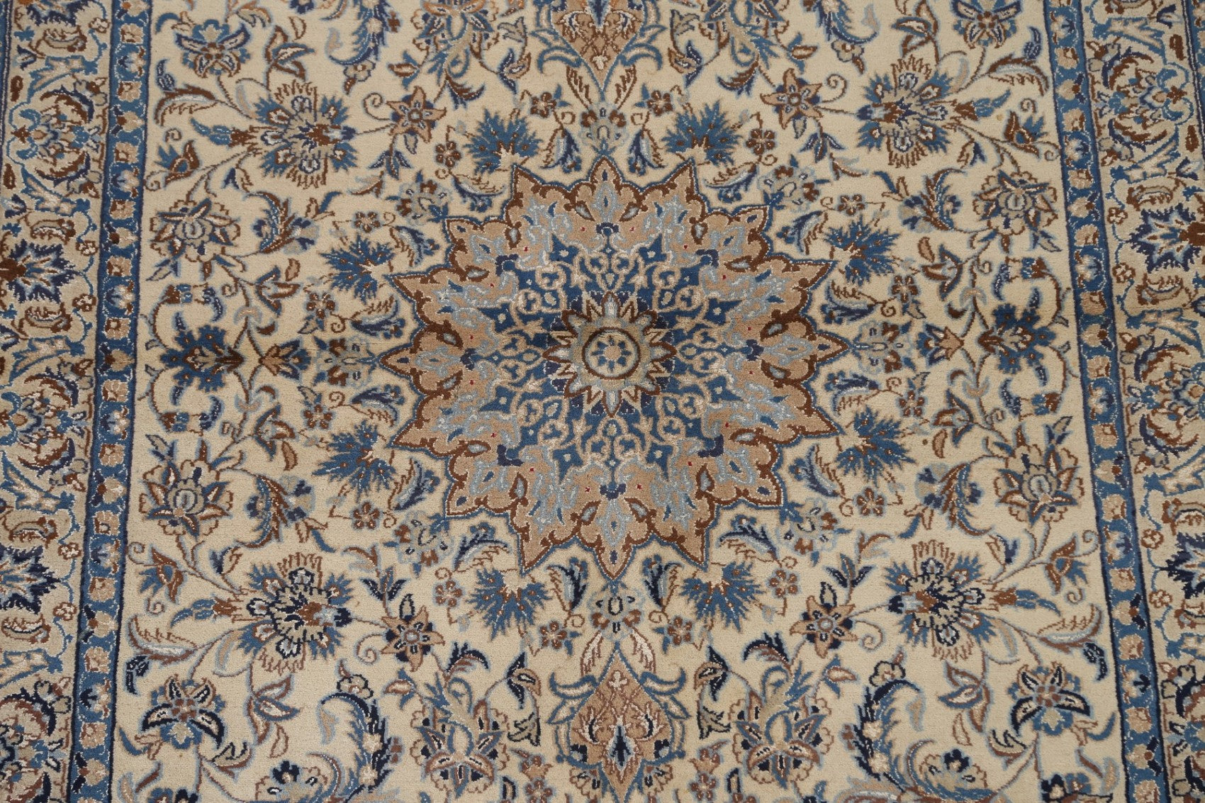 A Beautiful Genuine Persia ( Persia ) Nain rug is Hand Knotted by skillful weavers in Persia ( Persia ) with Wool & Silk Material. This rug is in Very Good condition. dimensions are 6' 11'' X 4' 4'' in foot and 211 X 132 in centimeter. the primary color is Beige & Ivories.