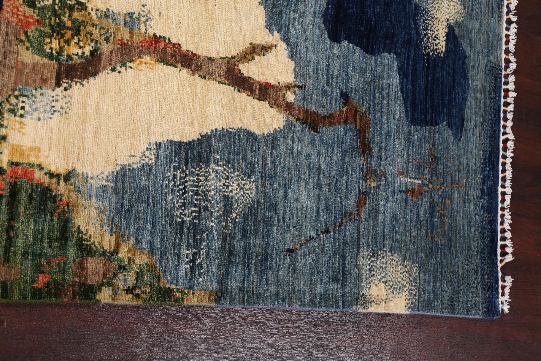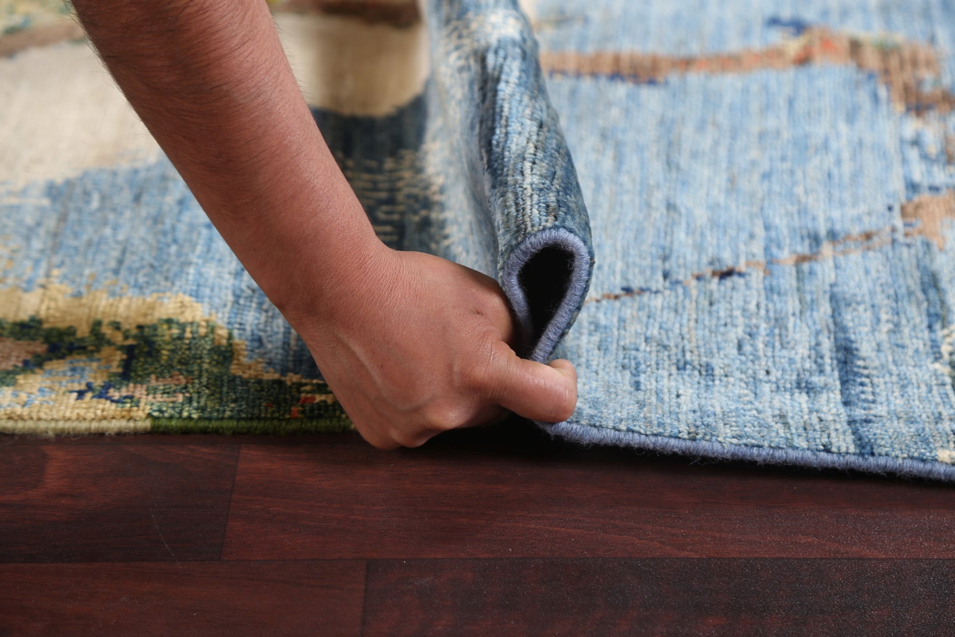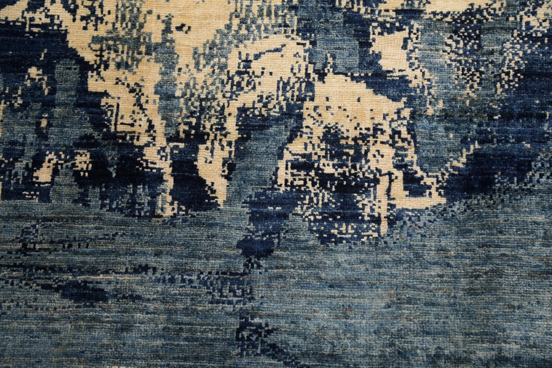 A Beautiful Genuine Pakistan Abstract rug is Hand Knotted by skillful weavers in Pakistan with 100% Wool Material. This rug is in New, First Quality condition. dimensions are 9' 10'' X 8' 3'' in foot and 300 X 251 in centimeter. the primary color is Navy Blue & Blues.