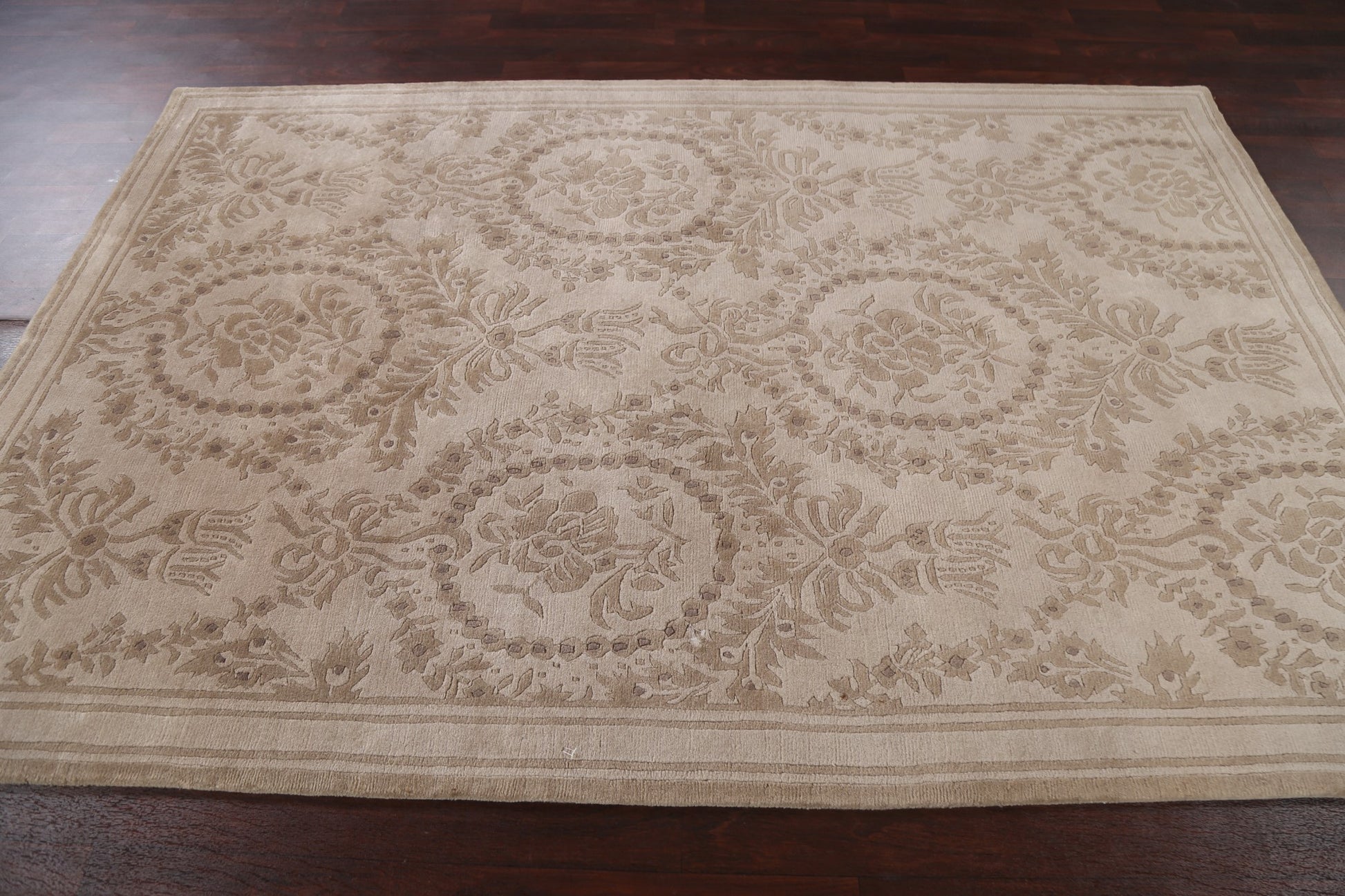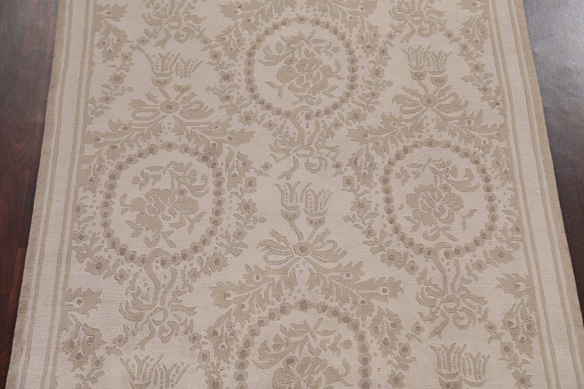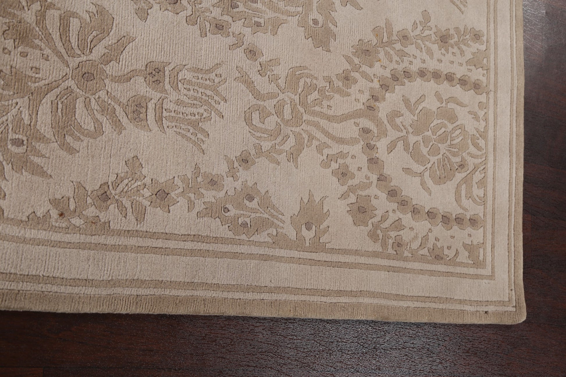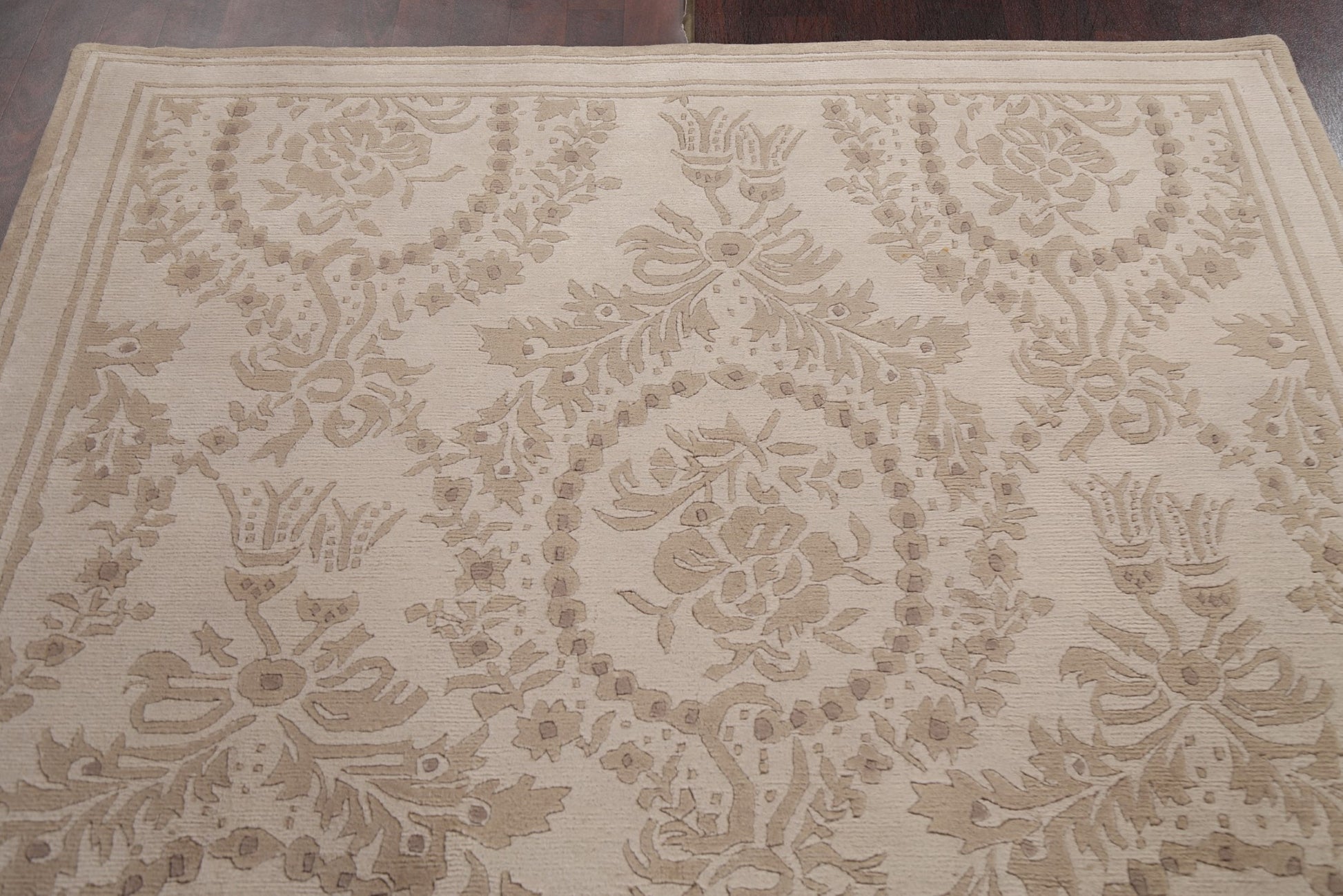 A Beautiful Genuine India Nepalese rug is Hand Knotted by skillful weavers in India with 100% Wool Material. This rug is in New, First Quality condition. dimensions are 8' 6'' X 5' 8'' in foot and 259 X 173 in centimeter. the primary color is Beige & Ivories.