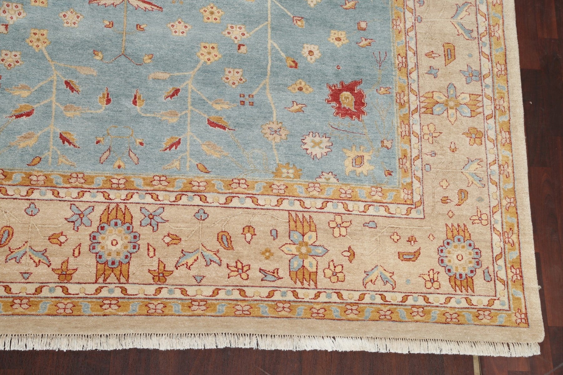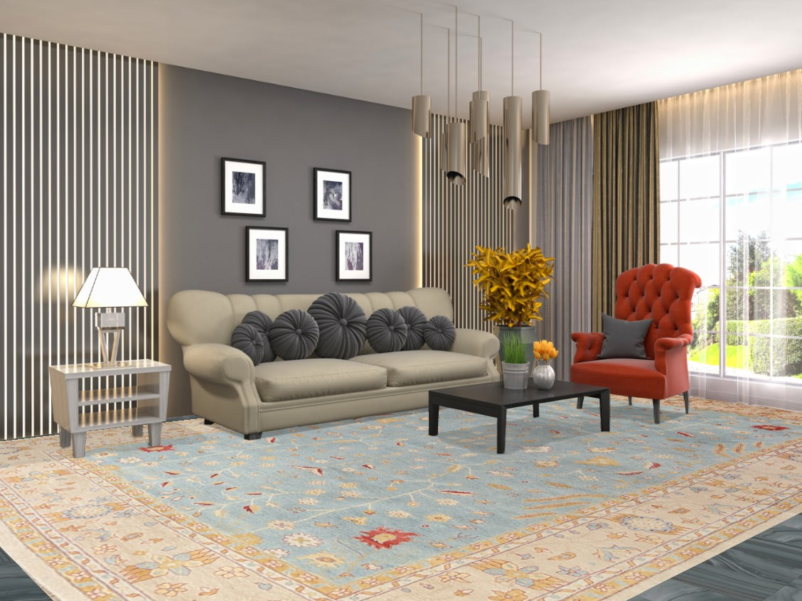 A Beautiful Genuine India Oushak rug is Hand Knotted by skillful weavers in India with 100% Wool Material. This rug is in New, First Quality condition. dimensions are 14' 9'' X 10' 0'' in foot and 450 X 305 in centimeter. the primary color is Navy Blue & Blues.