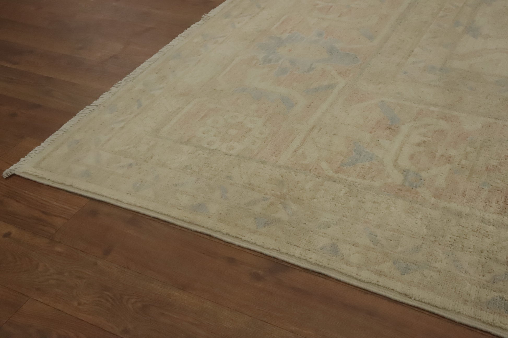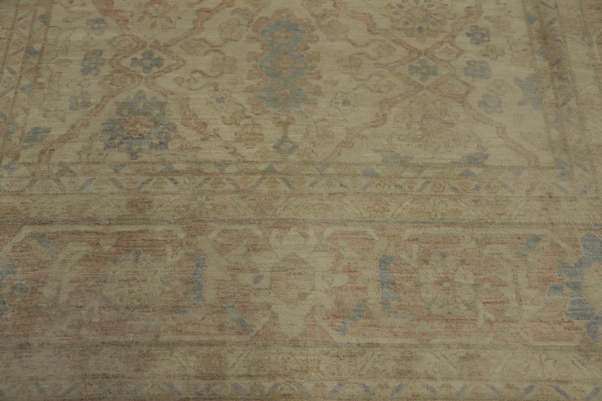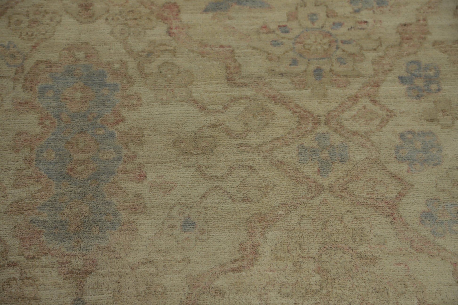 A Beautiful Genuine Pakistan Oushak rug is Hand Knotted by skillful weavers in Pakistan with 100% Wool Material. This rug is in New, First Quality condition. dimensions are 9' 7'' X 7' 1'' in foot and 292 X 216 in centimeter. the primary color is Beige & Ivories.