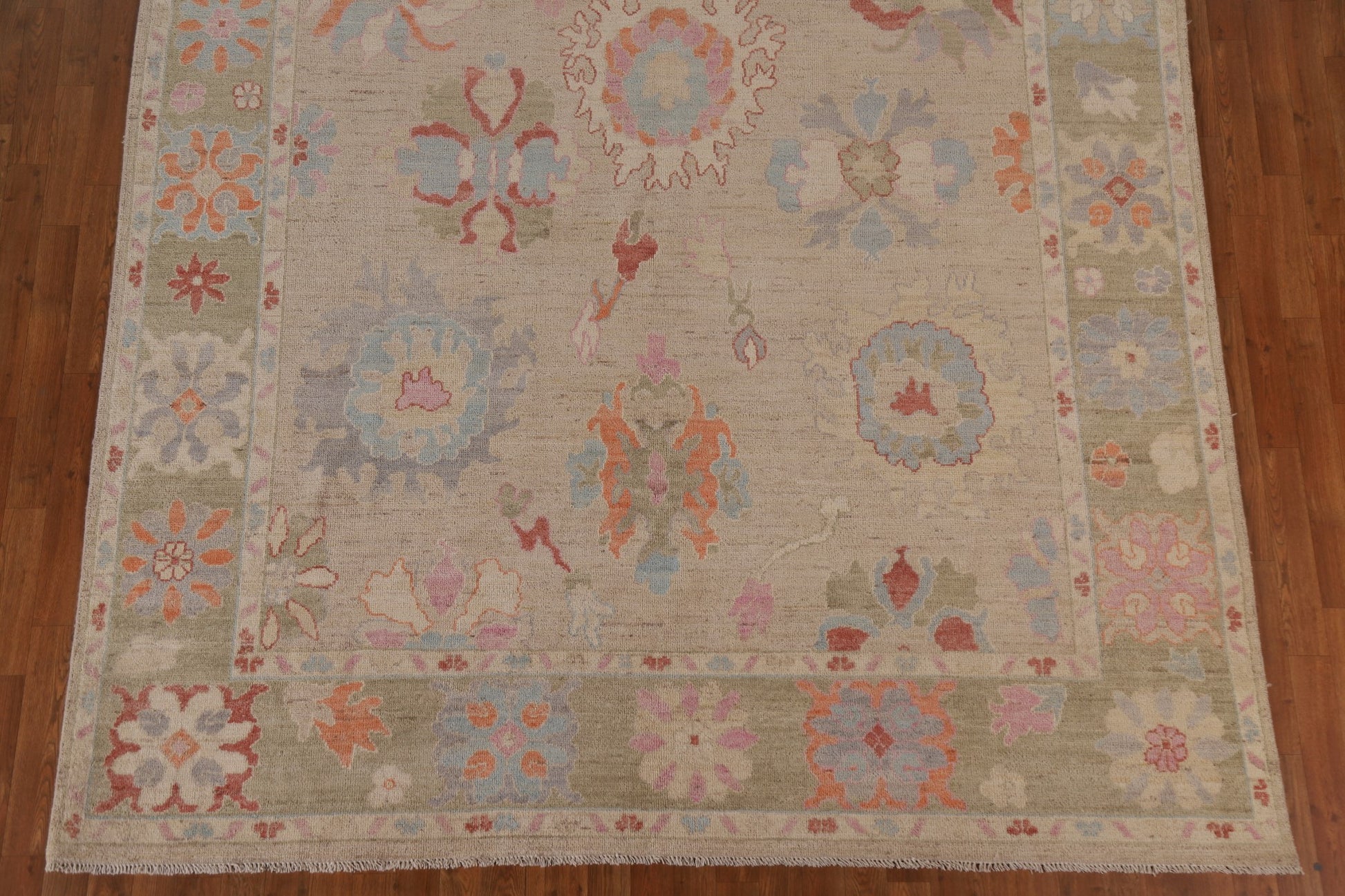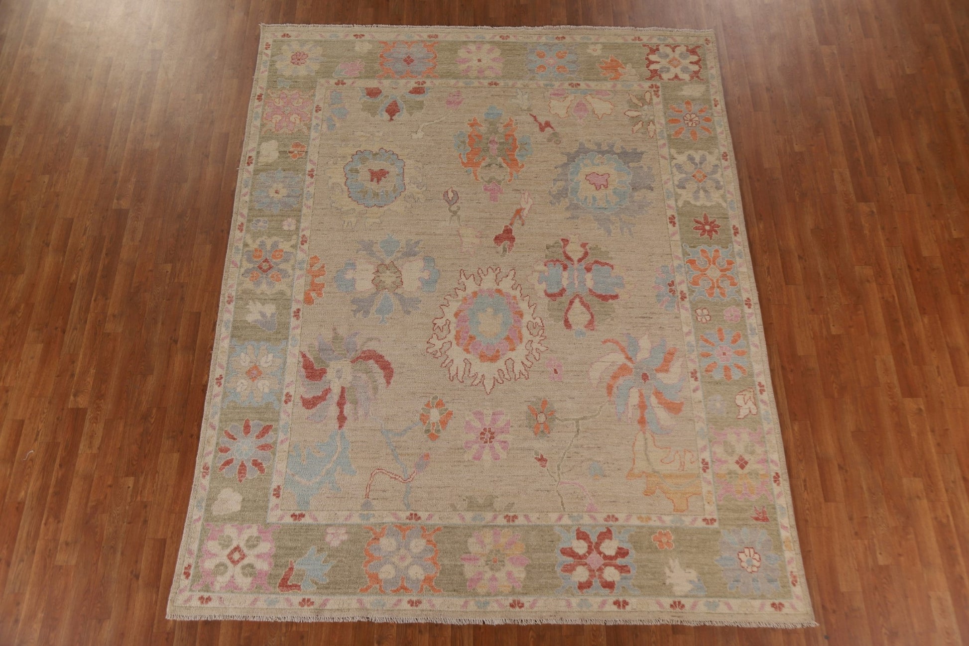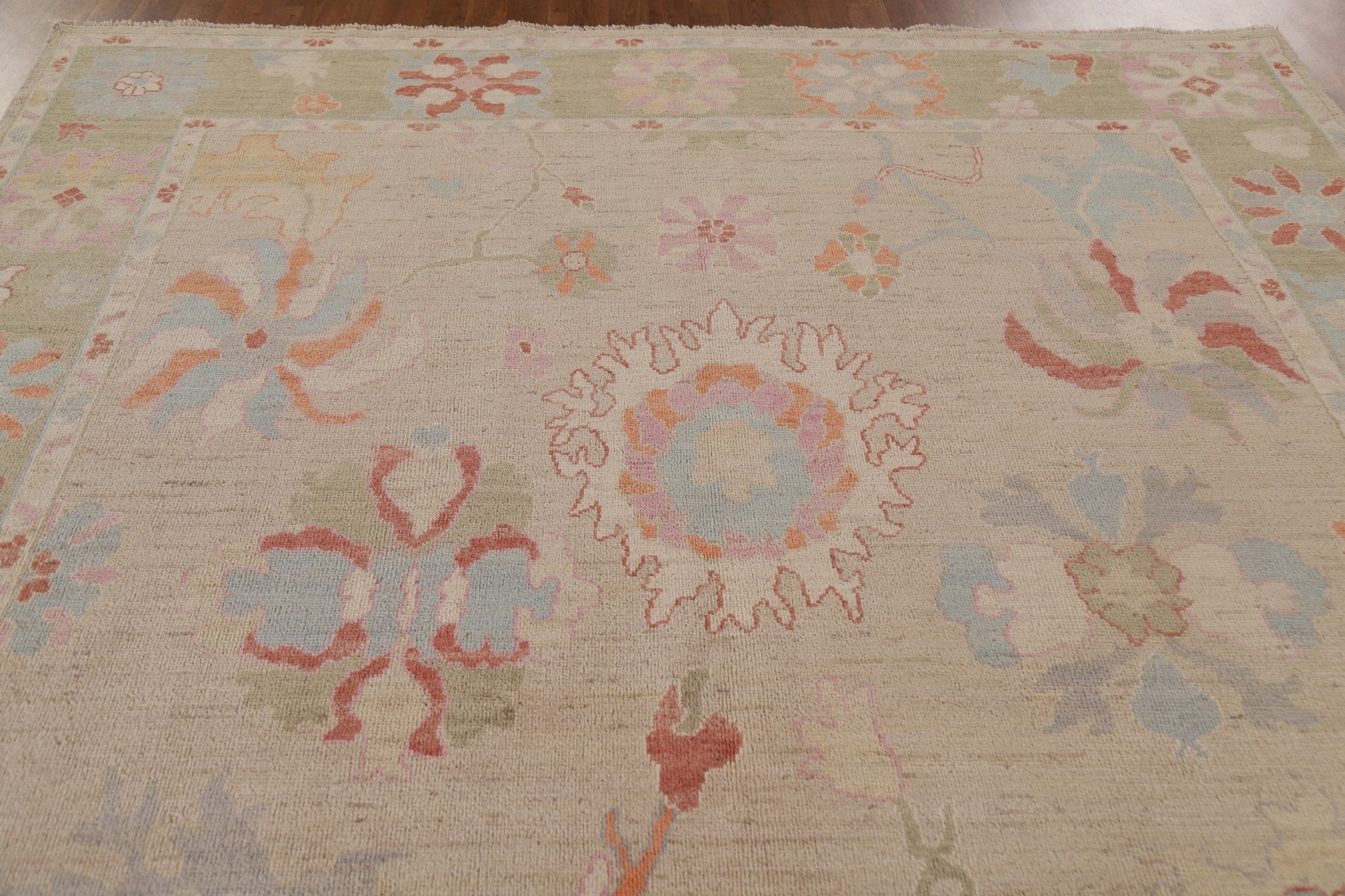 A Beautiful Genuine Turkey Oushak rug is Hand Knotted by skillful weavers in Turkey with 100% Wool Material. This rug is in New, First Quality condition. dimensions are 9' 11'' X 7' 11'' in foot and 302 X 241 in centimeter. the primary color is Beige & Ivories.