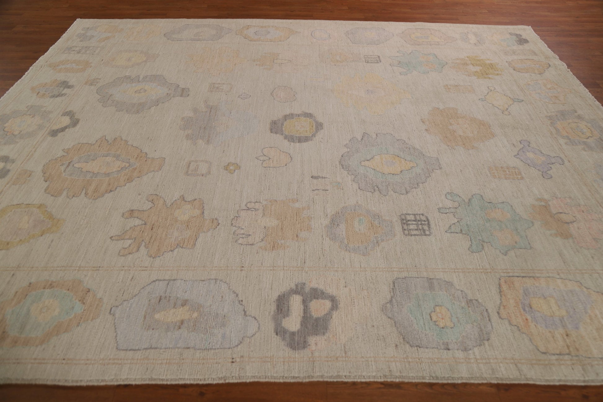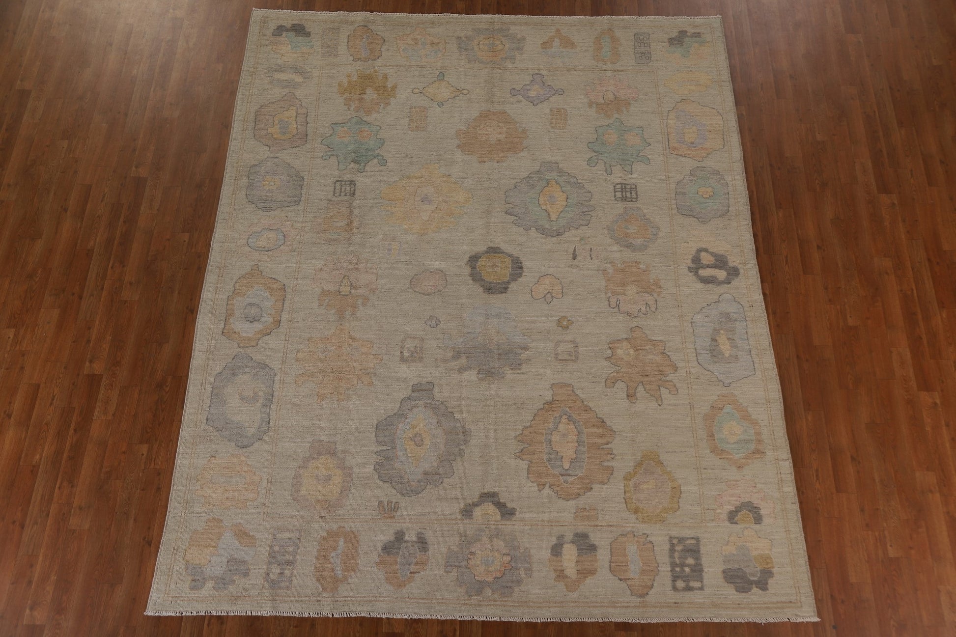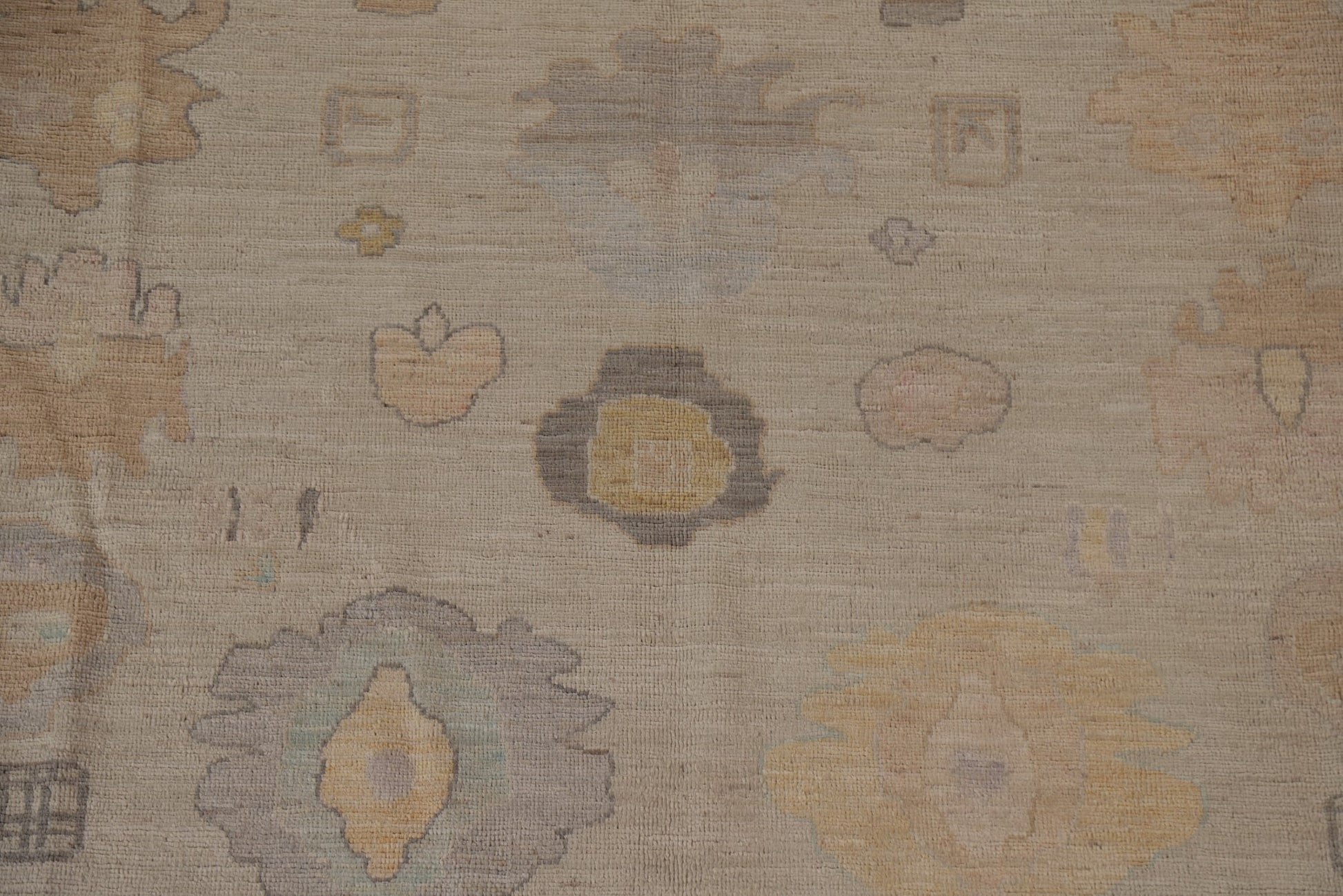 A Beautiful Genuine Turkey Oushak rug is Hand Knotted by skillful weavers in Turkey with 100% Wool Material. This rug is in condition. dimensions are 9' 10'' X 8' 2'' in foot and 300 X 249 in centimeter. the primary color is Beige & Ivories.