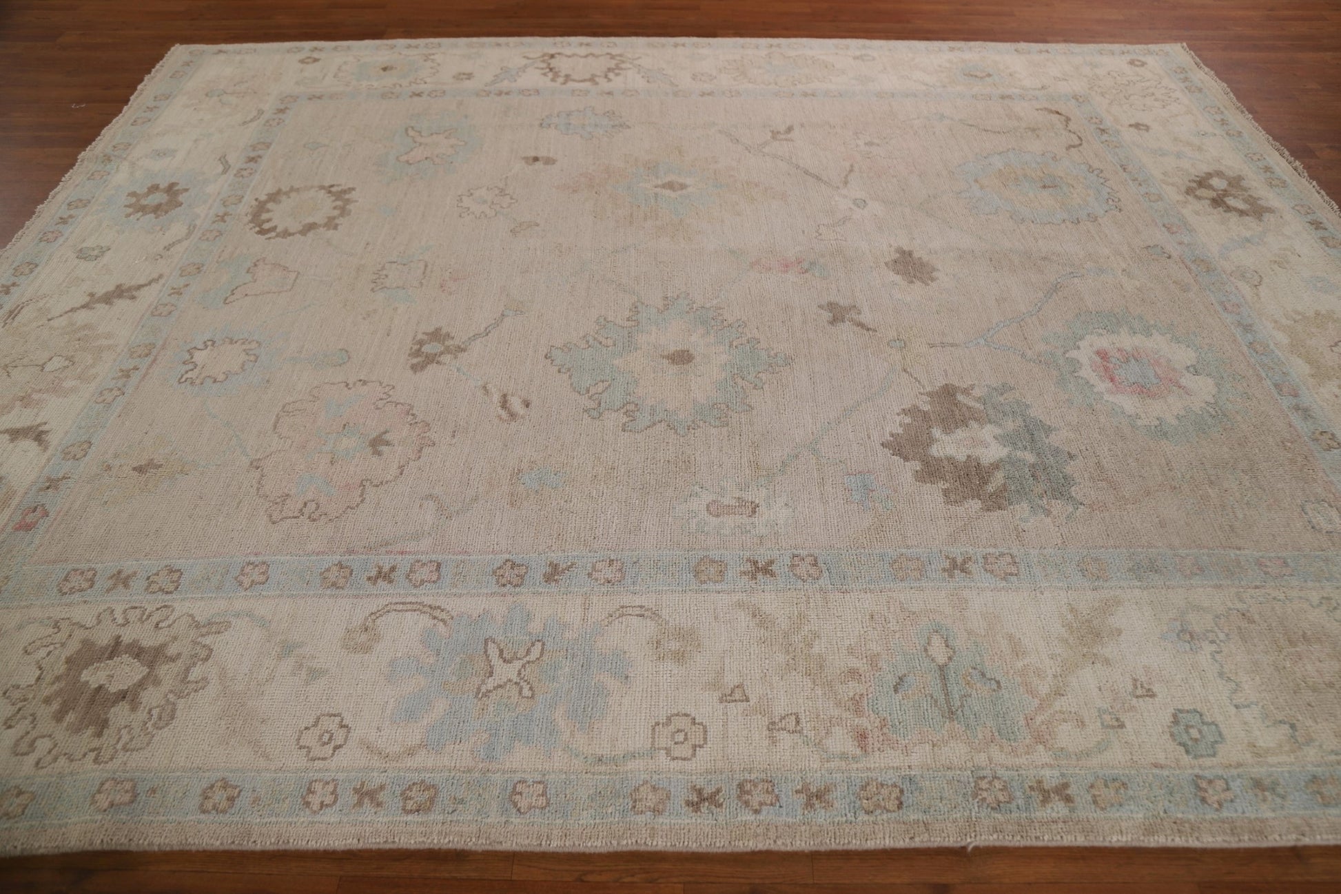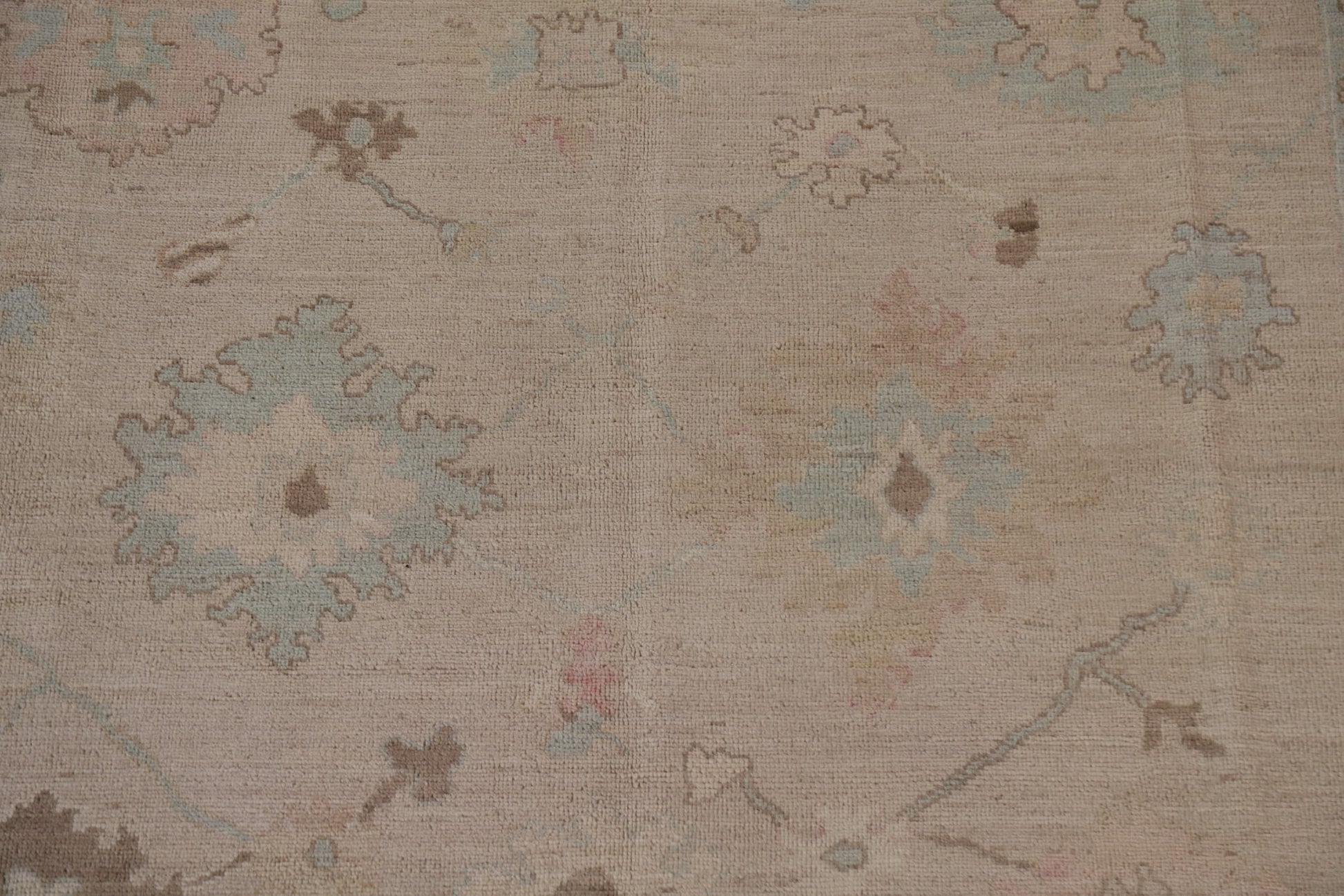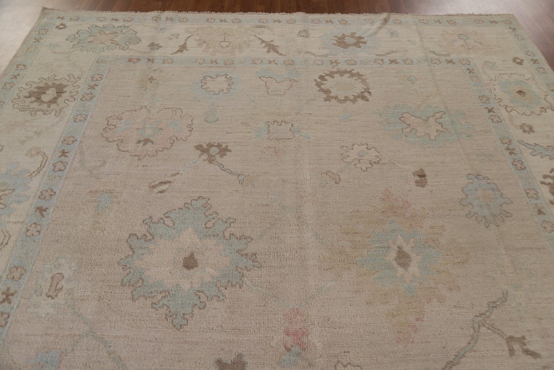 A Beautiful Genuine Turkey Oushak rug is Hand Knotted by skillful weavers in Turkey with 100% Wool Material. This rug is in New, First Quality condition. dimensions are 9' 9'' X 8' 0'' in foot and  297 X 244 in centimeter. the primary color is Beige & Ivories.