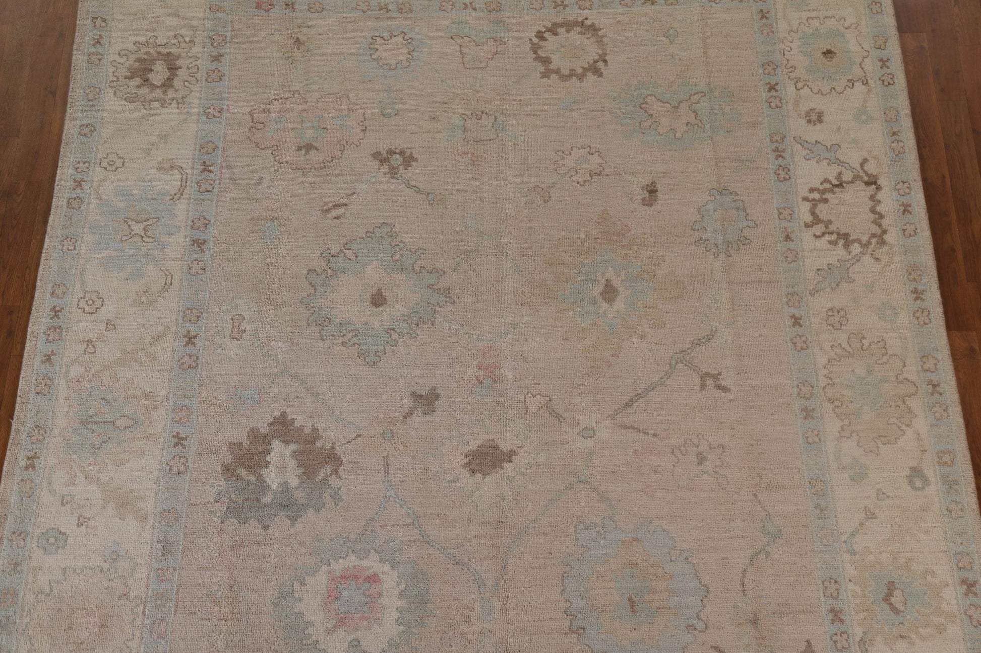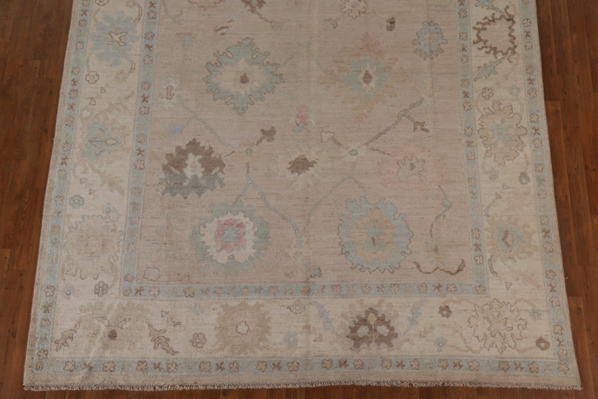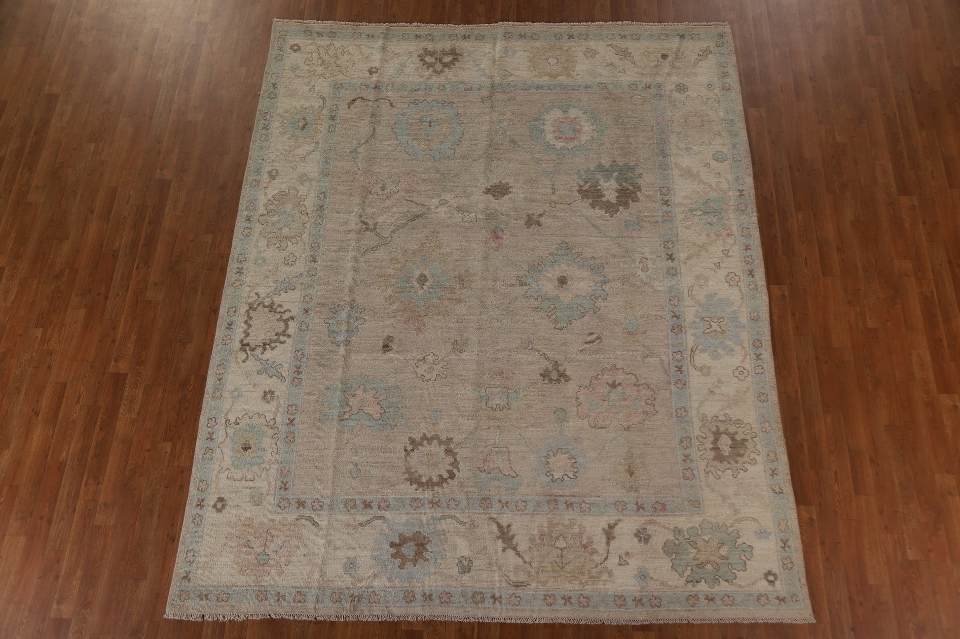 A Beautiful Genuine Turkey Oushak rug is Hand Knotted by skillful weavers in Turkey with 100% Wool Material. This rug is in New, First Quality condition. dimensions are 9' 9'' X 8' 0'' in foot and  297 X 244 in centimeter. the primary color is Beige & Ivories.