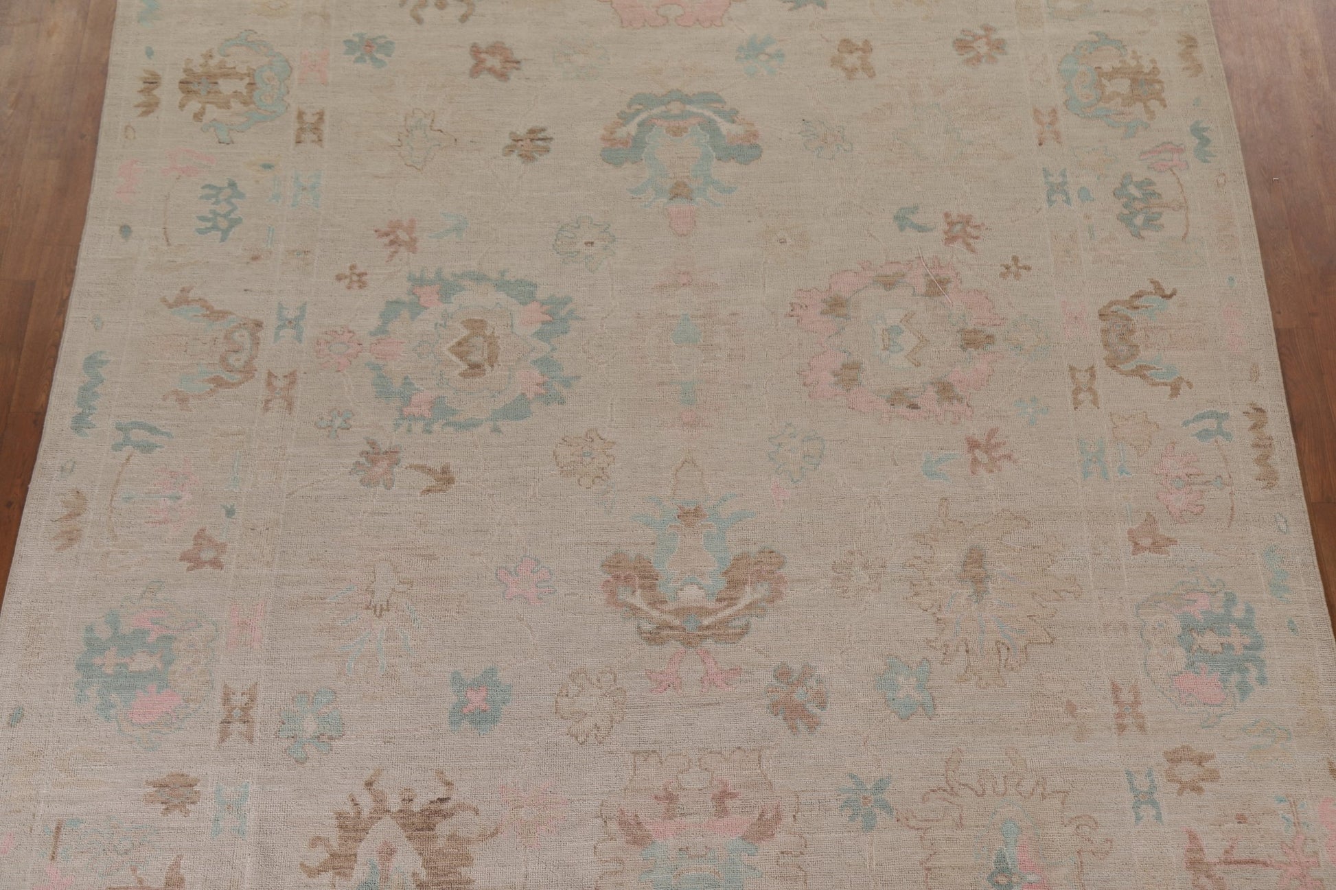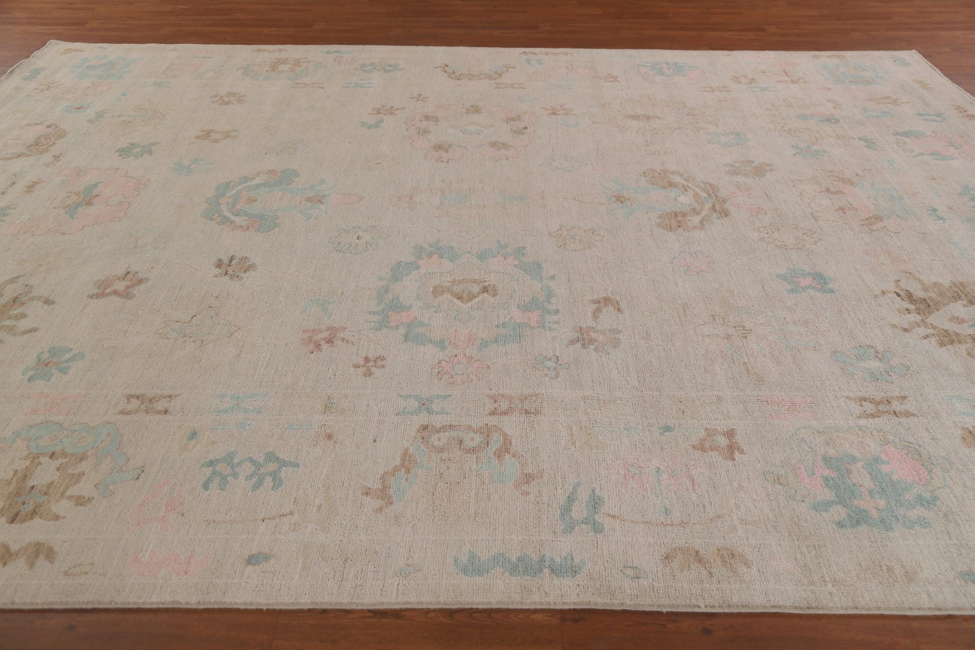 A Beautiful Genuine Turkey Oushak rug is Hand Knotted by skillful weavers in Turkey with 100% Wool Material. This rug is in New, First Quality condition. dimensions are 11' 10'' X 8' 11'' in foot and 361 X 272 in centimeter. the primary color is Beige & Ivories.