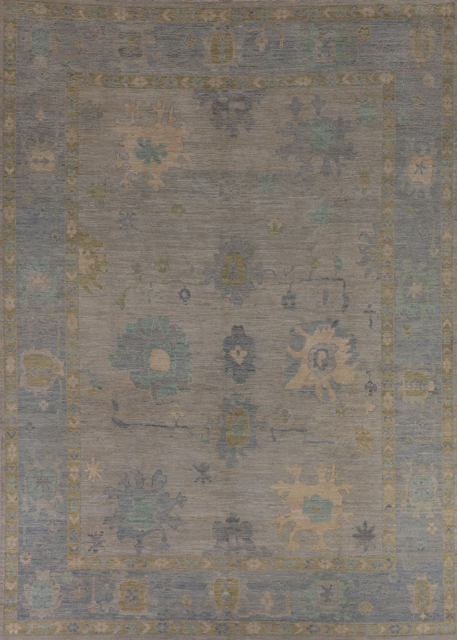 A Beautiful Genuine Turkey Oushak rug is Hand Knotted by skillful weavers in Turkey with 100% Wool Material. This rug is in New, First Quality condition. dimensions are 11' 8'' X 8' 11'' in foot and 356 X 272 in centimeter. the primary color is Greys & Charcoal.