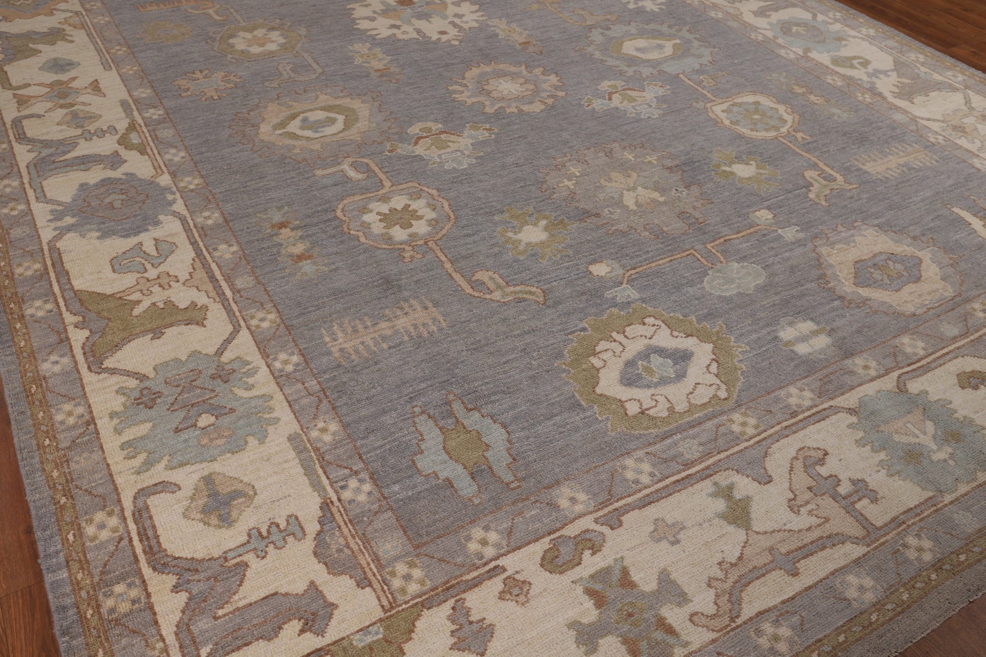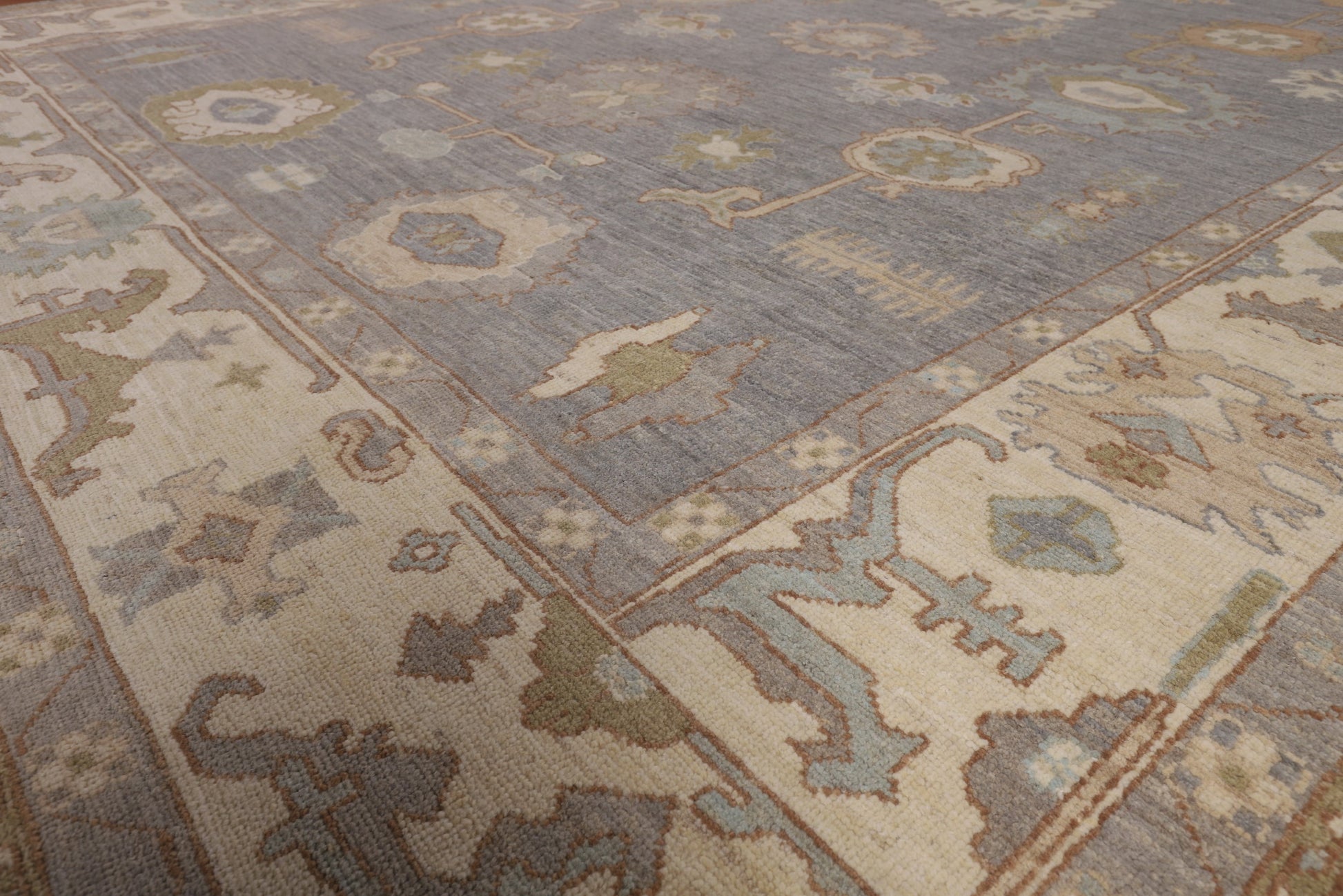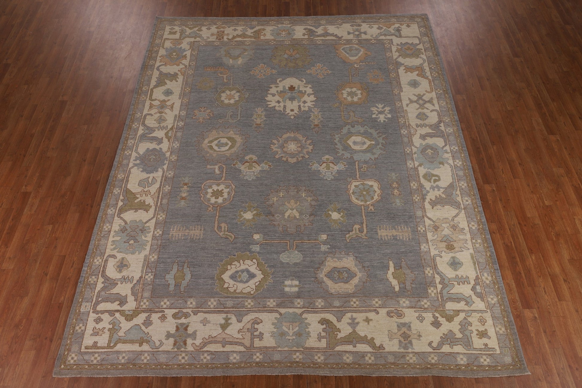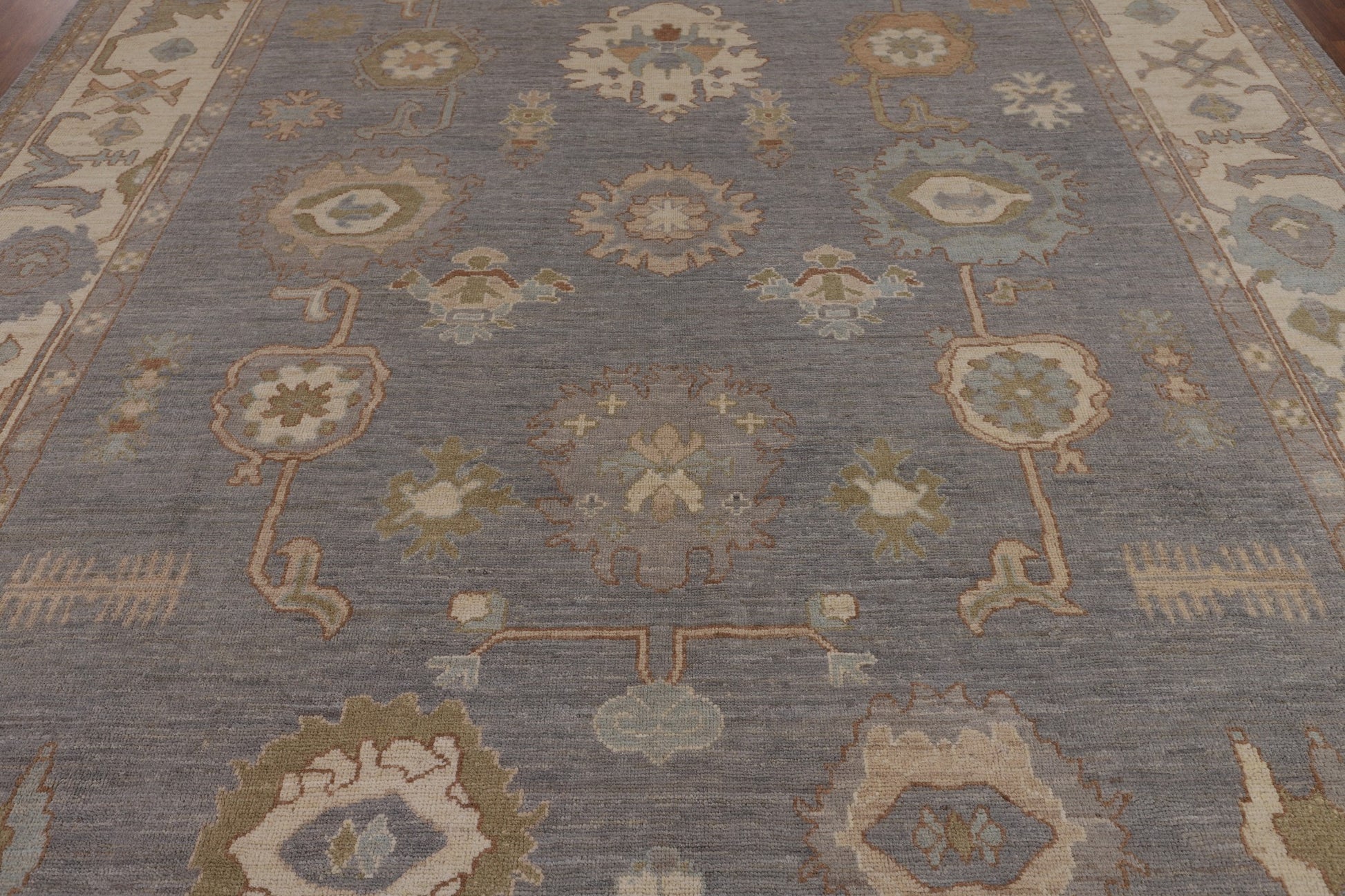 A Beautiful Genuine Turkey Oushak rug is Hand Knotted by skillful weavers in Turkey with 100% Wool Material. This rug is in New, First Quality condition. dimensions are 11' 9'' X 9' 5'' in foot and 358 X 287 in centimeter. the primary color is Greys & Charcoal.