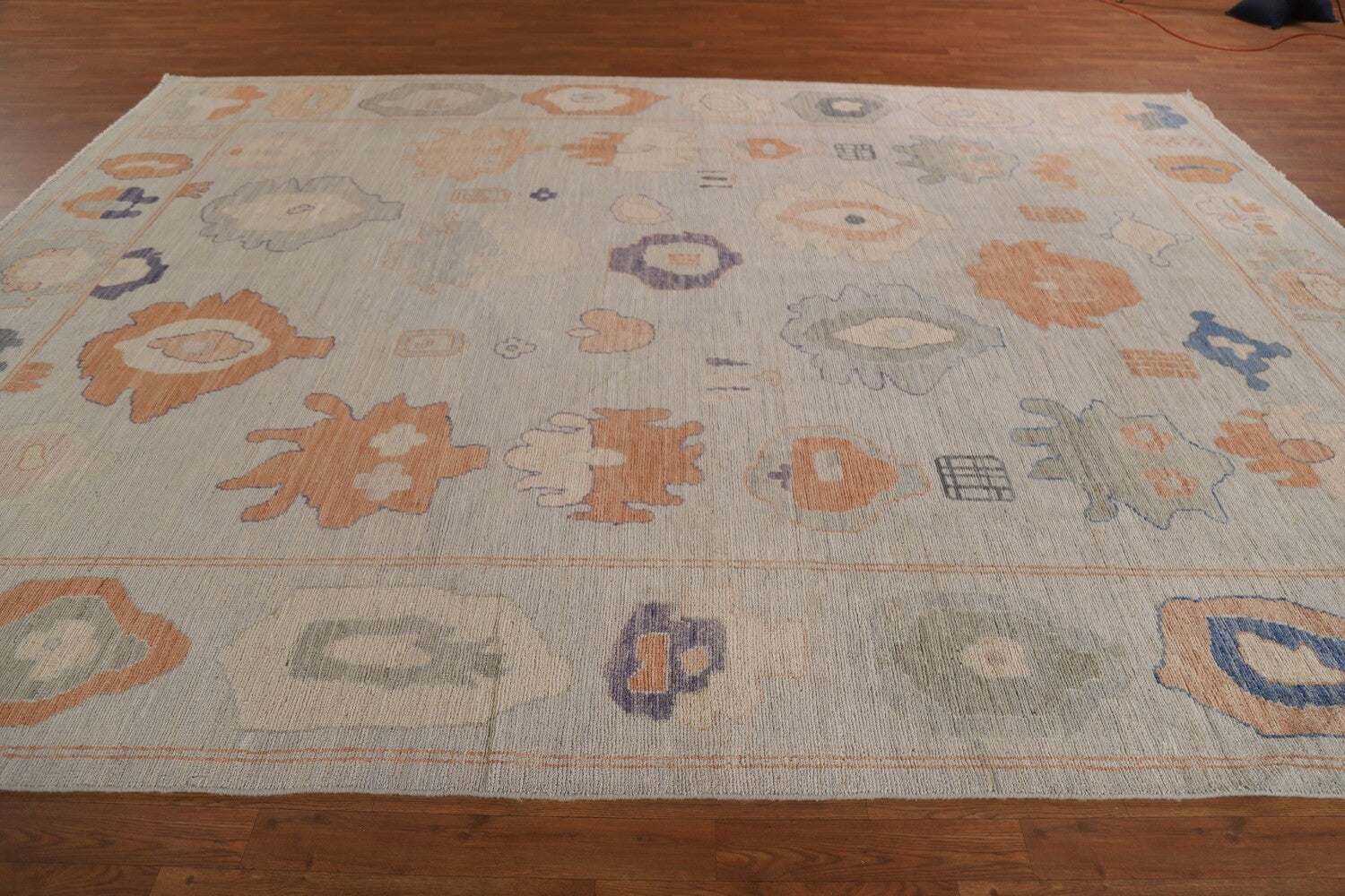 A Beautiful Genuine Turkey Oushak rug is Hand Knotted by skillful weavers in Turkey with 100% Wool Material. This rug is in New, First Quality condition. dimensions are 11' 11'' X 8' 10'' in foot and 363 X 269 in centimeter. the primary color is Greys & Charcoal.