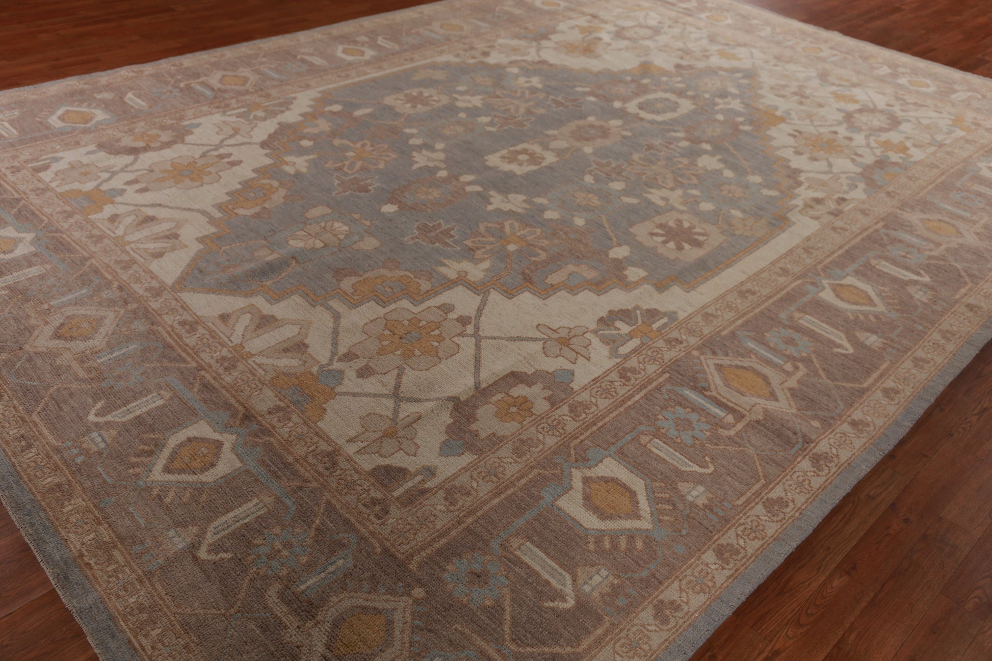 A Beautiful Genuine Turkey Oushak rug is Hand Knotted by skillful weavers in Turkey with 100% Wool Material. This rug is in New, First Quality condition. dimensions are 14' 3'' X 10' 0'' in foot and 434 X 305 in centimeter. the primary color is Greys & Charcoal.