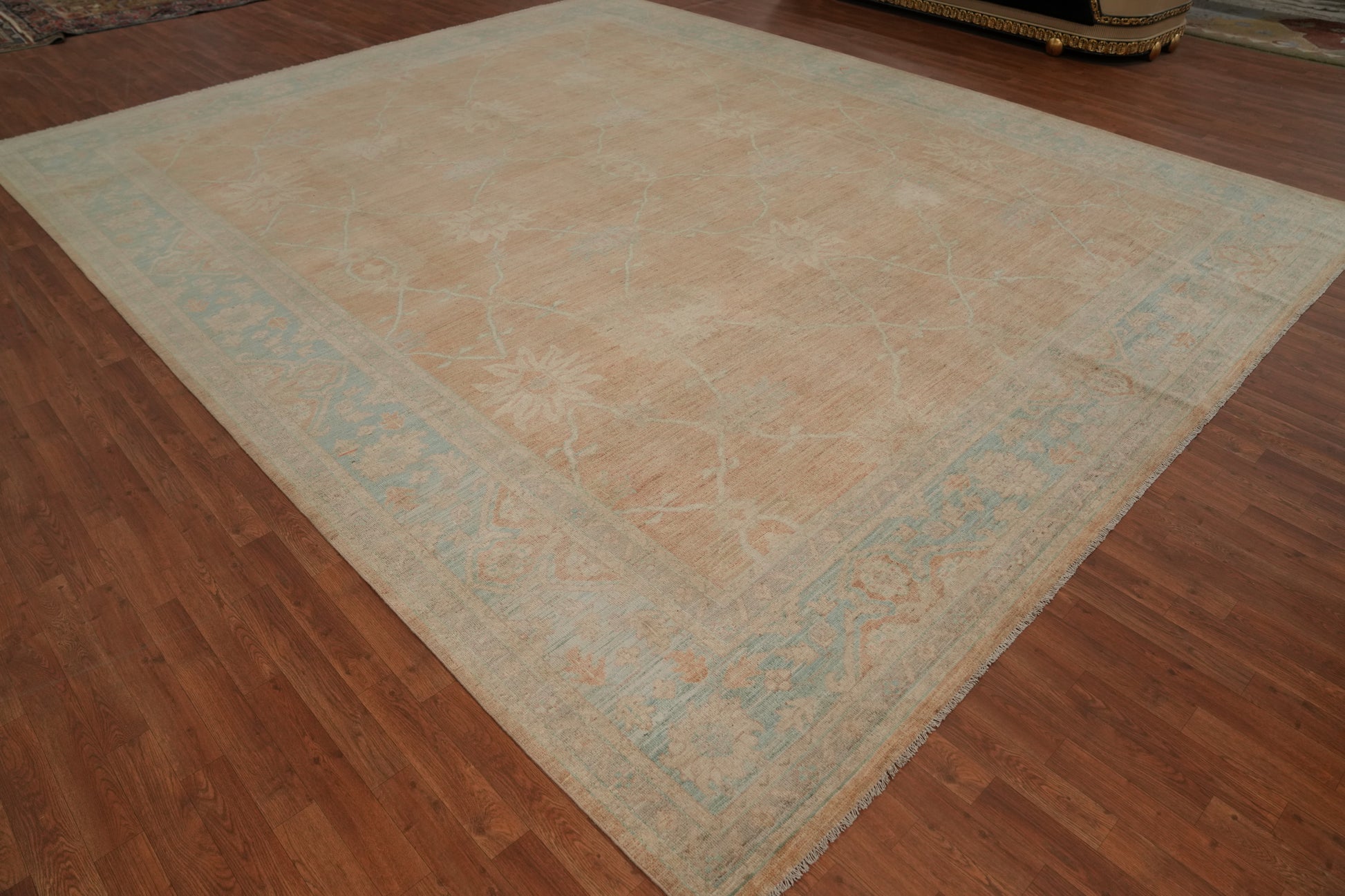 A Beautiful Genuine Pakistan Oushak rug is Hand Knotted by skillful weavers in Pakistan with 100% Wool Material. This rug is in New, First Quality condition. dimensions are 15' 0'' X 12' 3'' in foot and 457 X 373 in centimeter. the primary color is Oranges & Rust.