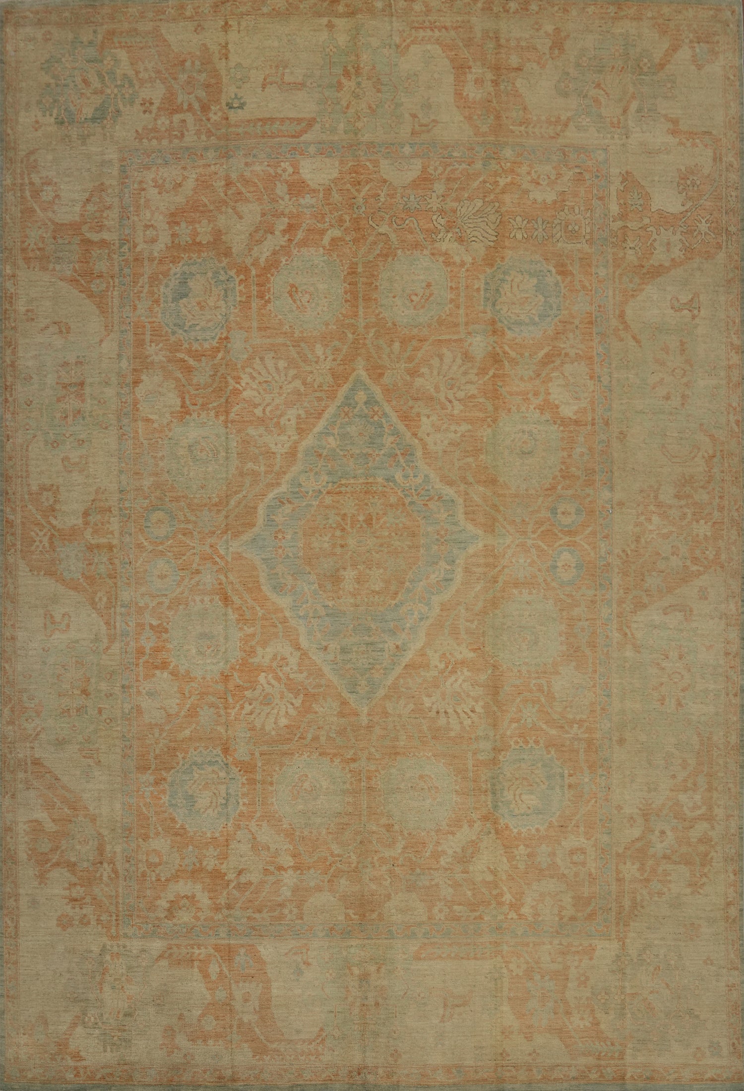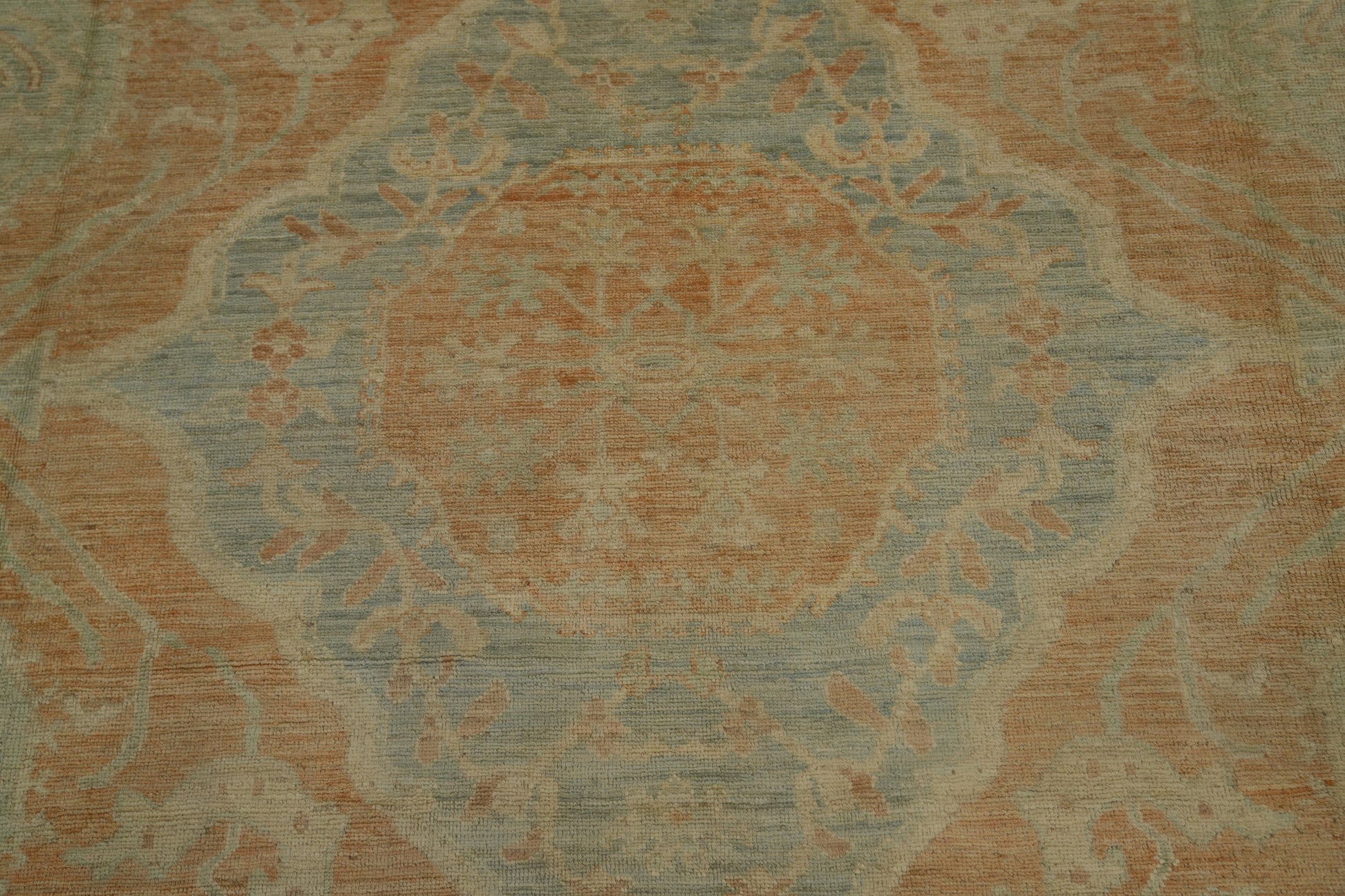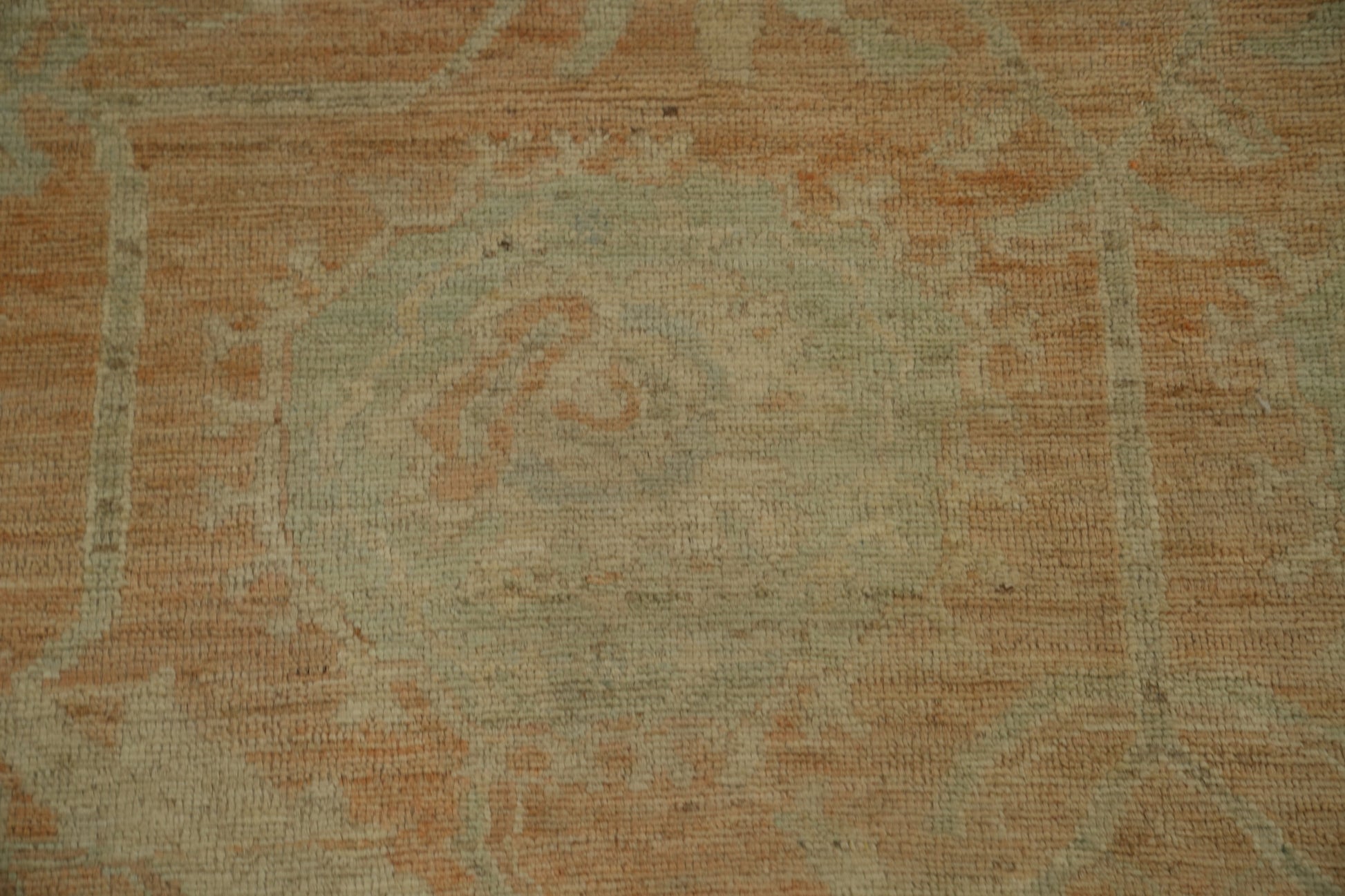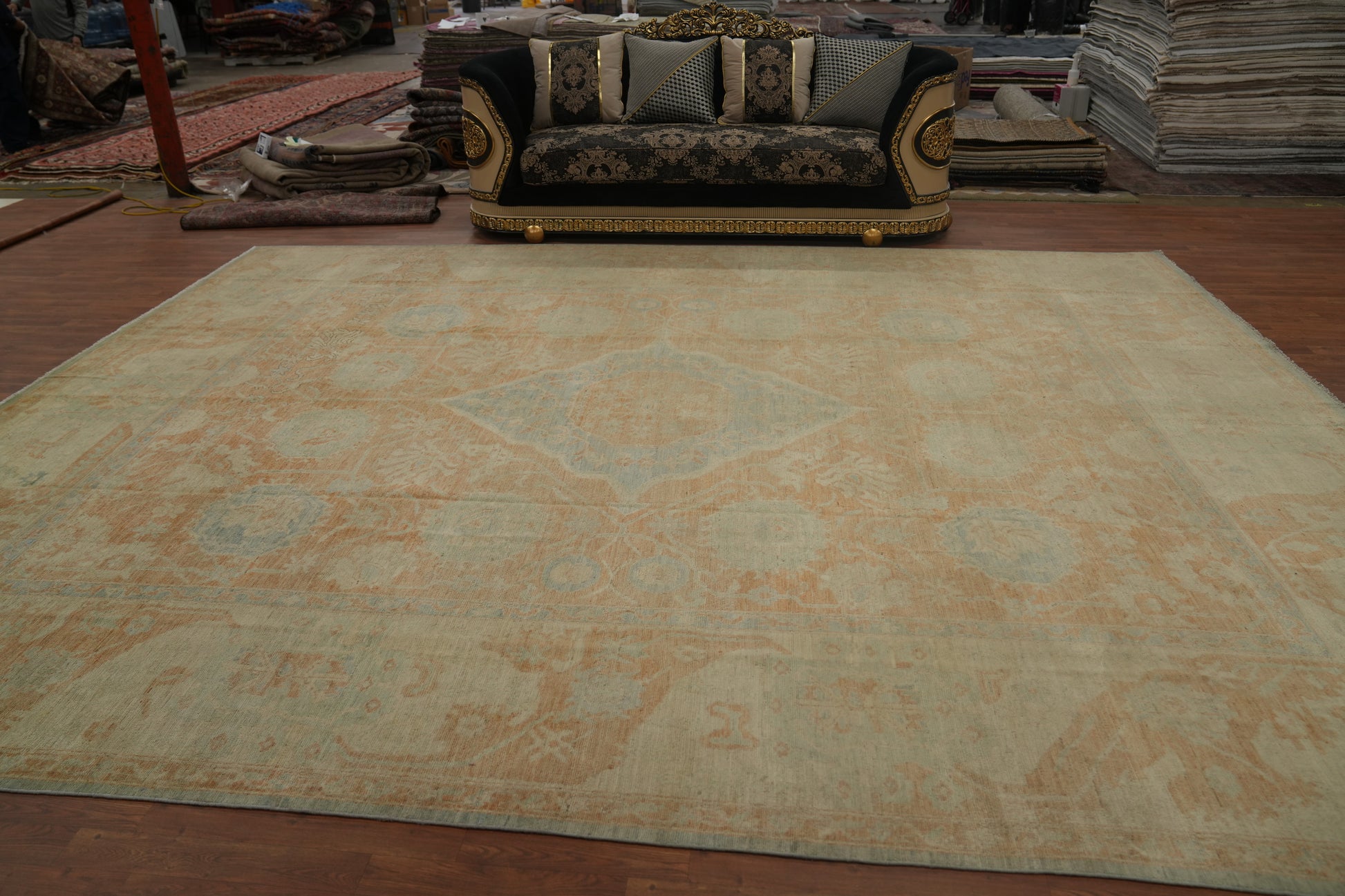 A Beautiful Genuine Pakistan Oushak rug is Hand Knotted by skillful weavers in Pakistan with 100% Wool Material. This rug is in New, First Quality condition. dimensions are 14' 10'' X 12' 0'' in foot and 452 X 366 in centimeter. the primary color is Oranges & Rust.
