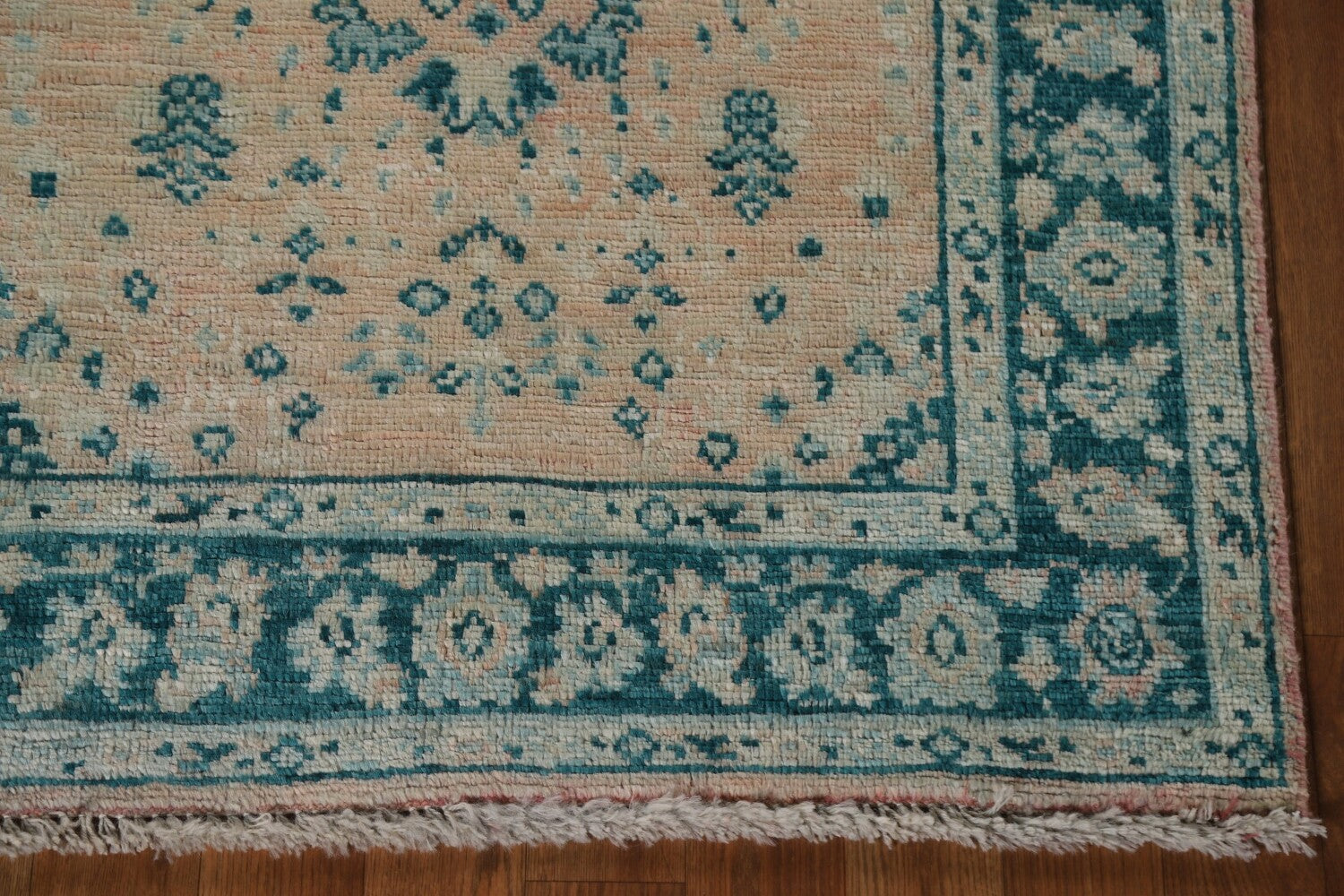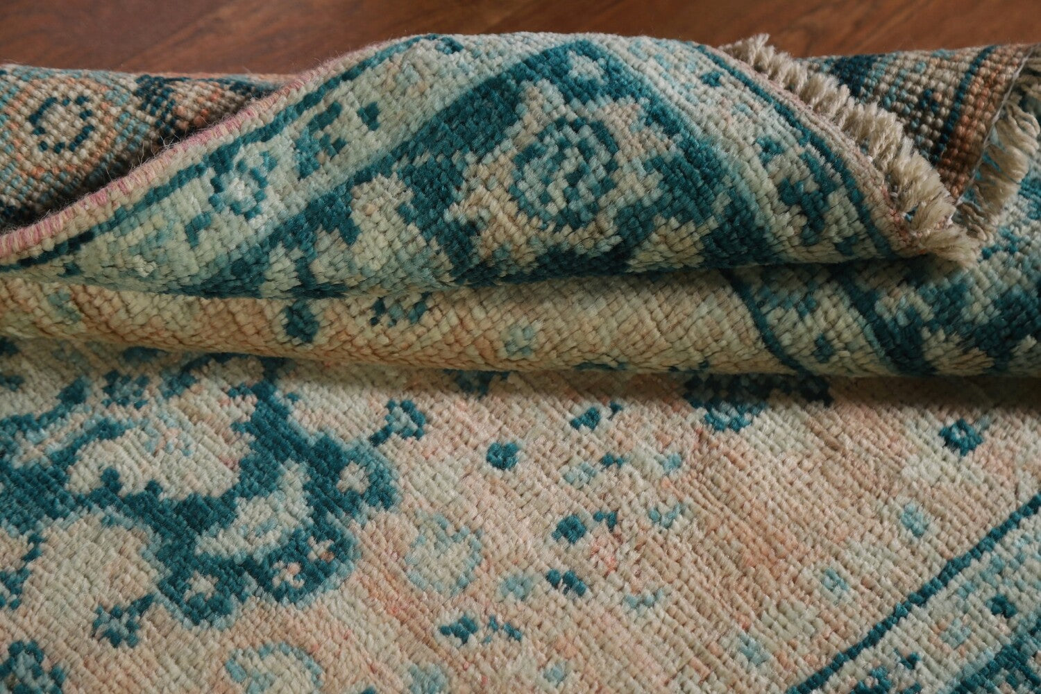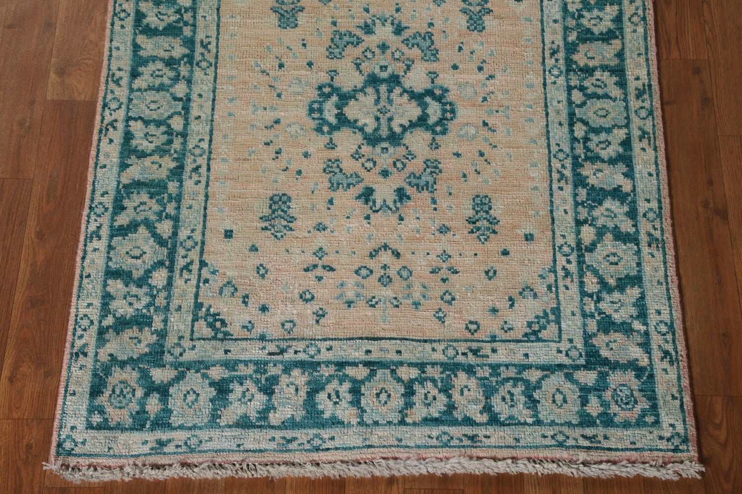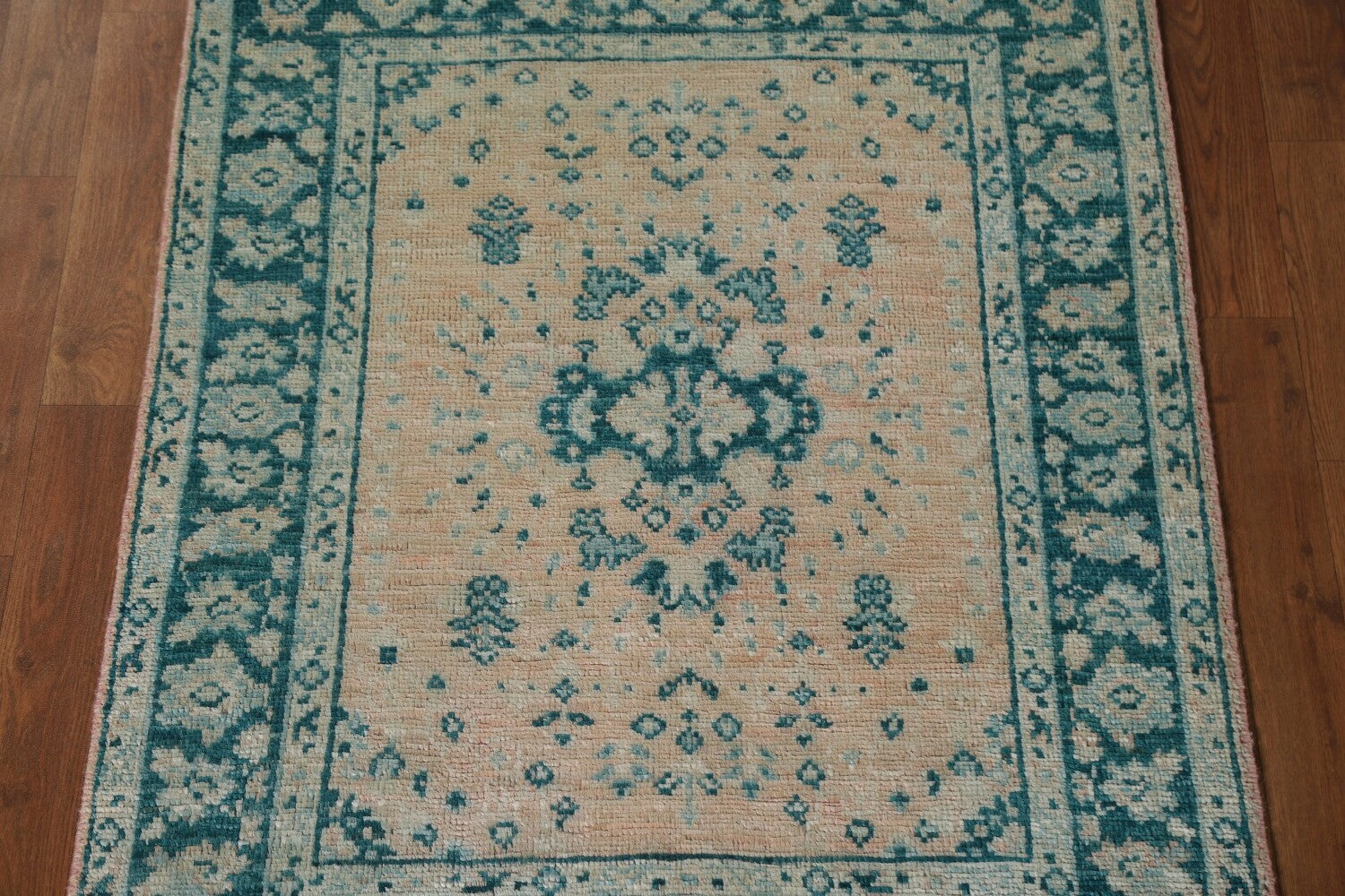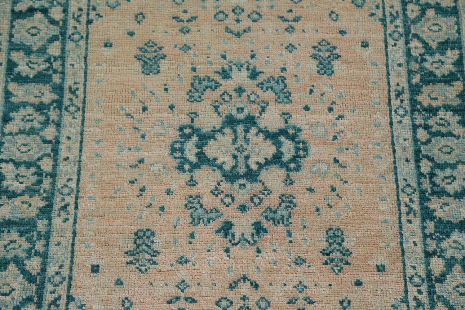 A Beautiful Genuine Turkey Oushak rug is Hand Knotted by skillful weavers in Turkey with 100% Wool Material. This rug is in New, First Quality condition. dimensions are 3' 10'' X 3' 0'' in foot and 117 X 91 in centimeter. the primary color is Peach.