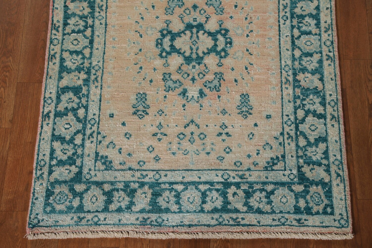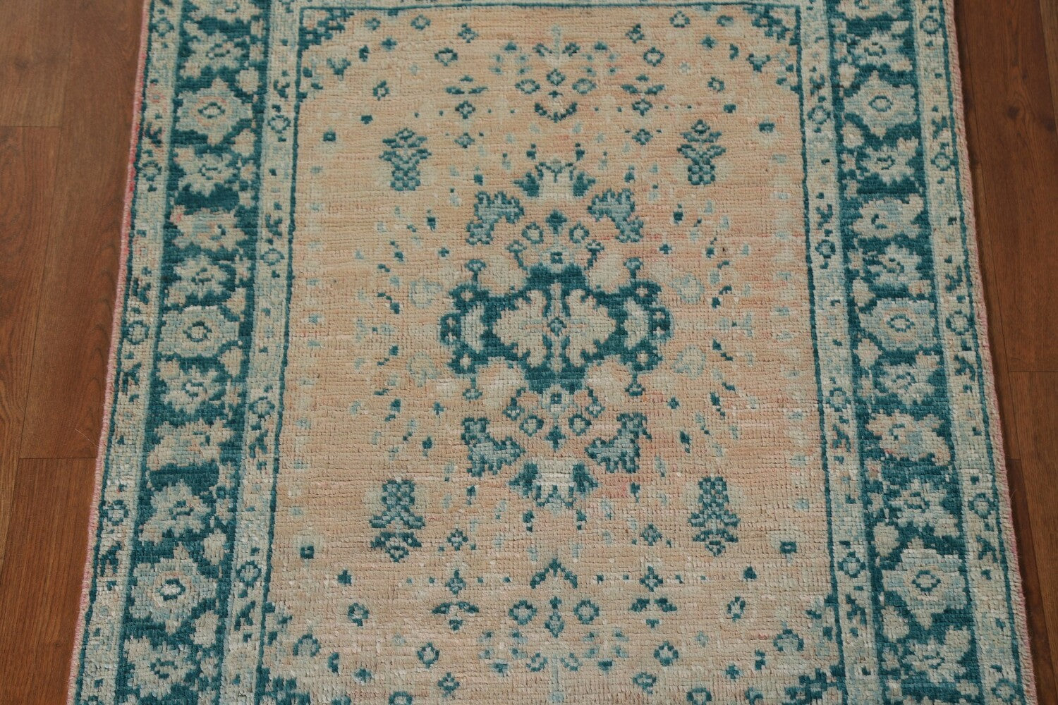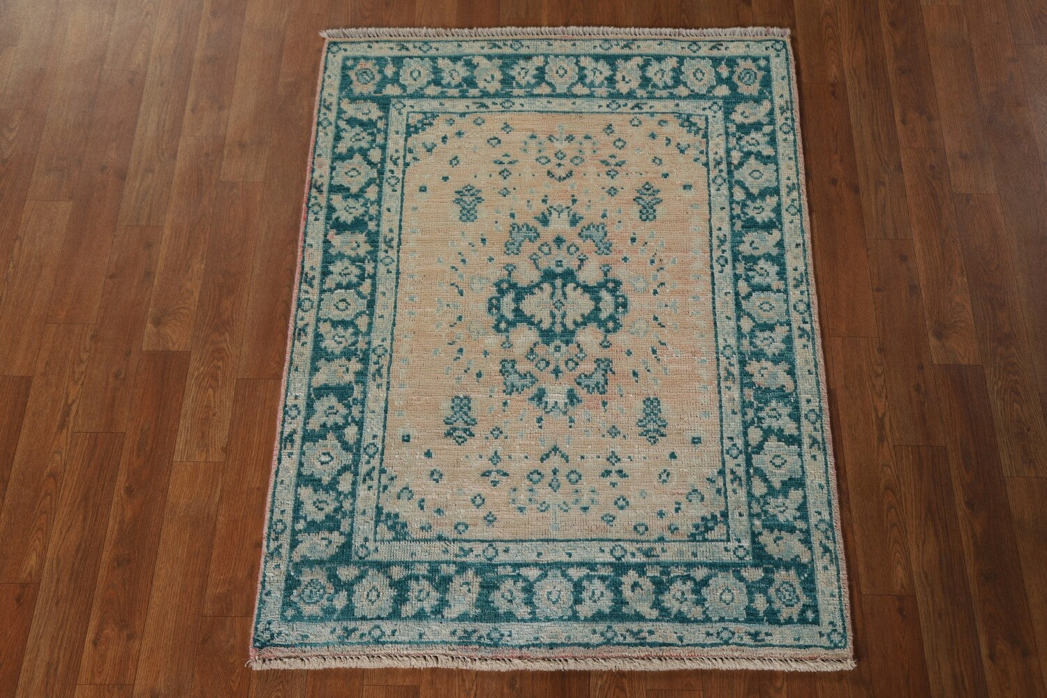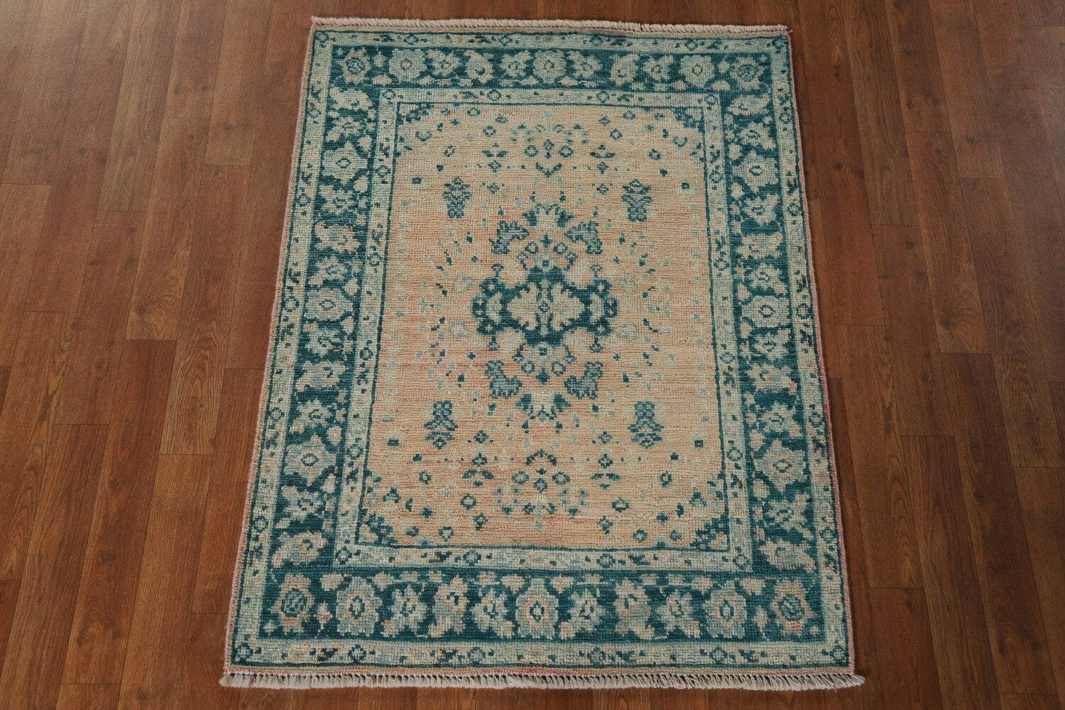 A Beautiful Genuine Turkey Oushak rug is Hand Knotted by skillful weavers in Turkey with 100% Wool Material. This rug is in New, First Quality condition. dimensions are 3' 11'' X 2' 11'' in foot and 119 X 89 in centimeter. the primary color is Peach.
