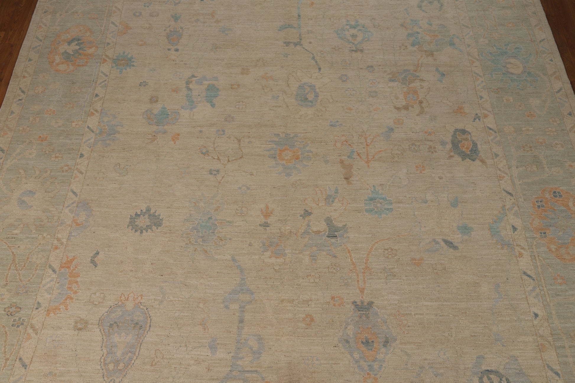 A Beautiful Genuine Turkey Oushak rug is Hand Knotted by skillful weavers in Turkey with 100% Wool Material. This rug is in New, First Quality condition. dimensions are 12' 6'' X 9' 6'' in foot and 381 X 290 in centimeter. the primary color is Beige & Ivories.