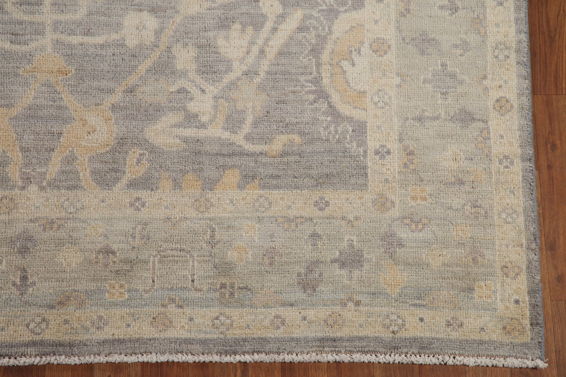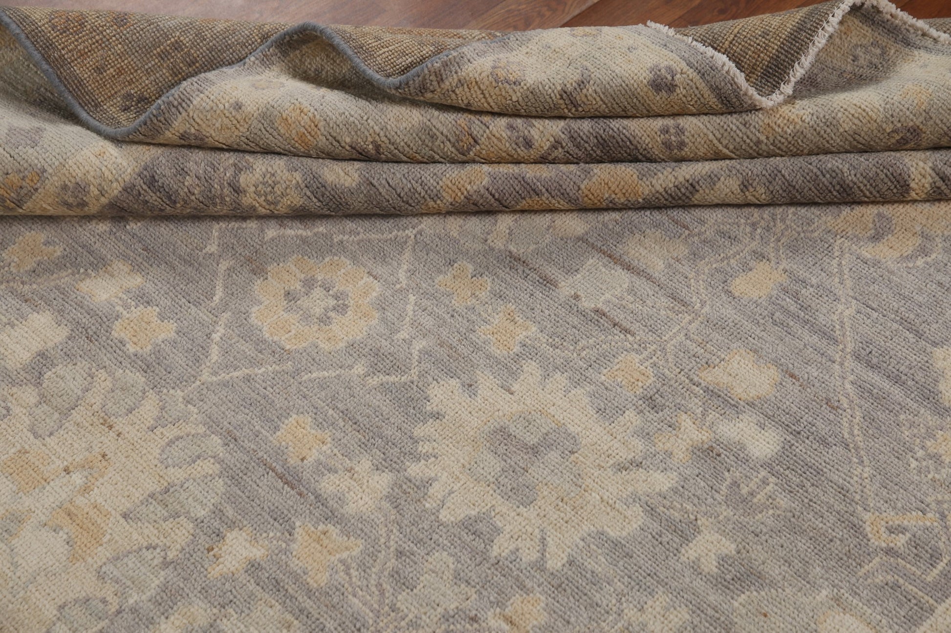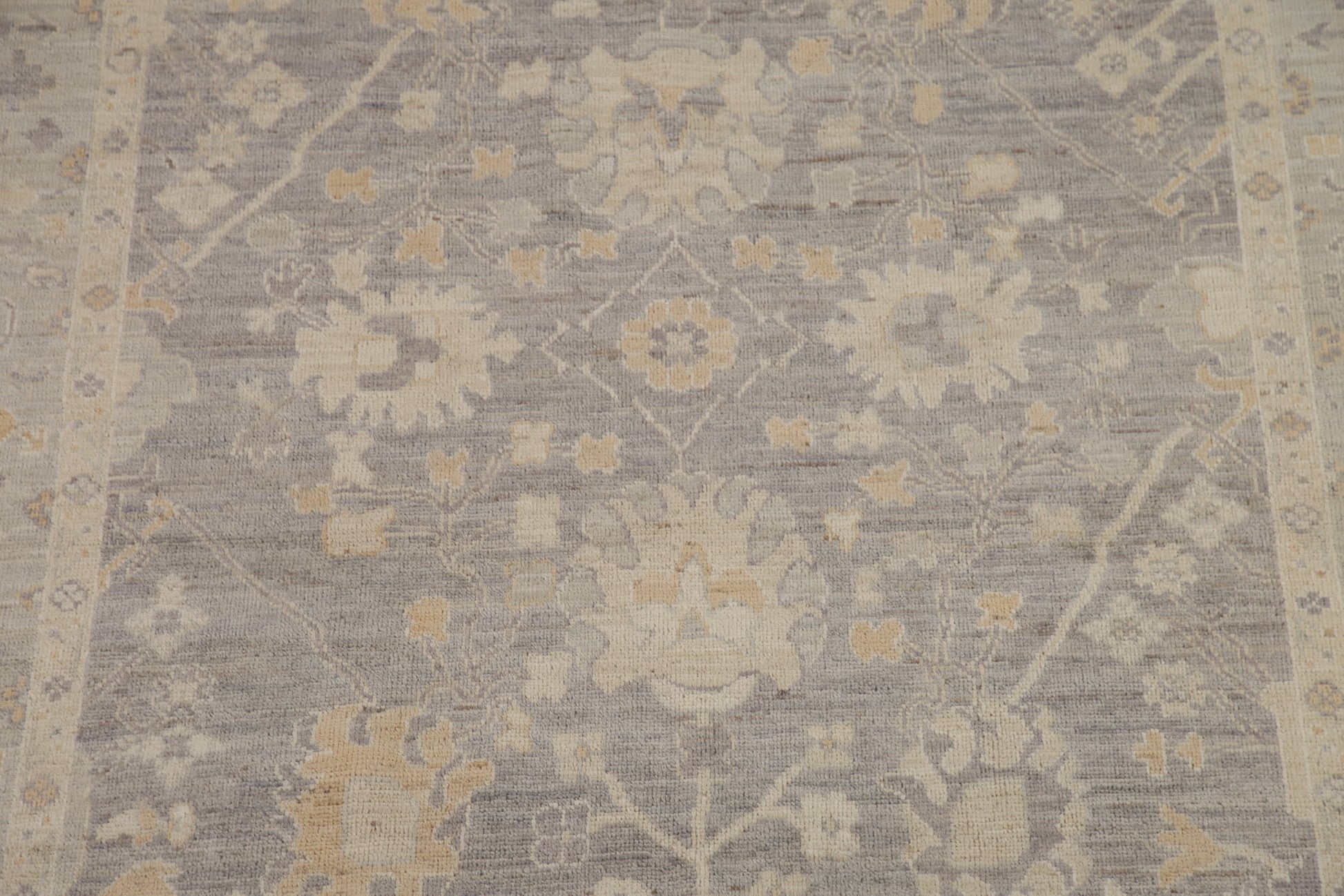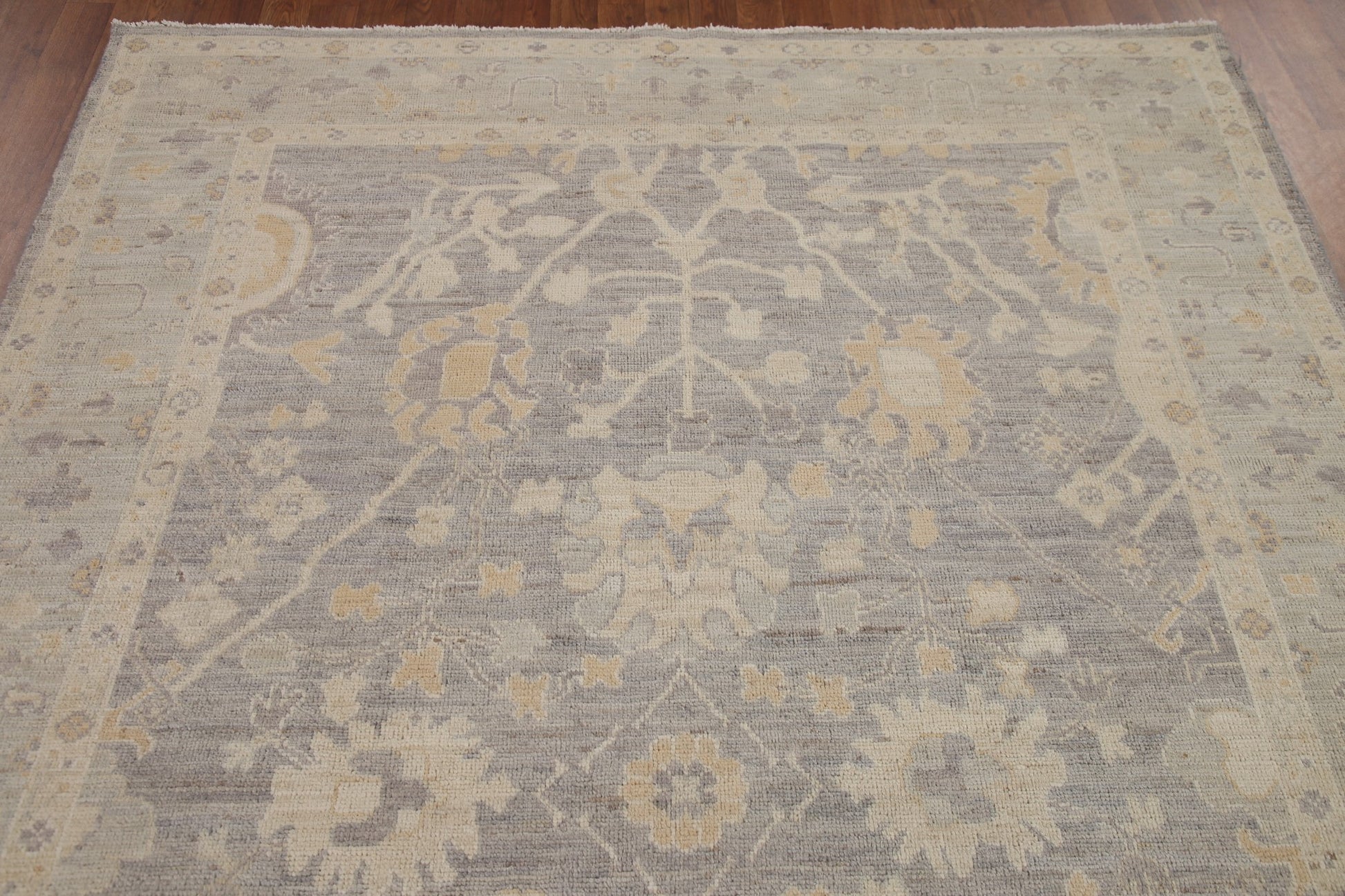 A Beautiful Genuine Turkey Oushak rug is Hand Knotted by skillful weavers in Turkey with 100% Wool Material. This rug is in New, First Quality condition. dimensions are 8' 10'' X 6' 0'' in foot and 269 X 183 in centimeter. the primary color is Greys & Charcoal.