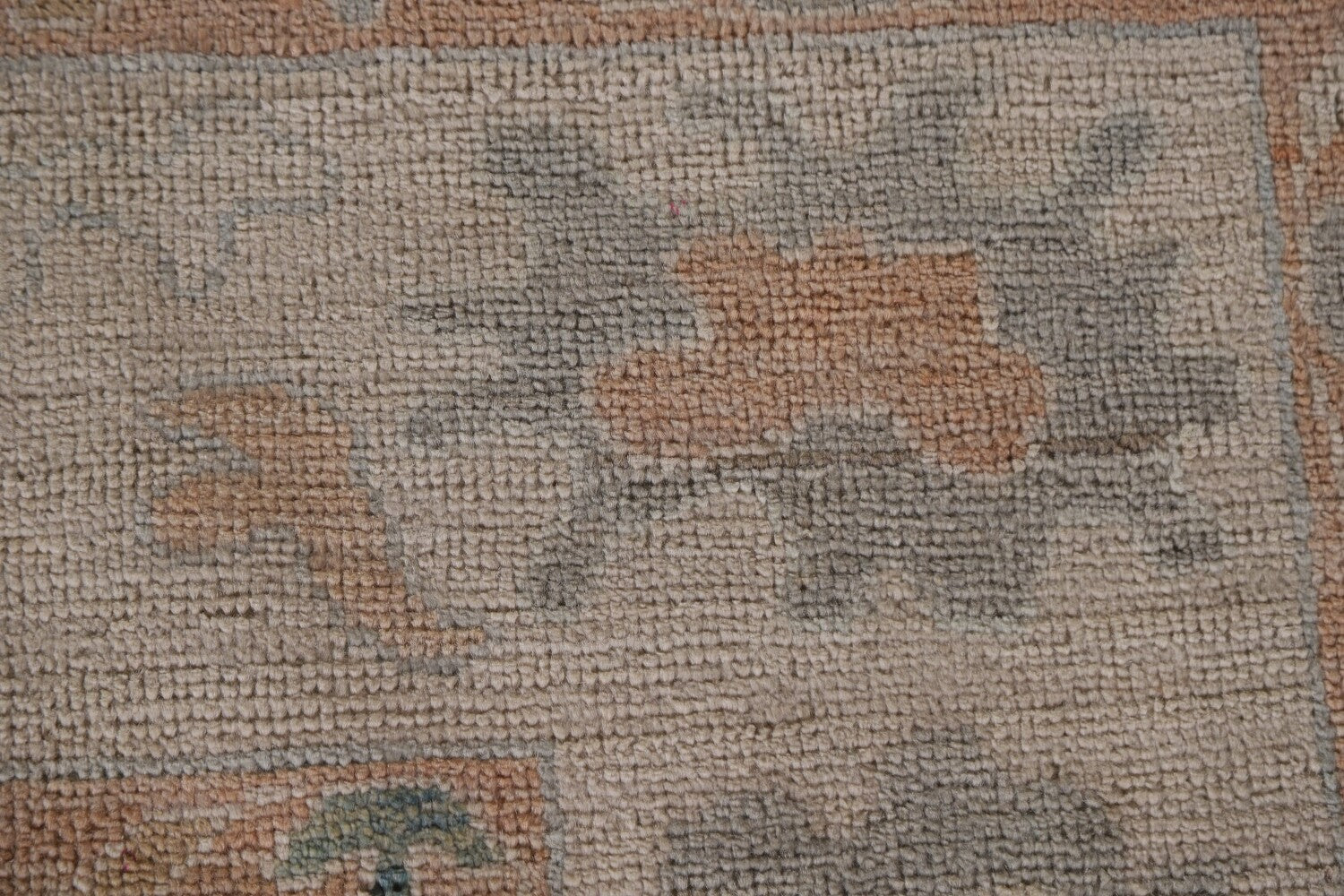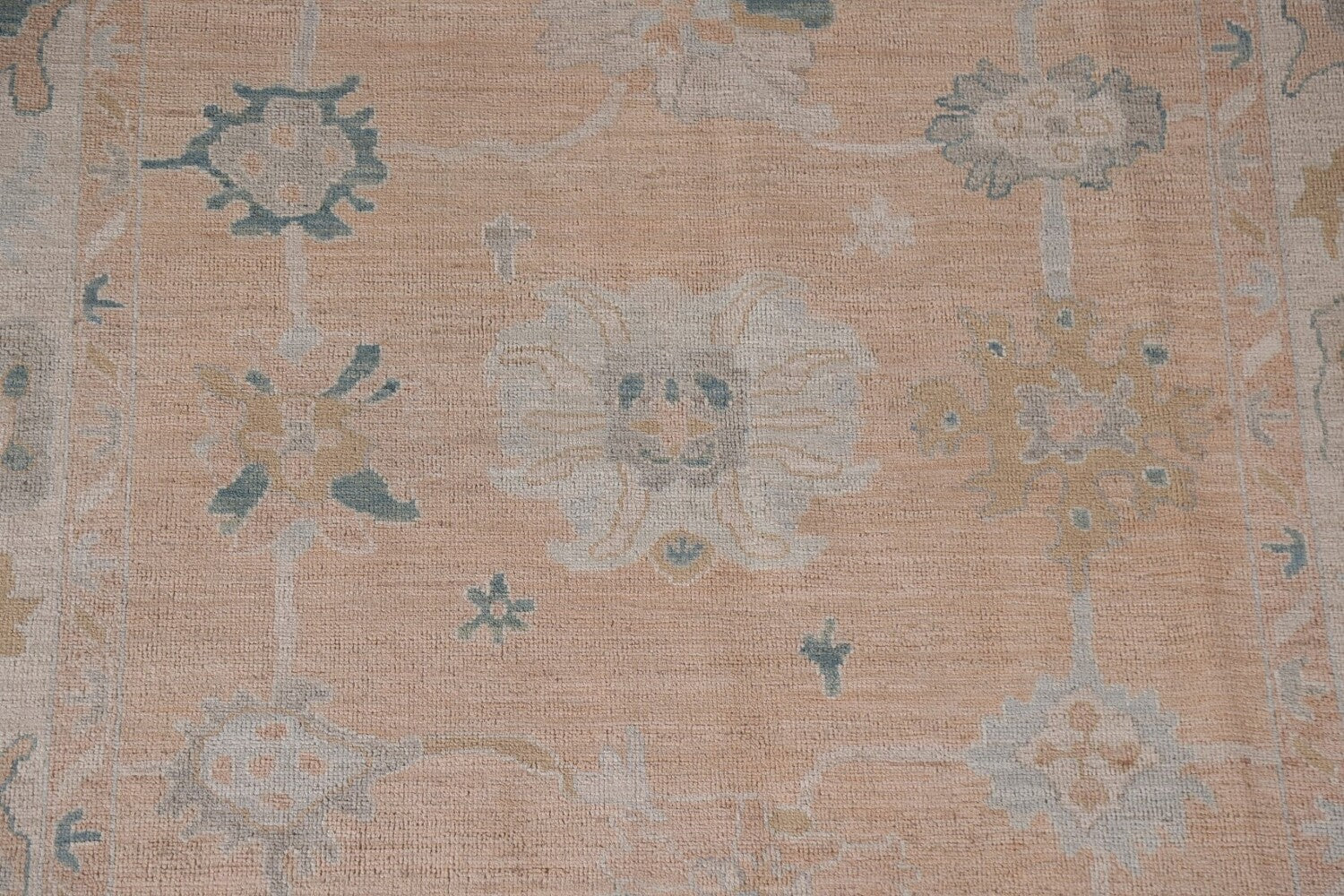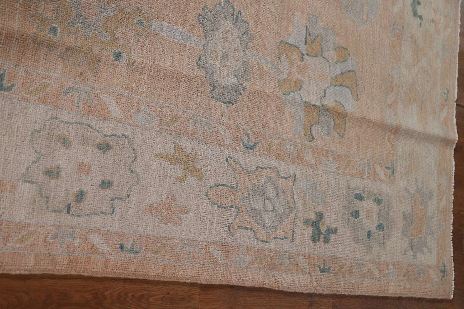 A Beautiful Genuine Turkey Oushak rug is Hand Knotted by skillful weavers in Turkey with 100% Wool Material. This rug is in New, First Quality condition. dimensions are 9' 0'' X 6' 4'' in foot and 274 X 193 in centimeter. the primary color is Peach.