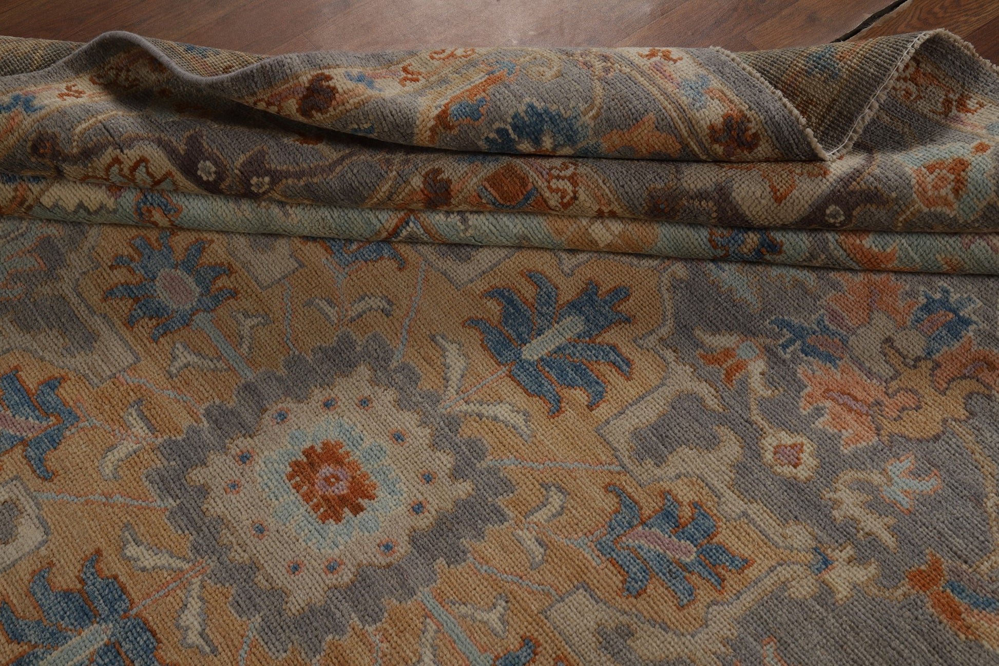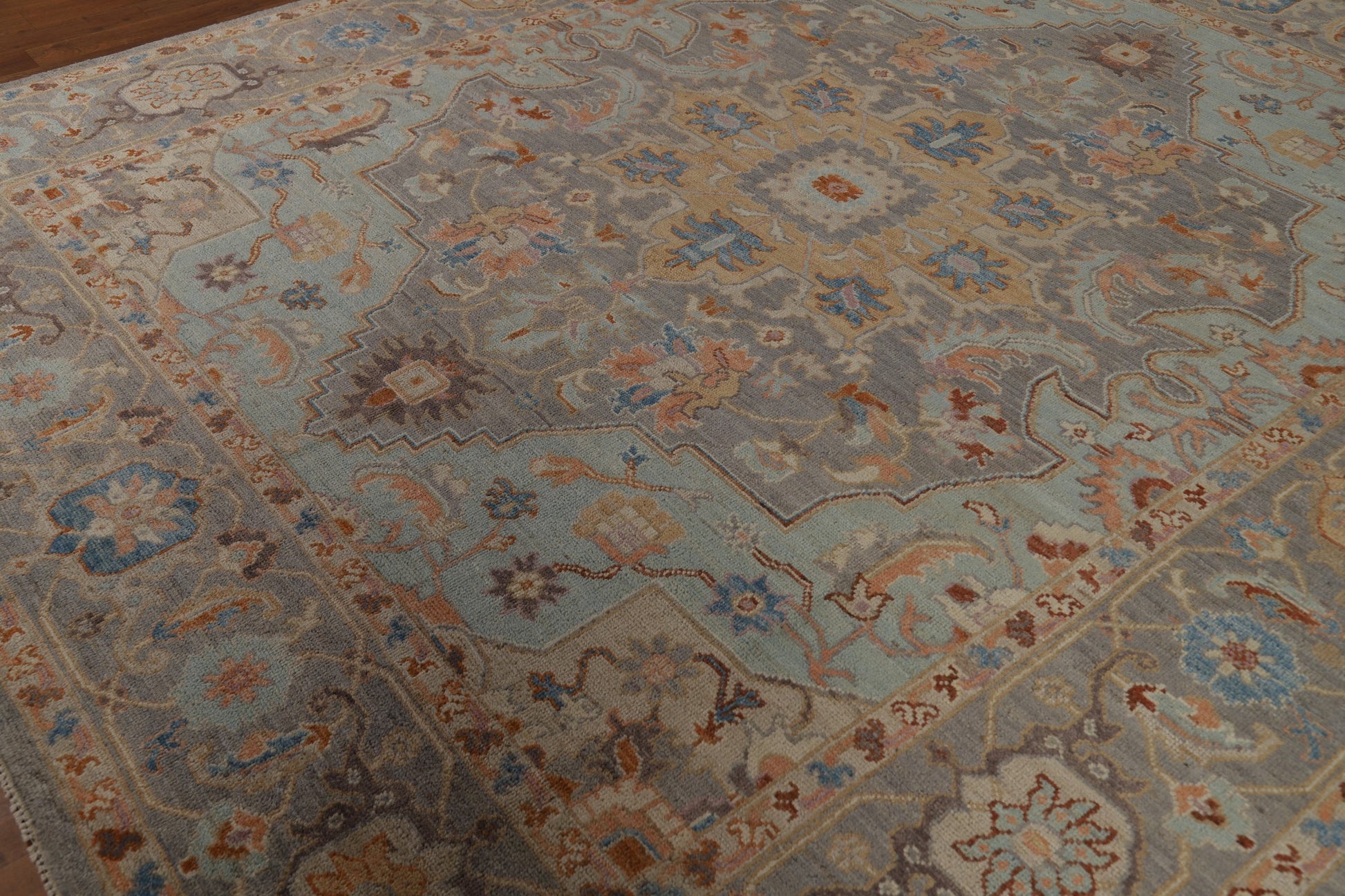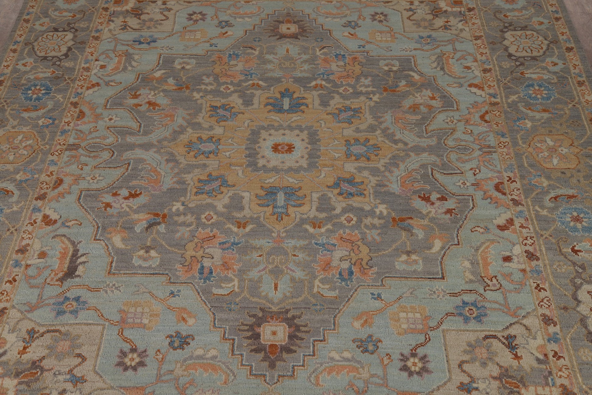 A Beautiful Genuine Turkey Oushak rug is Hand Knotted by skillful weavers in Turkey with 100% Wool Material. This rug is in New, First Quality condition. dimensions are 9' 8'' X 8' 2'' in foot and 295 X 249 in centimeter. the primary color is Greys & Charcoal.