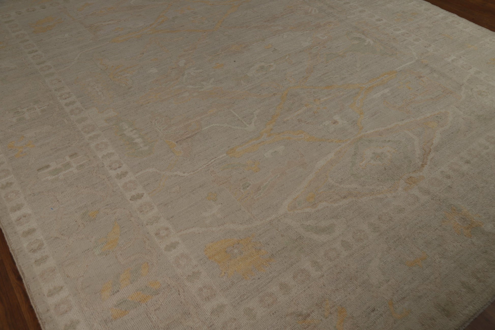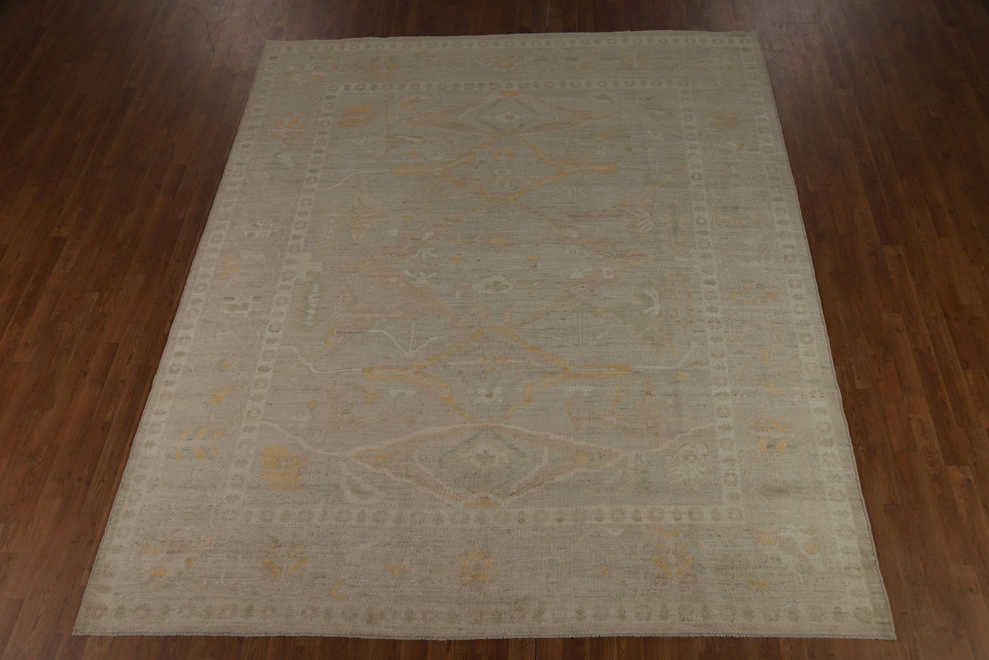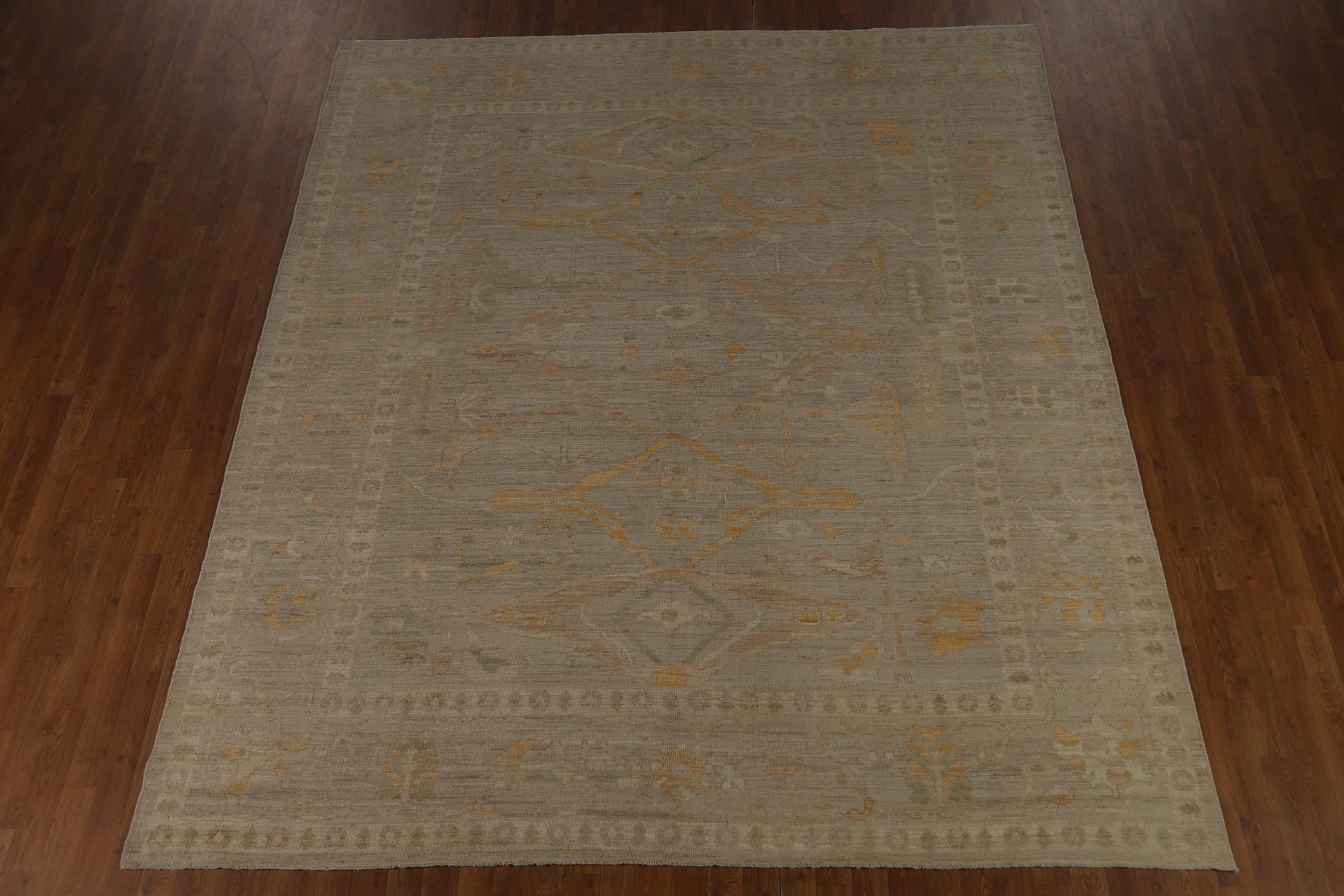 A Beautiful Genuine Turkey Oushak rug is Hand Knotted by skillful weavers in Turkey with 100% Wool Material. This rug is in New, First Quality condition. dimensions are 9' 10'' X 8' 5'' in foot and 300 X 257 in centimeter. the primary color is Beige & Ivories.