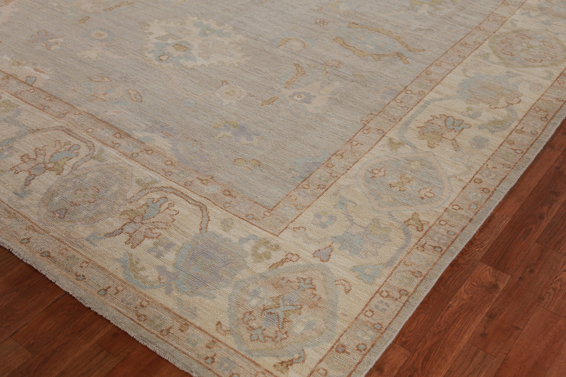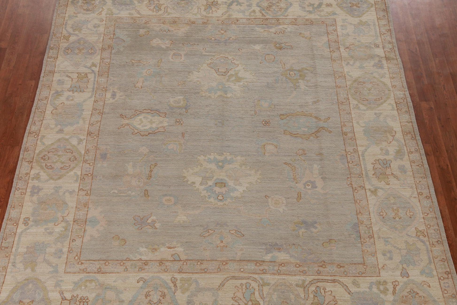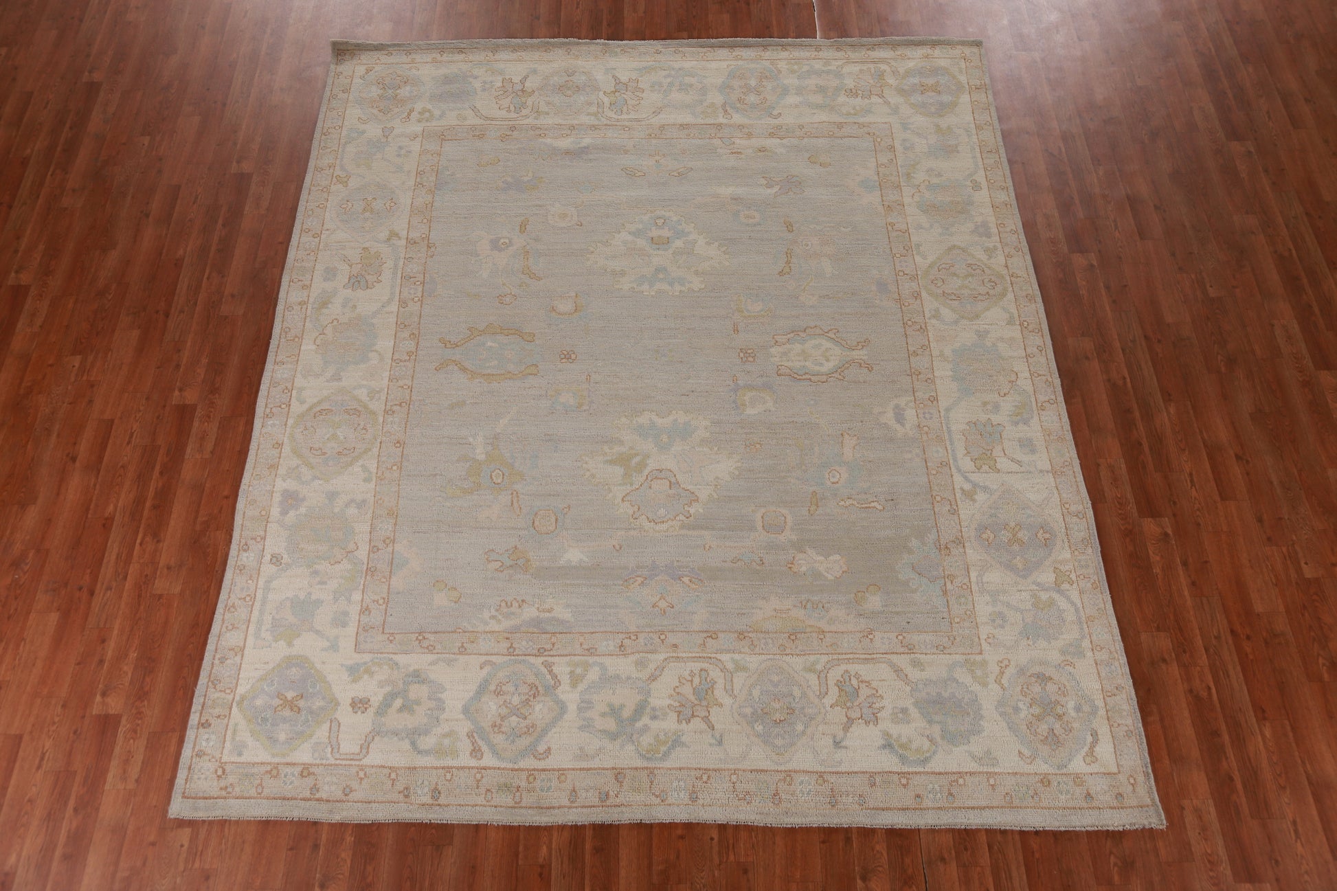 A Beautiful Genuine Turkey Oushak rug is Hand Knotted by skillful weavers in Turkey with 100% Wool Material. This rug is in New, First Quality condition. dimensions are 9' 7'' X 8' 3'' in foot and 292 X 251 in centimeter. the primary color is Greys & Charcoal.