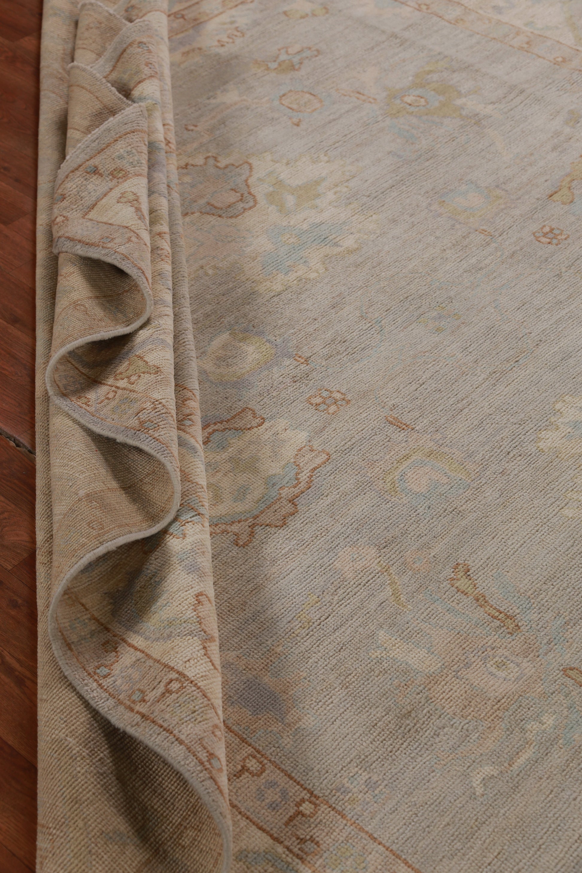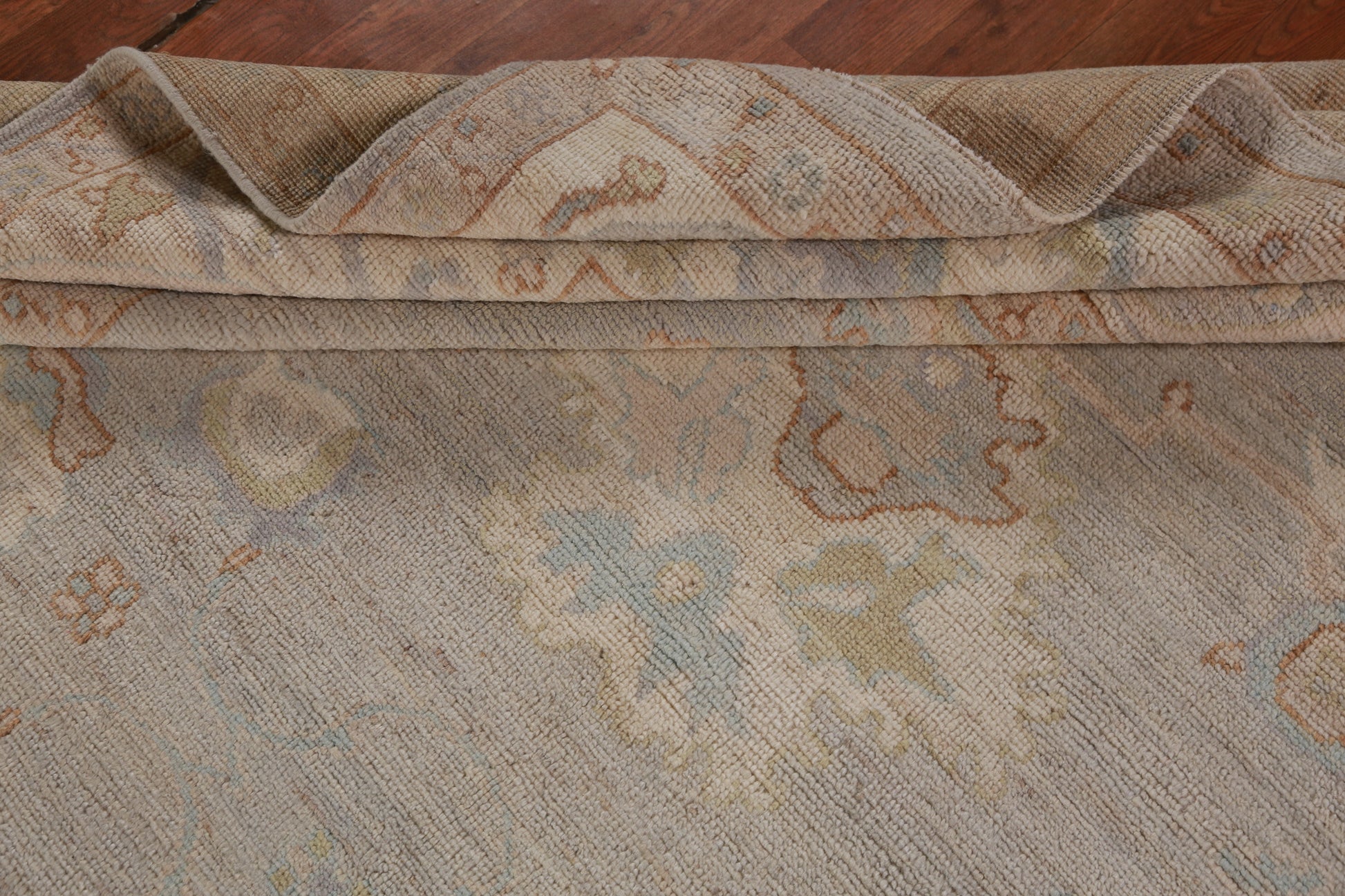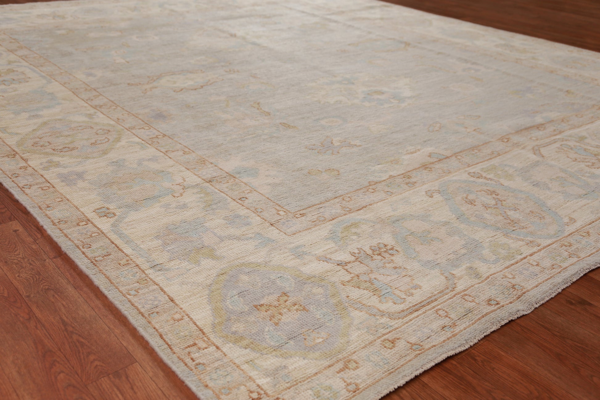 A Beautiful Genuine Turkey Oushak rug is Hand Knotted by skillful weavers in Turkey with 100% Wool Material. This rug is in New, First Quality condition. dimensions are 9' 7'' X 8' 3'' in foot and 292 X 251 in centimeter. the primary color is Greys & Charcoal.