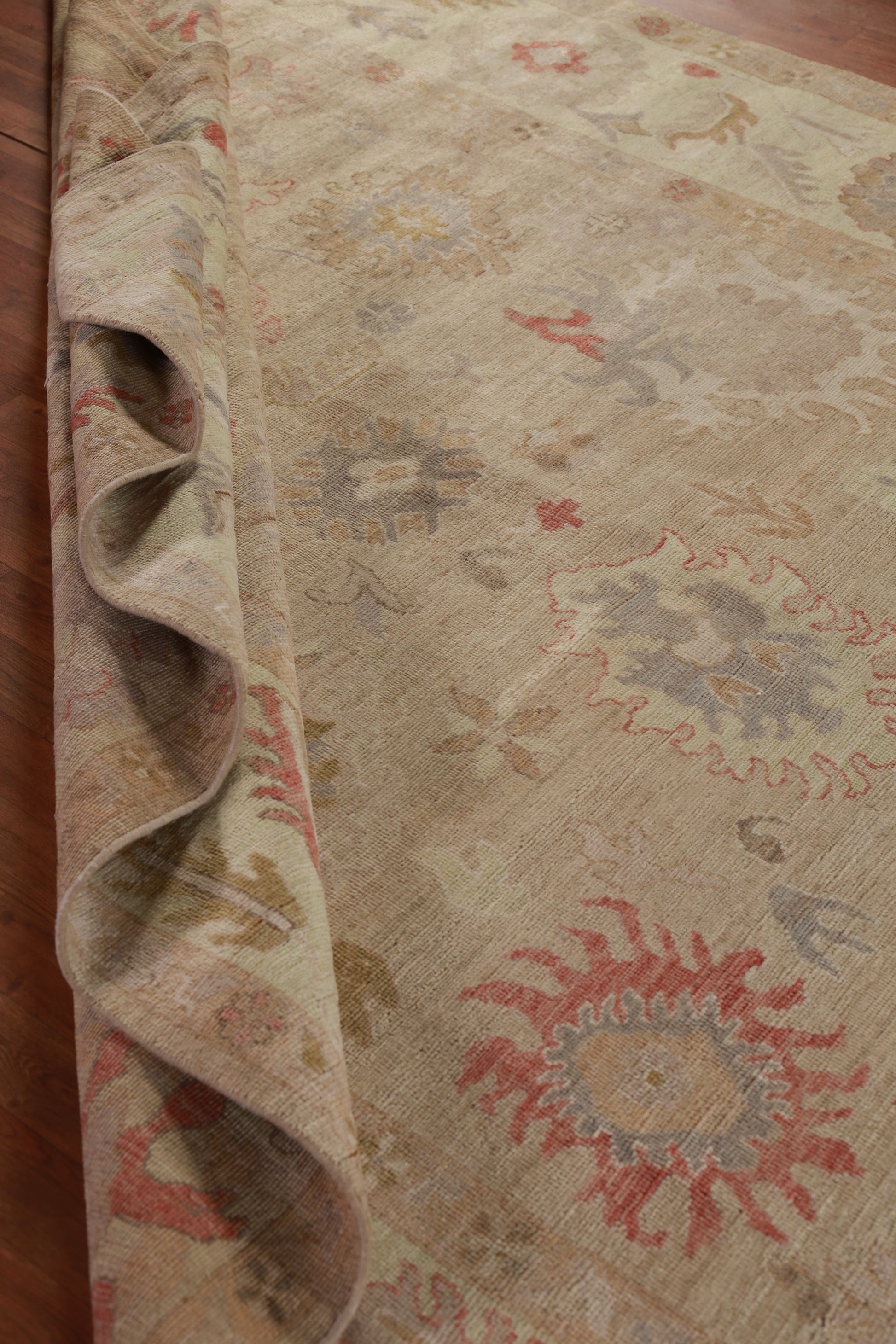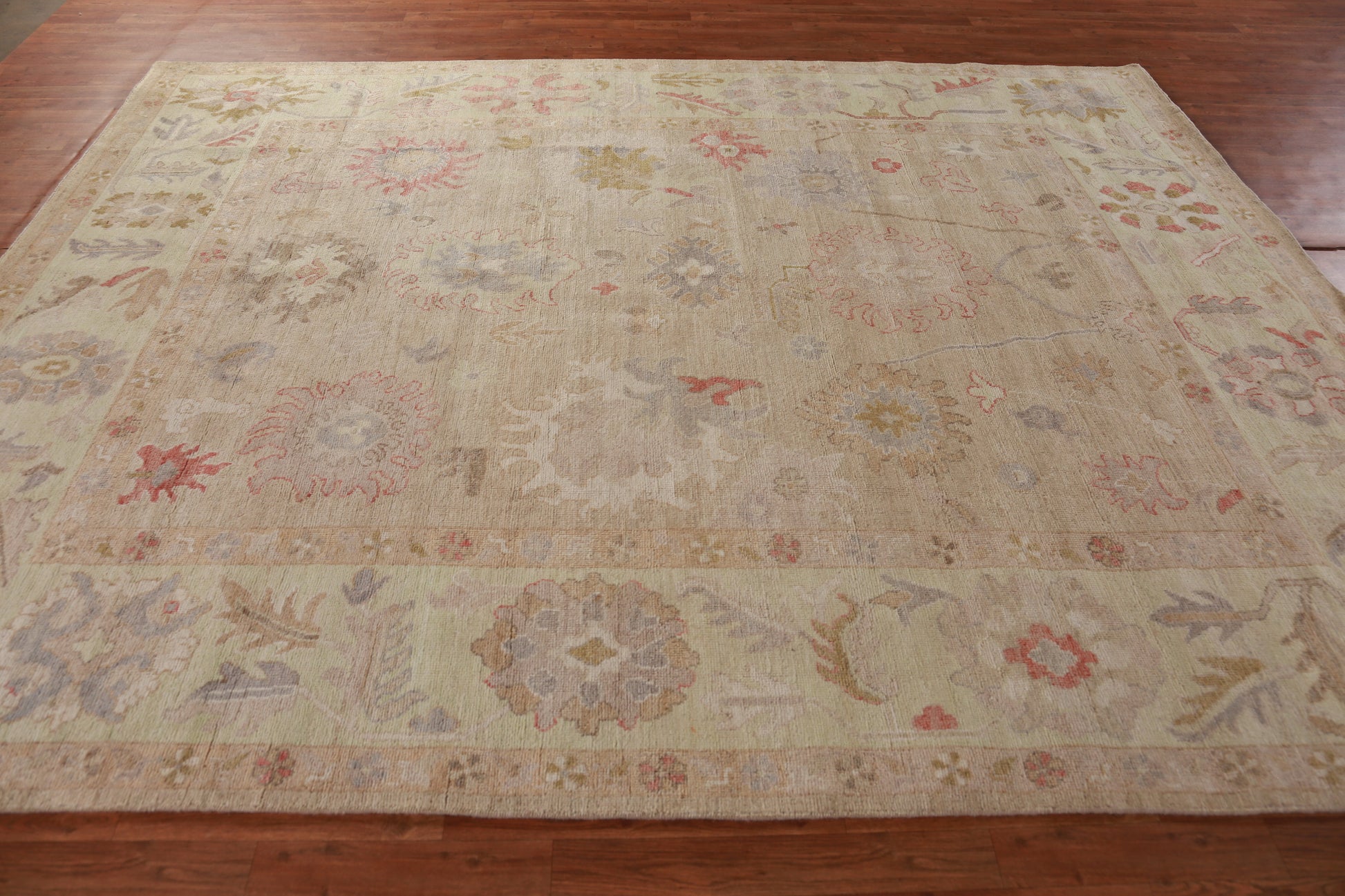 A Beautiful Genuine Turkey Oushak rug is Hand Knotted by skillful weavers in Turkey with 100% Wool Material. This rug is in New, First Quality condition. dimensions are 10' 5'' X 8' 3'' in foot and 318 X 251 in centimeter. the primary color is Beige & Ivories.