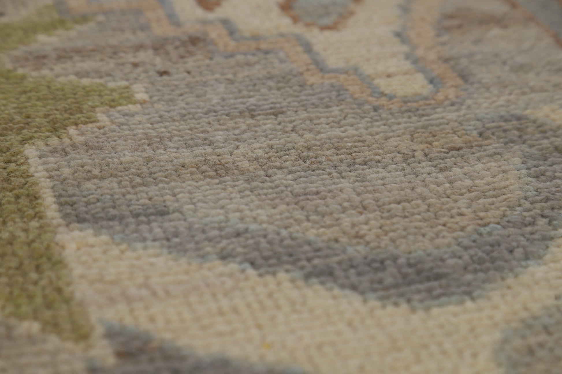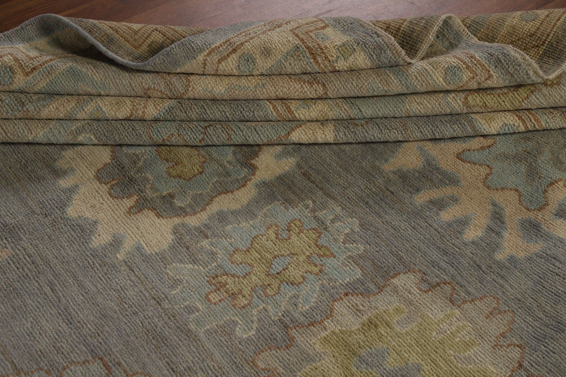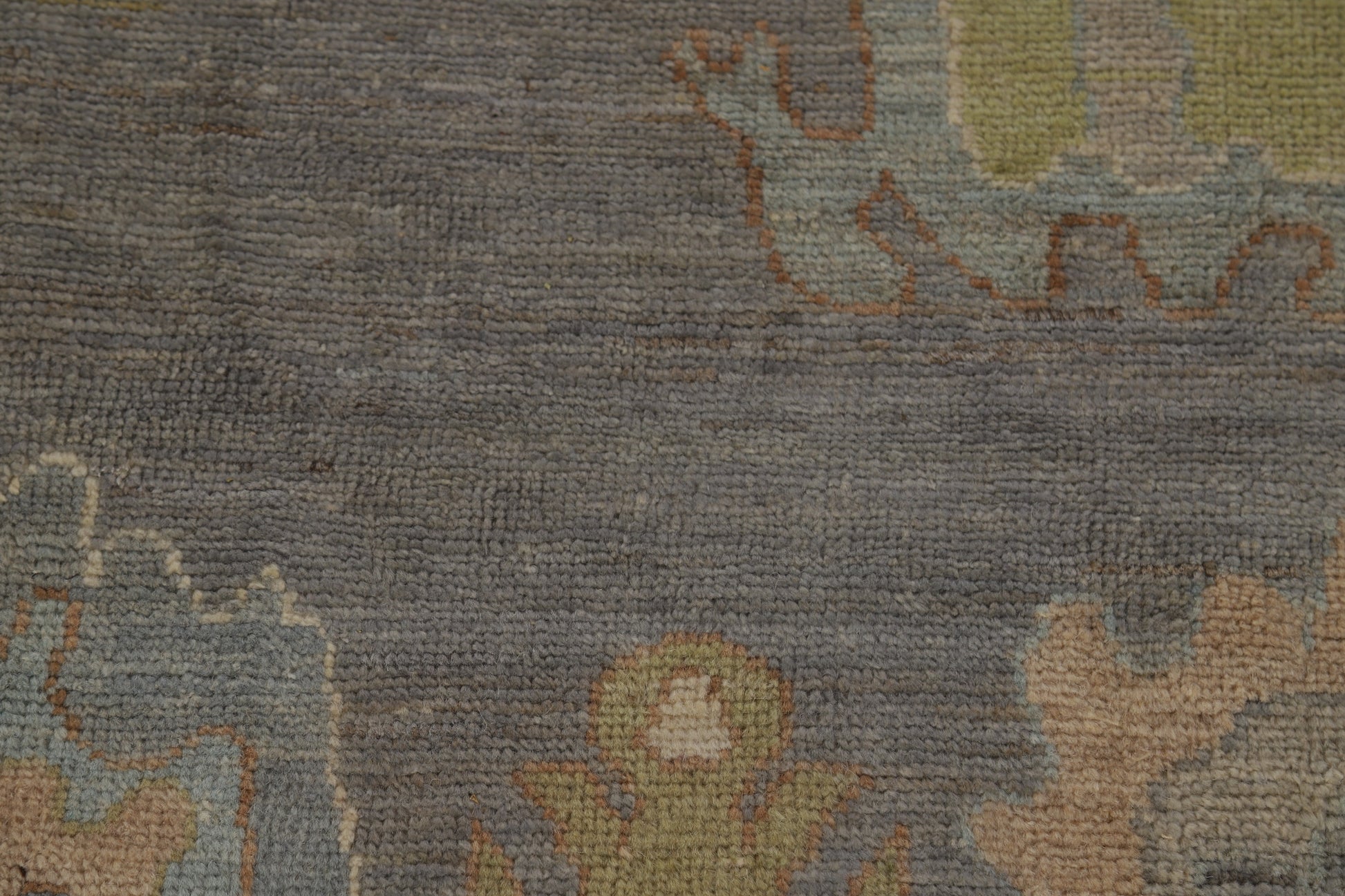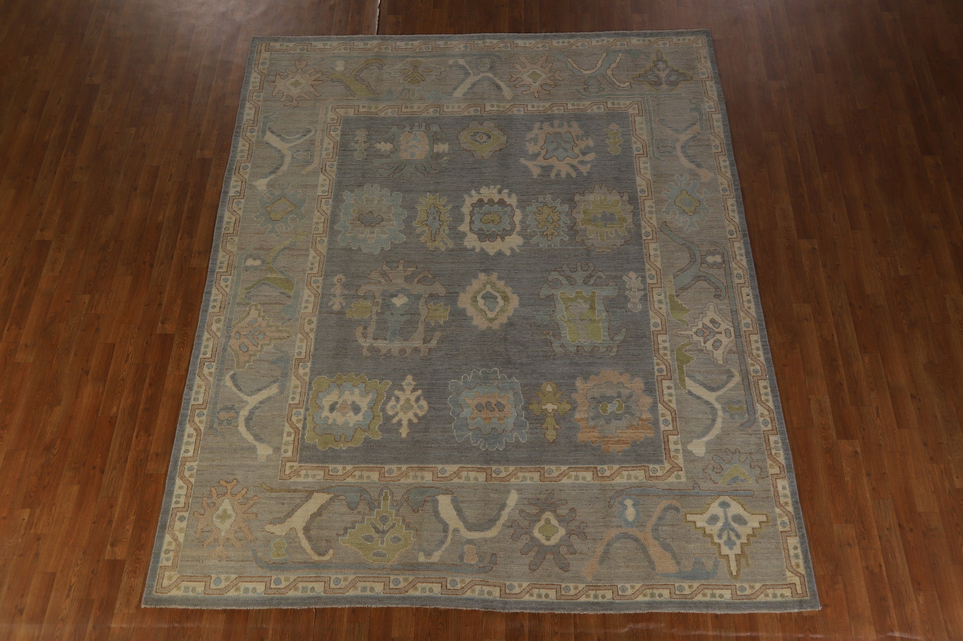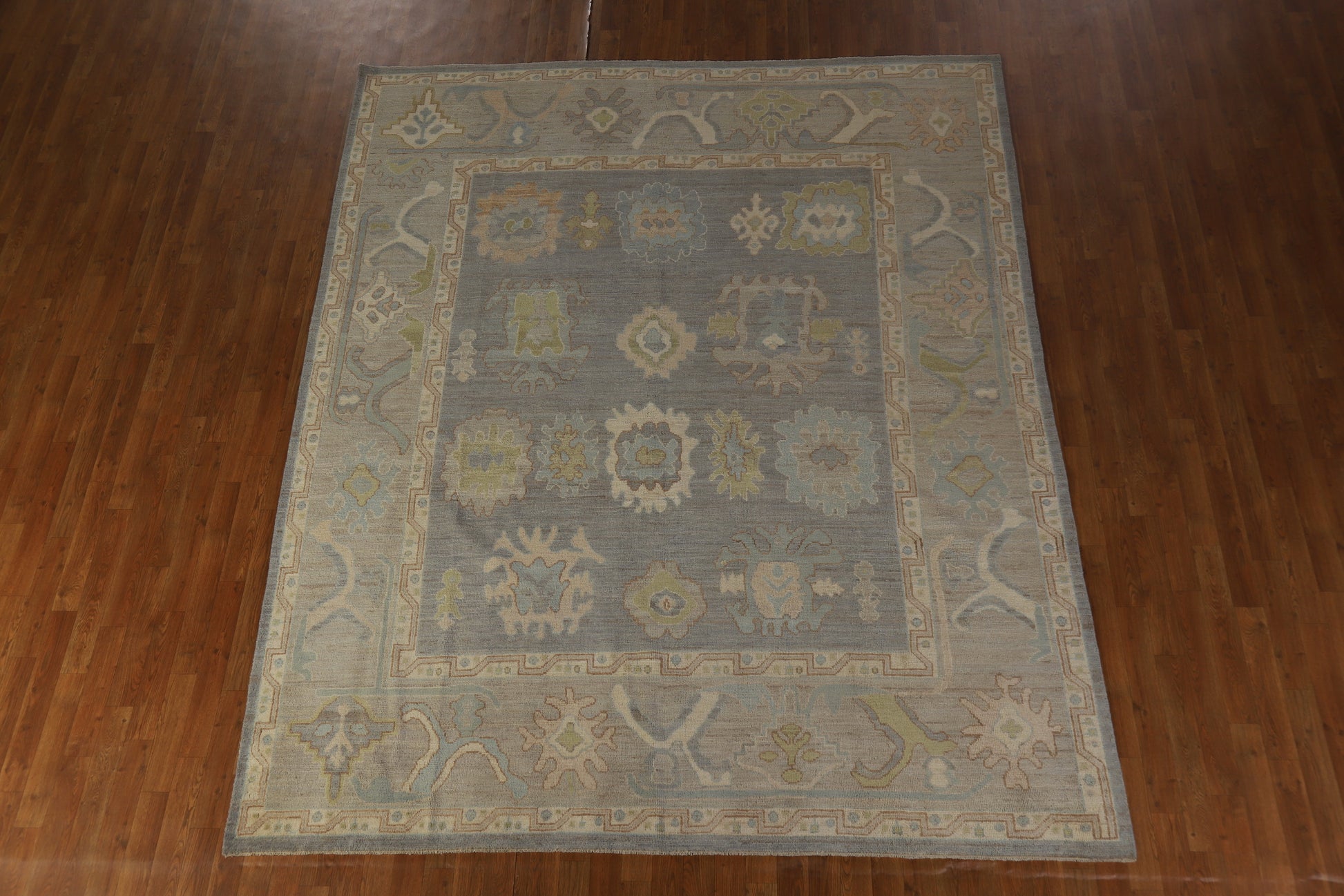 A Beautiful Genuine Turkey Oushak rug is Hand Knotted by skillful weavers in Turkey with 100% Wool Material. This rug is in New, First Quality condition. dimensions are 9' 11'' X 8' 1'' in foot and 302 X 246 in centimeter. the primary color is Greys & Charcoal.