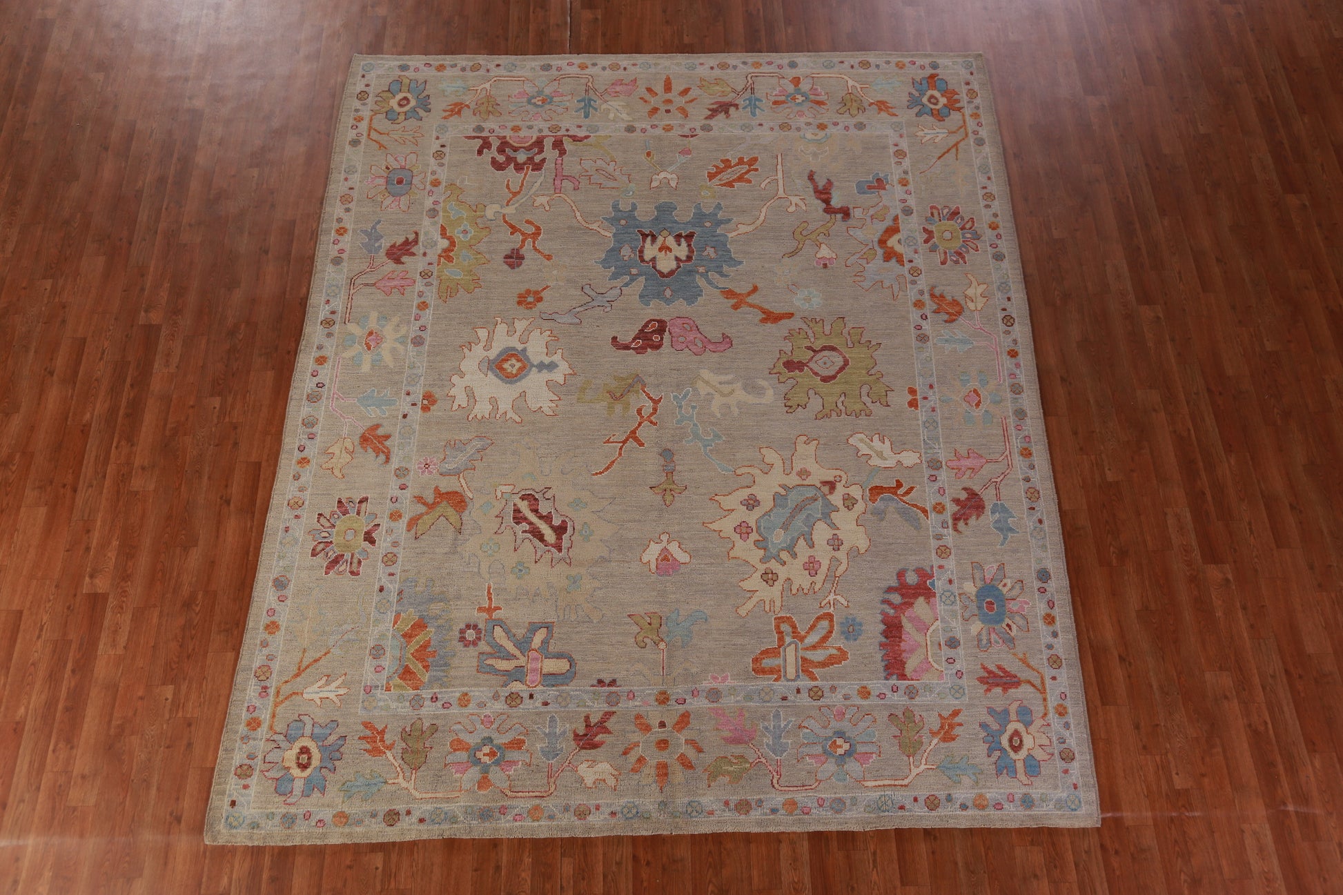 A Beautiful Genuine Turkey Oushak rug is Hand Knotted by skillful weavers in Turkey with 100% Wool Material. This rug is in New, First Quality condition. dimensions are 9' 10'' X 8' 5'' in foot and 300 X 257 in centimeter. the primary color is Beige & Ivories.
